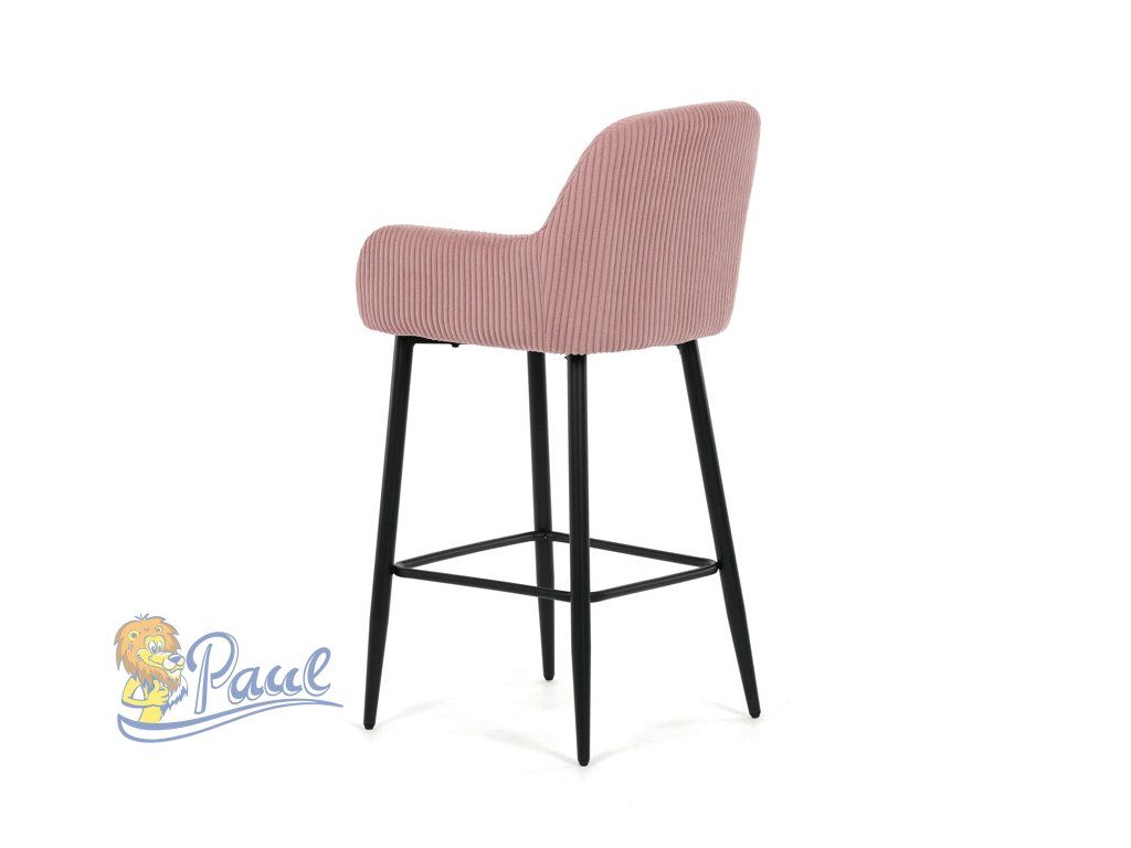 Barová židle s područkami v růžovém manšestrovém potahu kombinuje pohodlí s moderním designem. Sedák a opěradlo jsou čalouněné měkkou manšestrovou látkou, která nabízí příjemnou texturu a snadnou údržbu. Pevné černé kovové nohy zajišťují stabilitu a dlouhou životnost, přičemž spodní příčná výztuha slouží zároveň jako praktická opěrka nohou. Židle není otočná, což podtrhuje její jednoduchý a elegantní vzhled vhodný do barových prostor i kuchyňských koutů. Díky ergonomicky tvarovaným područkám poskytuje dostatečnou oporu pro ruce během posezení.Doplňkové parametry