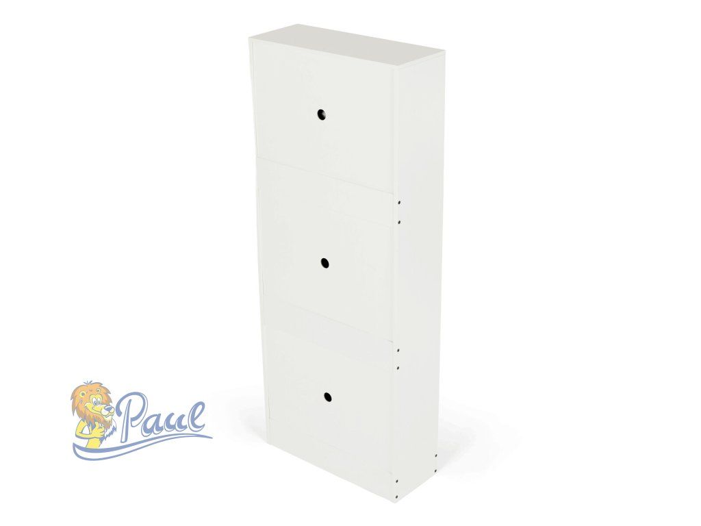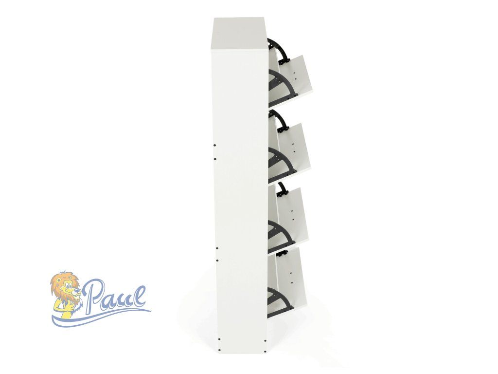 Botník se čtyřmi přihrádkami je vyroben z MDF desek v bílé barvě, která snadno zapadne do různých interiérů. Každá přihrádka je vybavena černými úchyty a otevírá se směrem ven, což umožňuje přehledné a praktické uskladnění obuvi. Pevné panty zajišťují stabilní a tiché otevírání, zatímco kompaktní rozměry šetří místo v předsíni nebo chodbě. Povrchová úprava MDF desek je hladká a snadno se udržuje, což přispívá k dlouhé životnosti botníku. Celkový design kombinuje funkčnost s jednoduchým moderním vzhledem vhodným pro každodenní použití.Doplňkové parametry