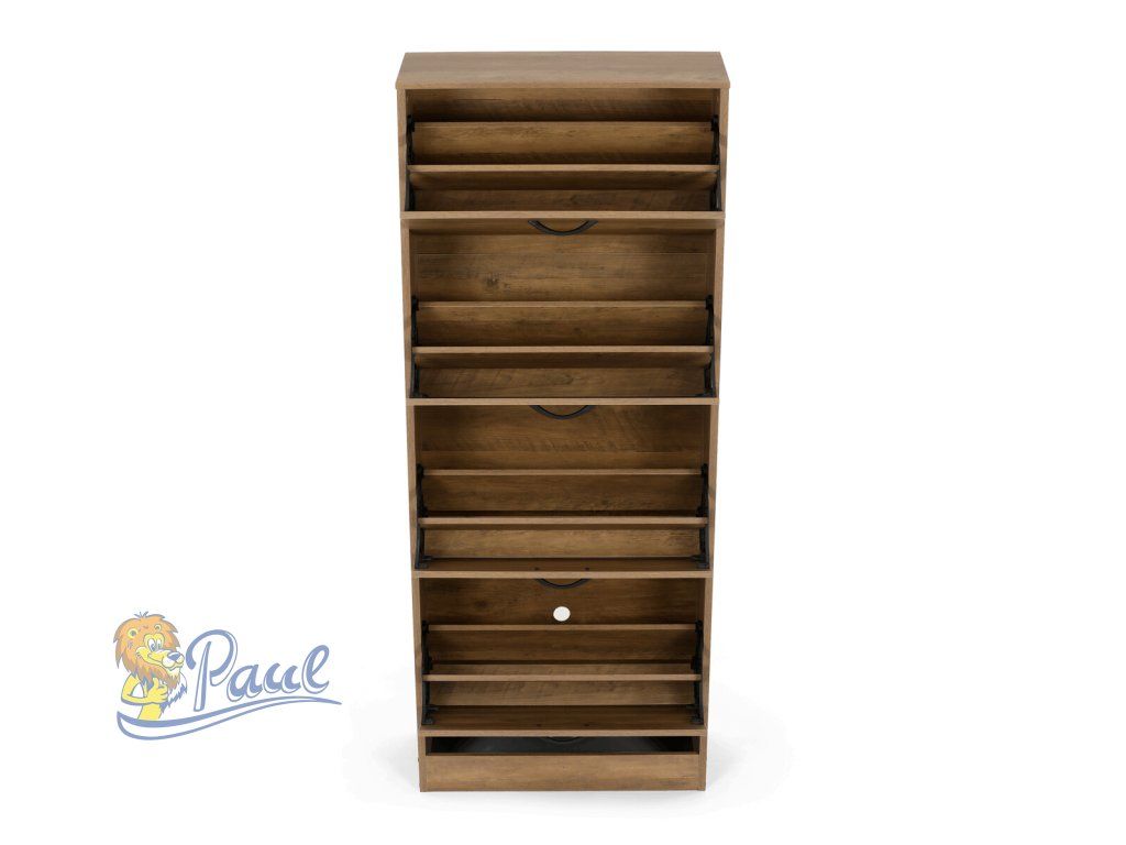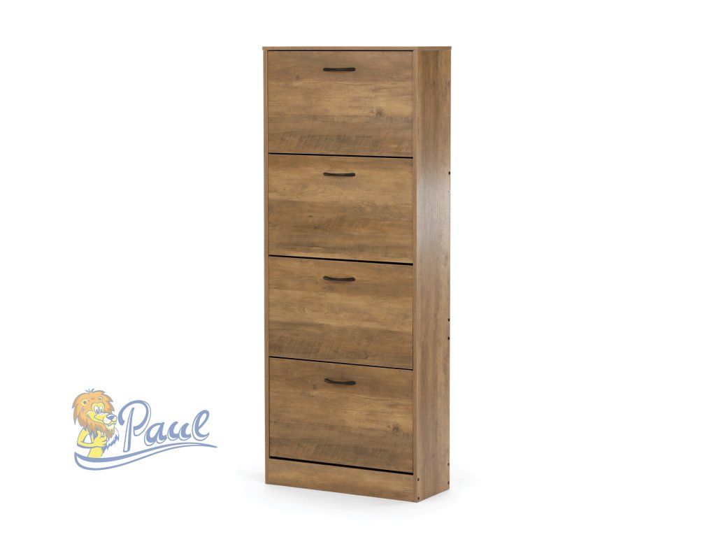 Botník se čtyřmi přihrádkami je vyroben z MDF desek v dekoru jilm, který přináší do interiéru přírodní hřejivý odstín hnědé barvy s výraznou strukturou dřeva. Každá přihrádka nabízí dostatek úložného prostoru pro uspořádání obuvi, přičemž přední dvířka jsou opatřena praktickými úchytkami pro snadné otevírání. Povrchová úprava MDF zajišťuje snadnou údržbu a odolnost proti běžnému opotřebení. Kompaktní a stabilní provedení botníku umožňuje jeho umístění i do menších prostor, kde efektivně využije dostupné místo. Rozměry a pevná konstrukce podporují dlouhodobé používání a pořádek v domácnosti.Doplňkové parametry