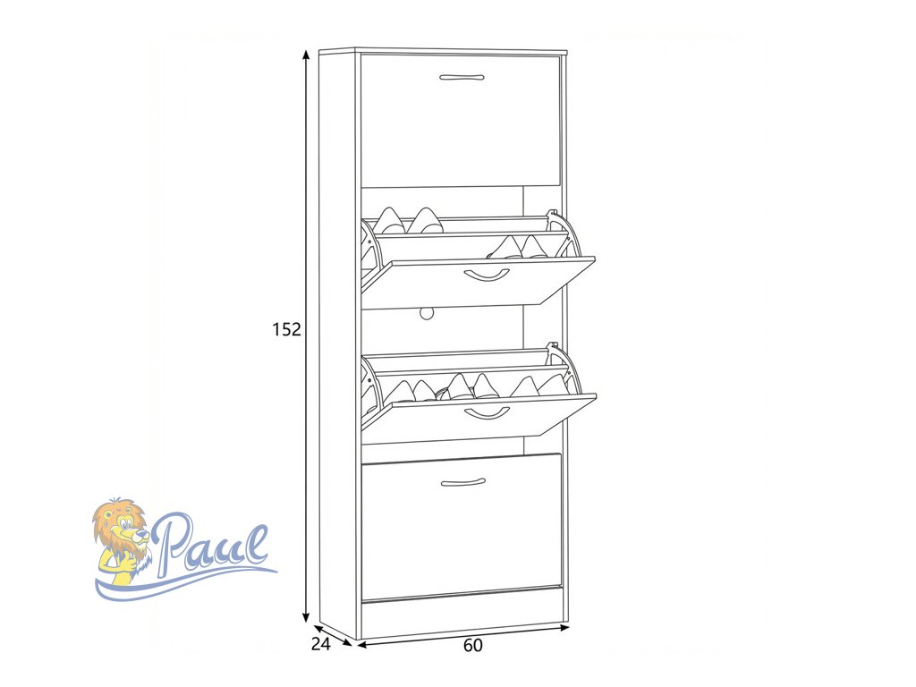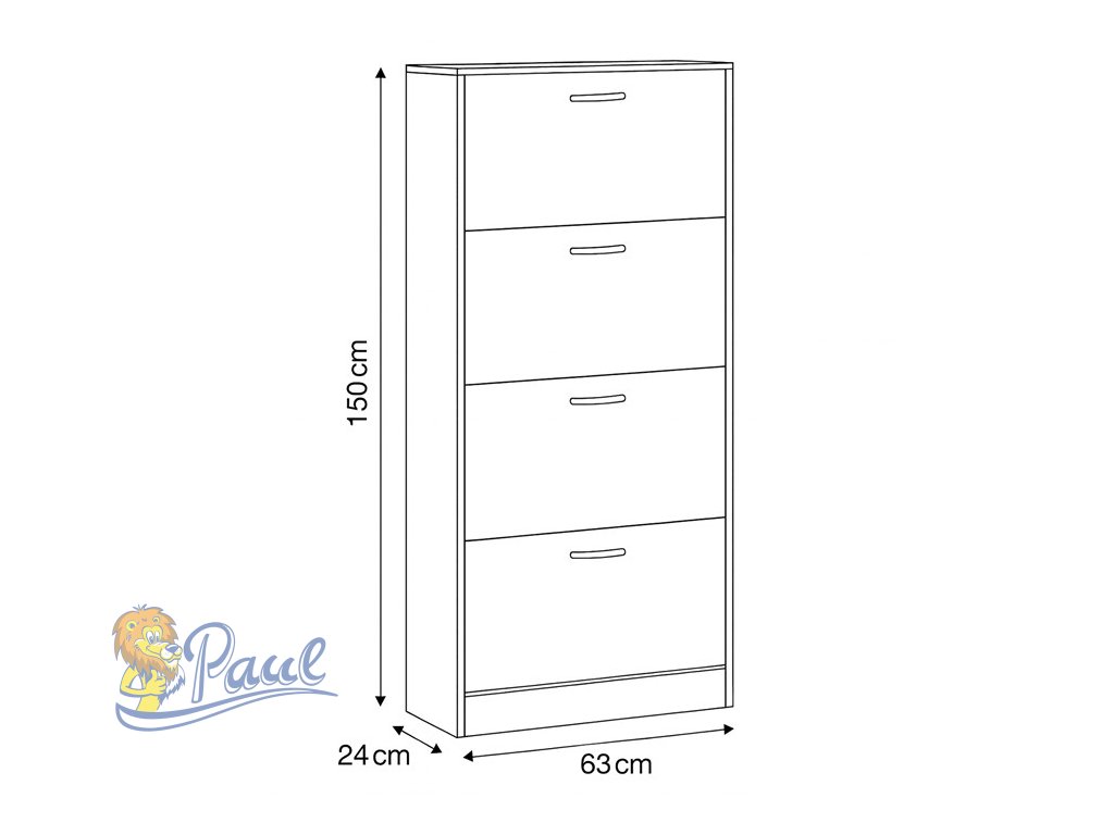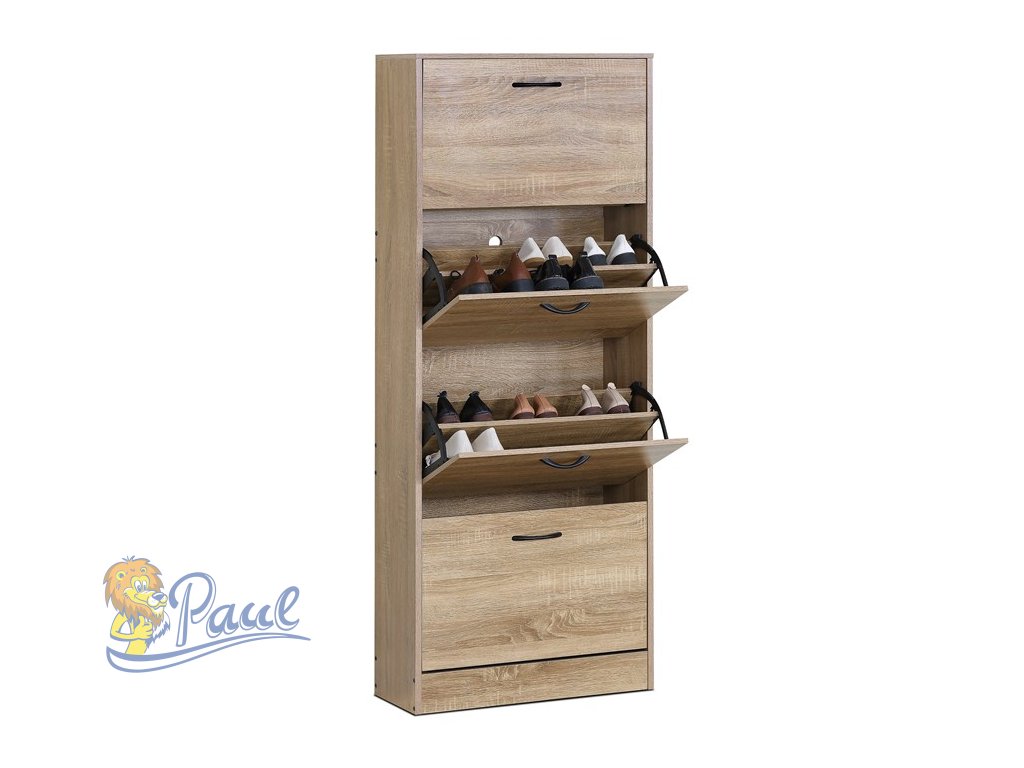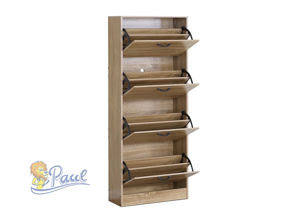 Botník s čtyřmi samostatnými přihrádkami nabízí praktické řešení pro uspořádání obuvi v předsíni či chodbě. Vyroben je z MDF desek s dekorativní povrchovou úpravou v odstínu dub, která napodobuje strukturu dřeva a snadno se udržuje. Každá přihrádka je vybavena černou úzkou úchytkou pro pohodlné otevírání. Kompaktní tvar a vertikální uspořádání šetří místo a zároveň poskytuje dostatek úložného prostoru. Botník je stabilní a navržený pro dlouhou životnost v domácím prostředí.Doplňkové parametry
