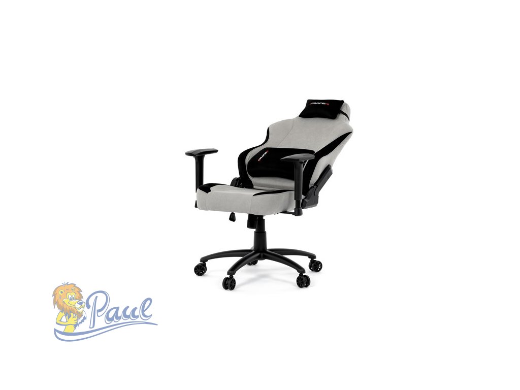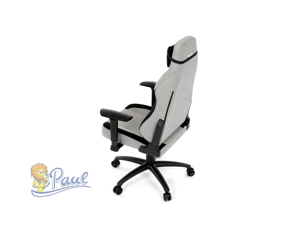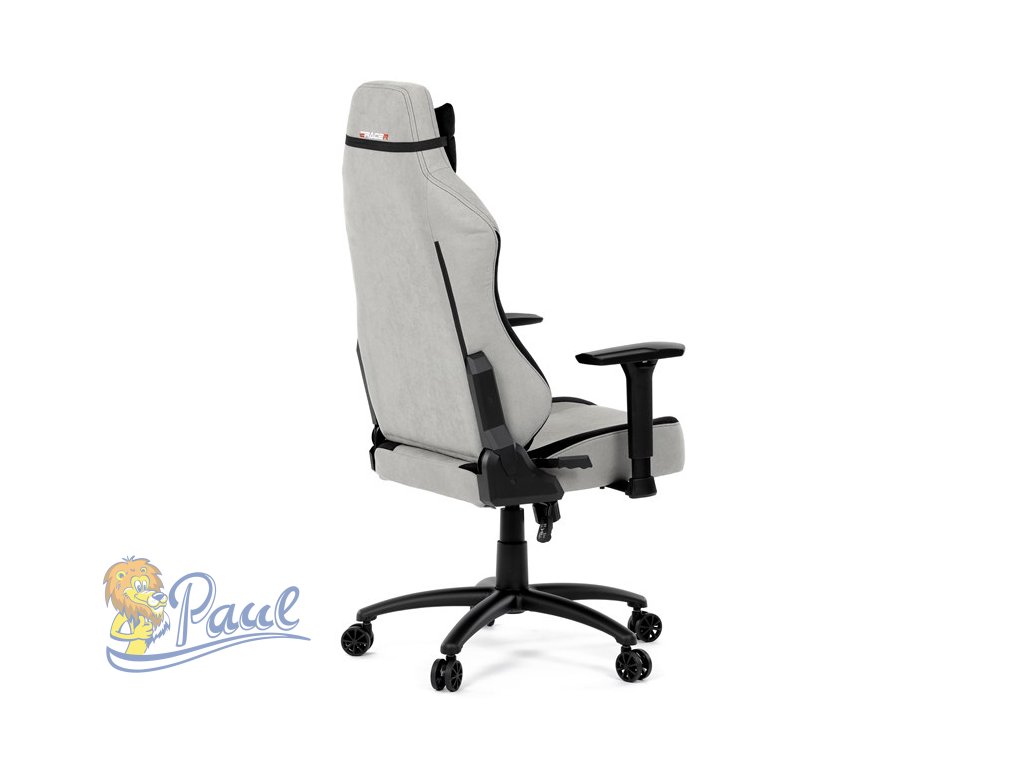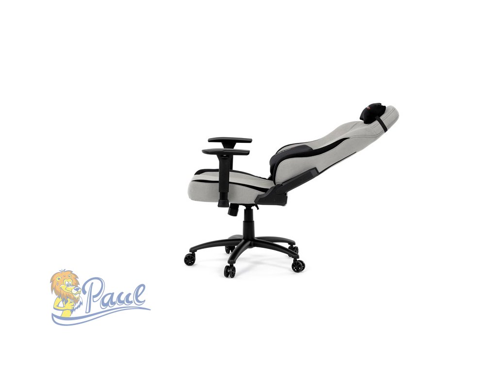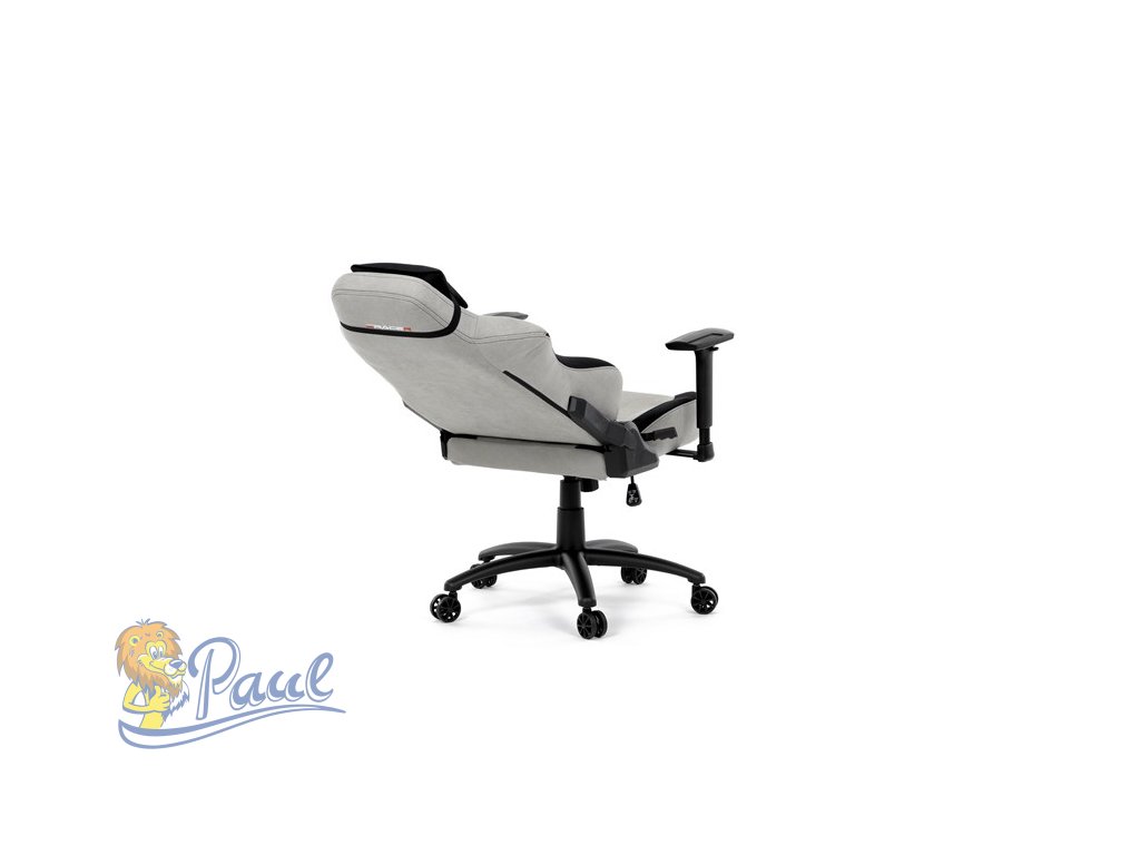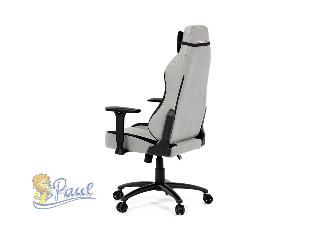 Herní křeslo, stříbrná látka, houpací mechanismus, polohování opěradla 90°-180°, 3D područky, polštáře z paměťové pěny,