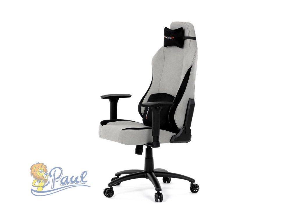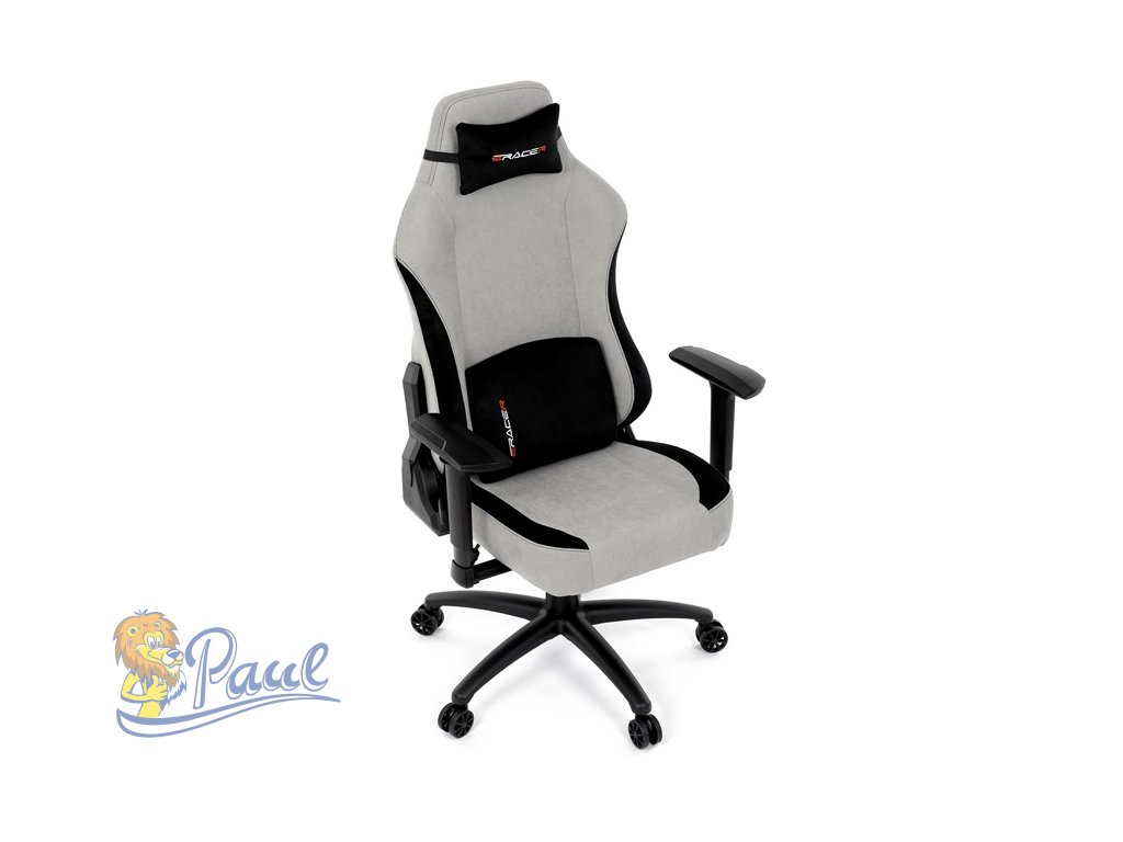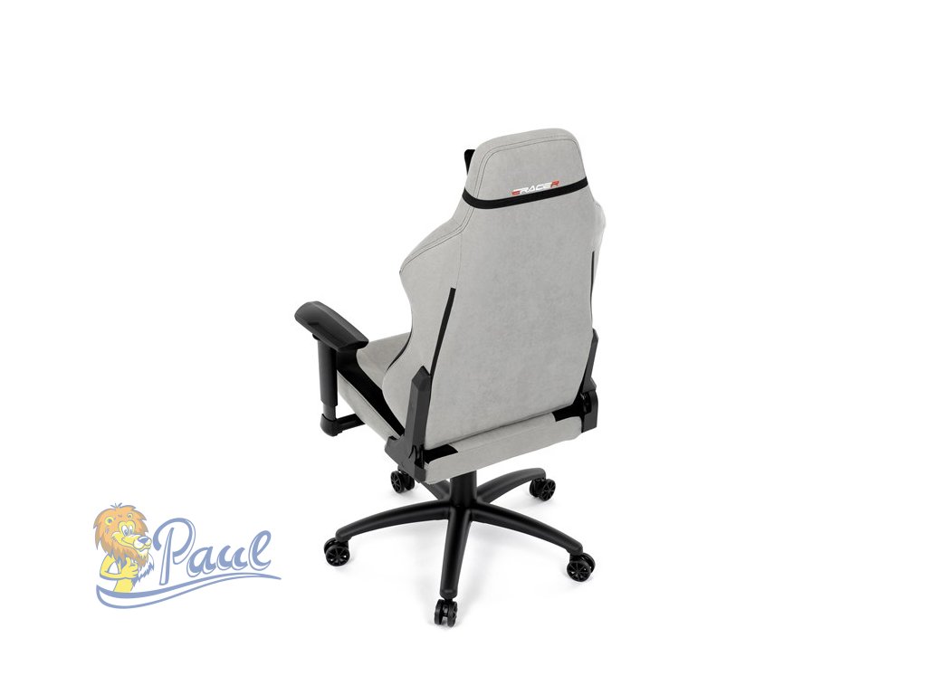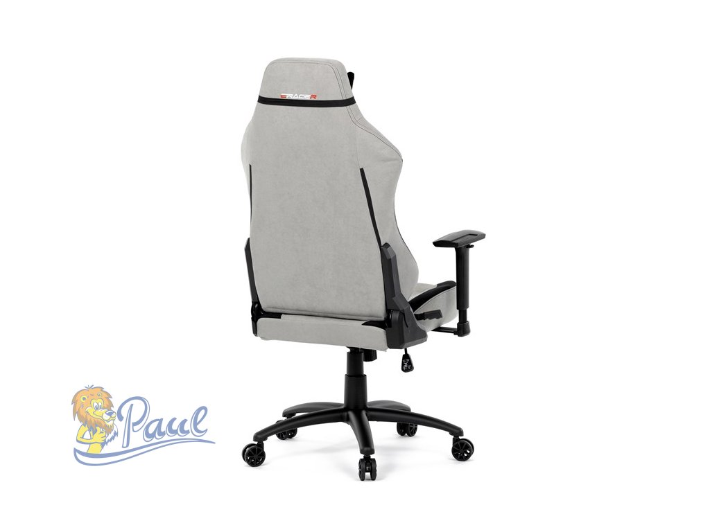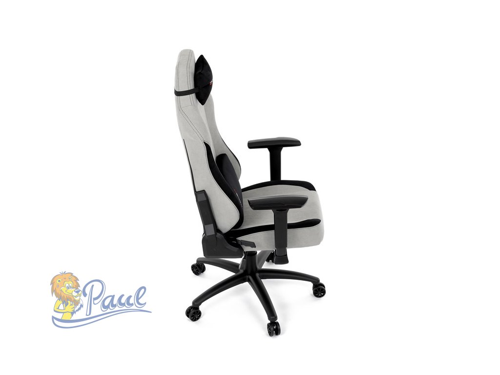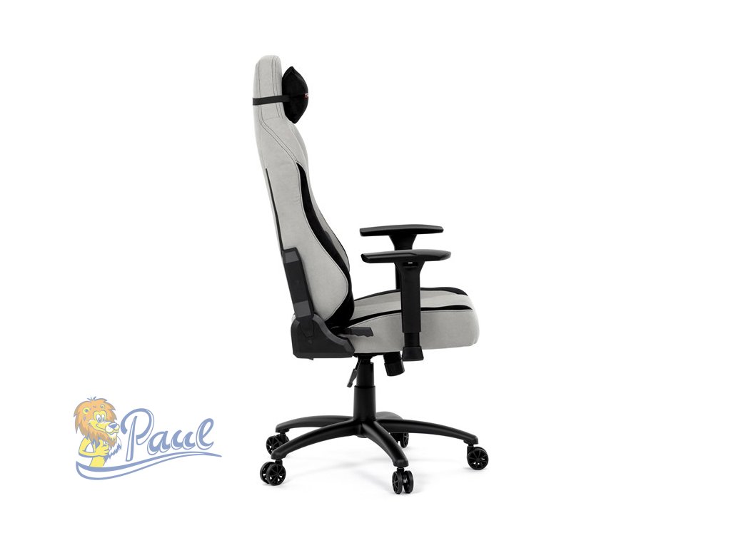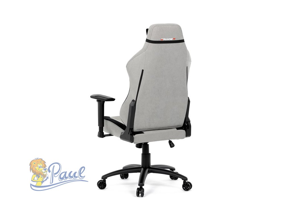 Herní křeslo, stříbrná látka, houpací mechanismus, polohování opěradla 90°-180°, 3D područky, polštáře z paměťové pěny,