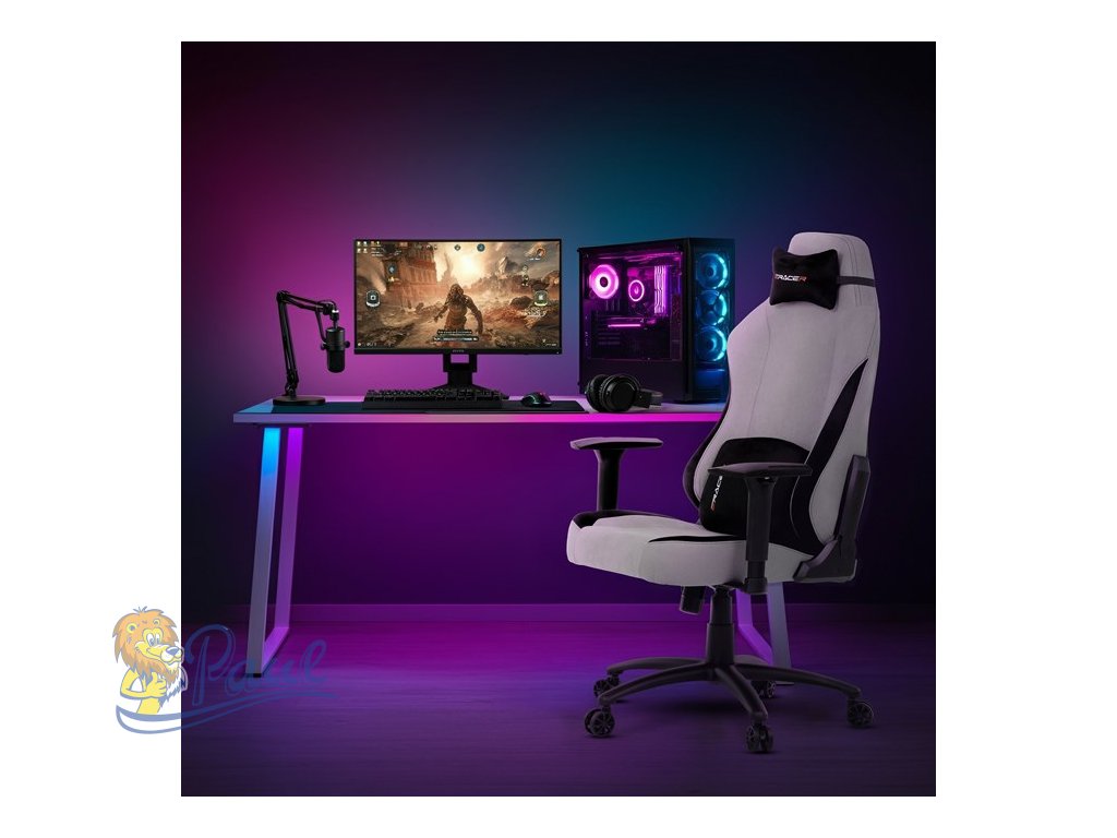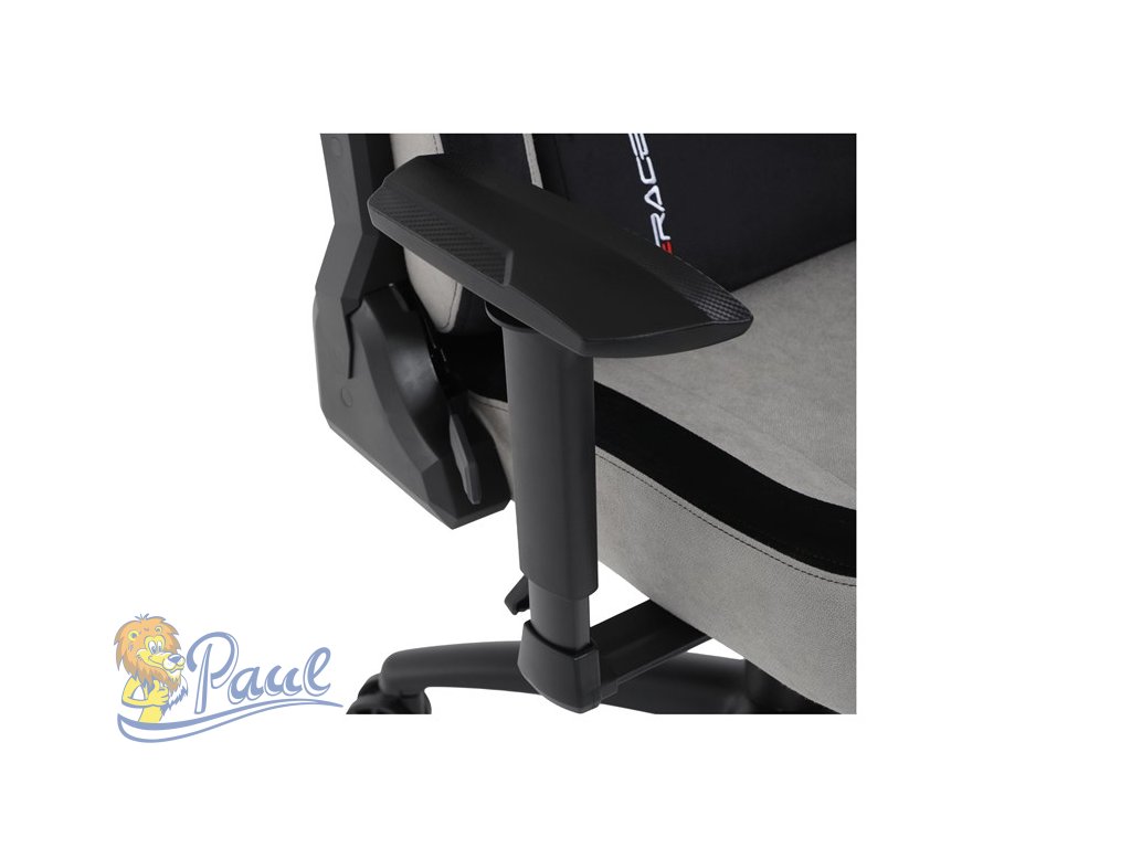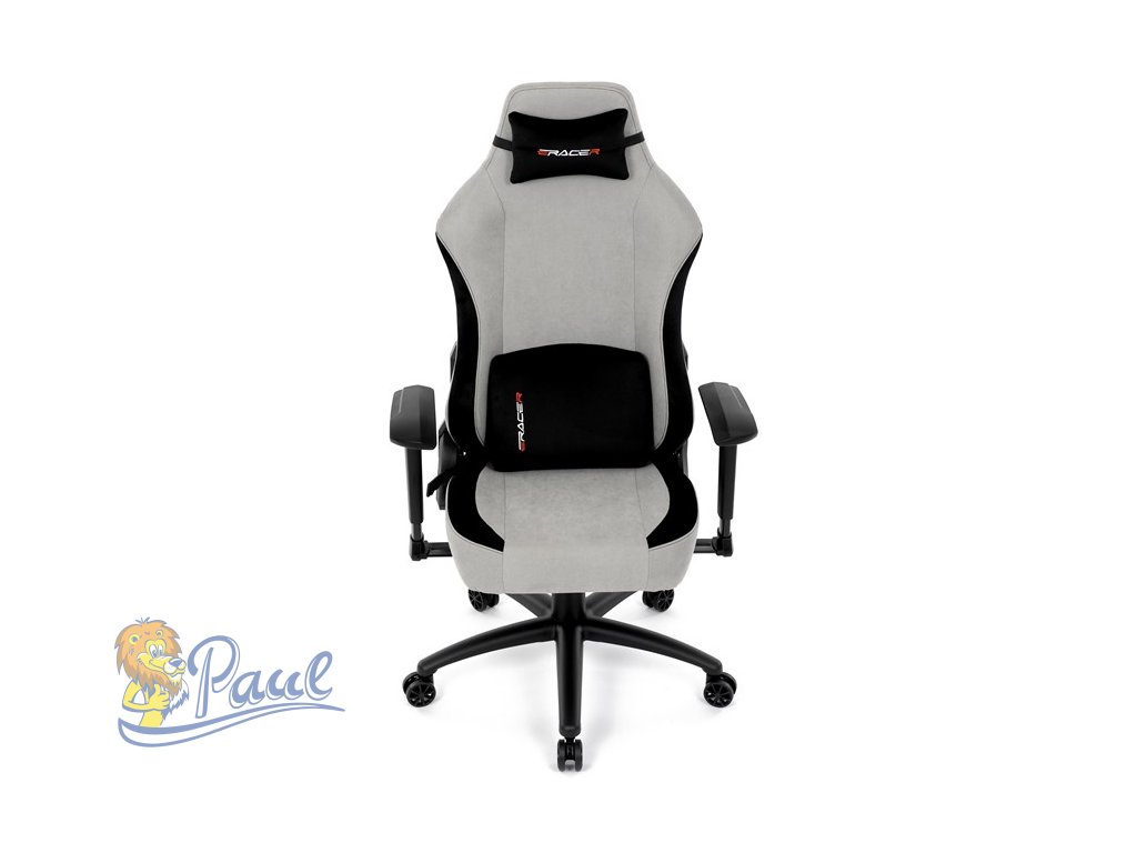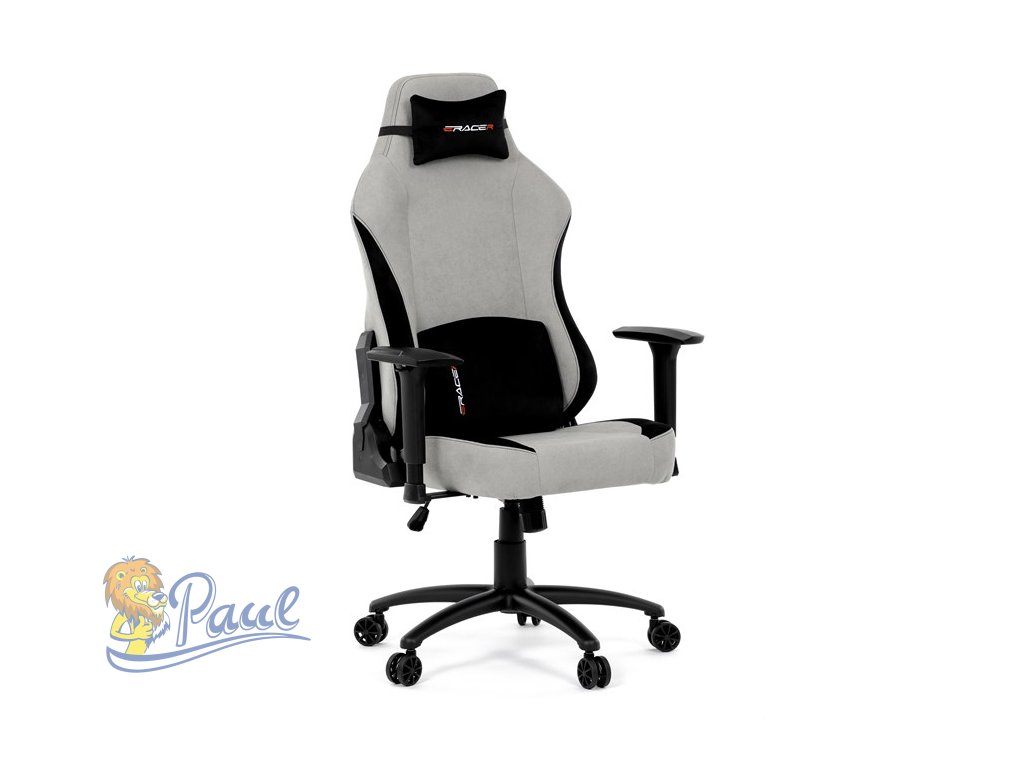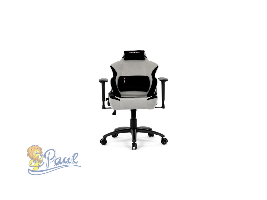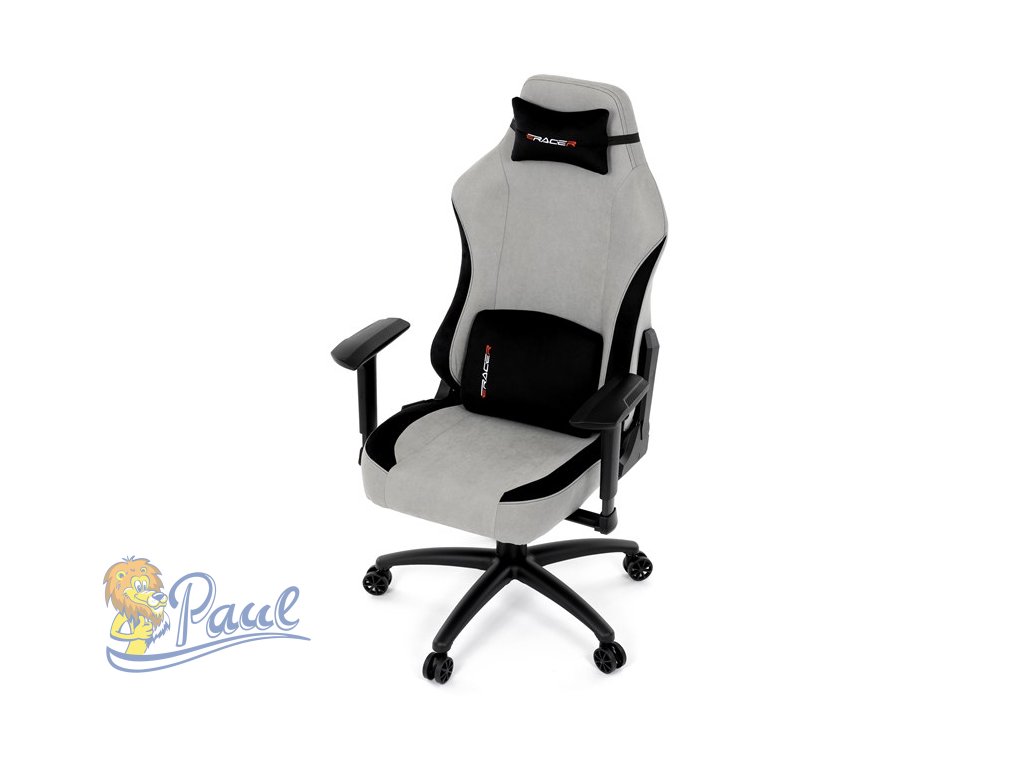 Herní křeslo, stříbrná látka, houpací mechanismus, polohování opěradla 90°-180°, 3D područky, polštáře z paměťové pěny,