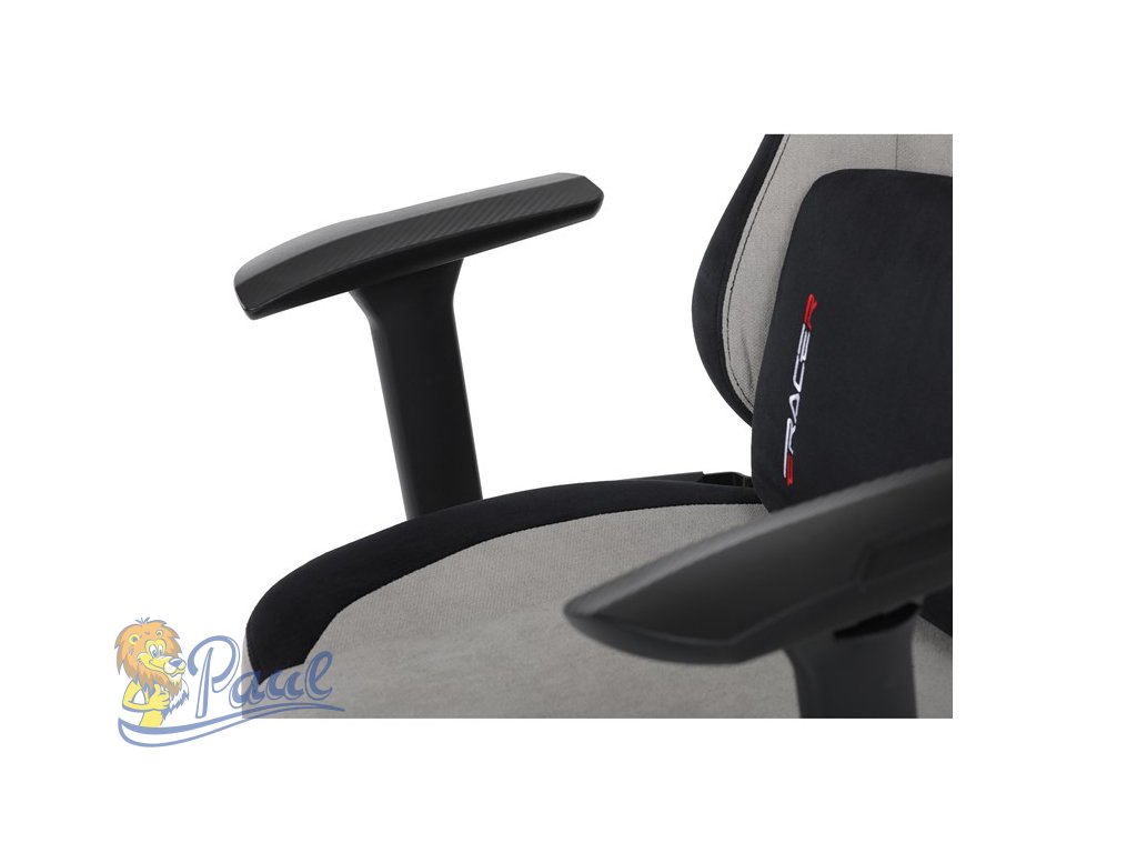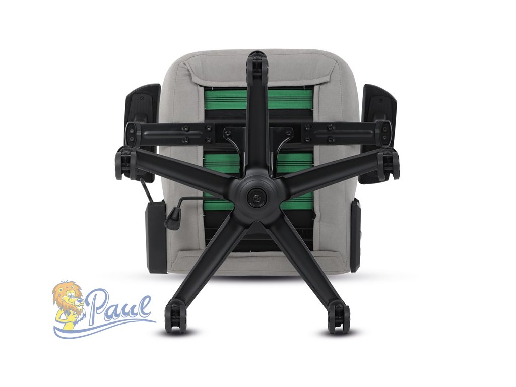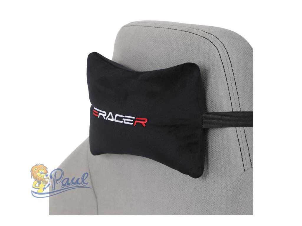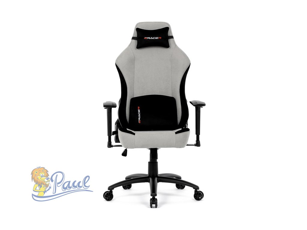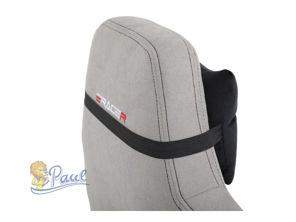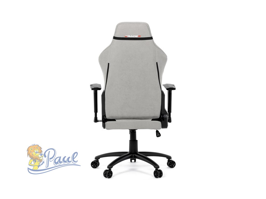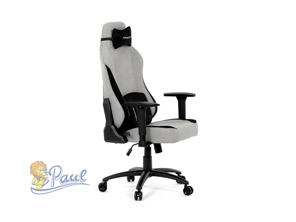 Herní křeslo, stříbrná látka, houpací mechanismus, polohování opěradla 90°-180°, 3D područky, polštáře z paměťové pěny,