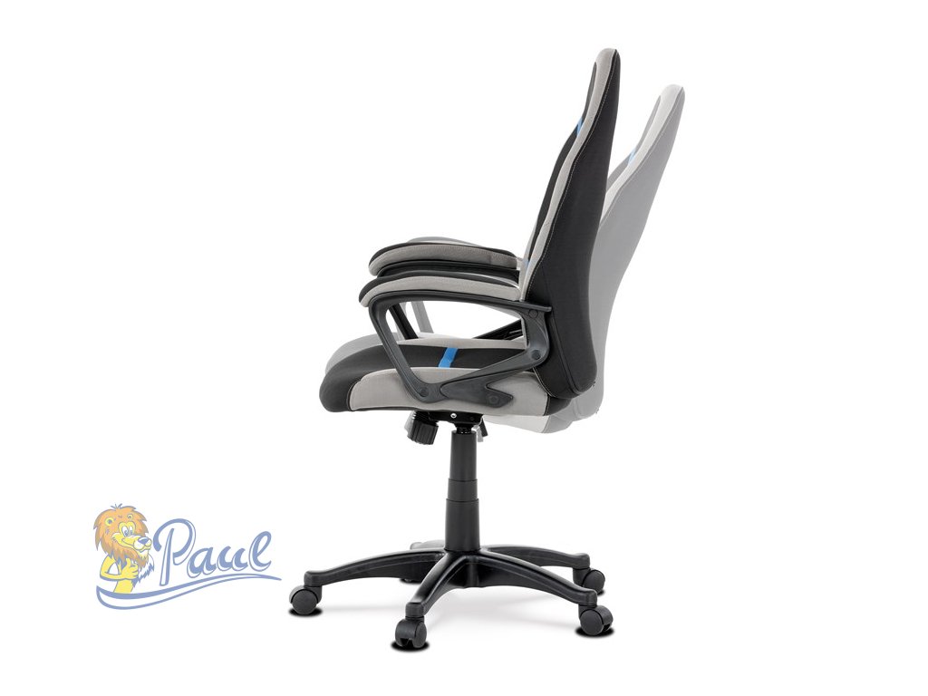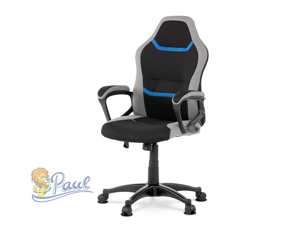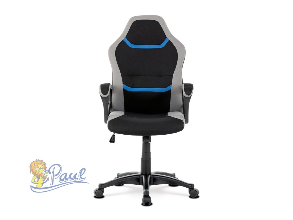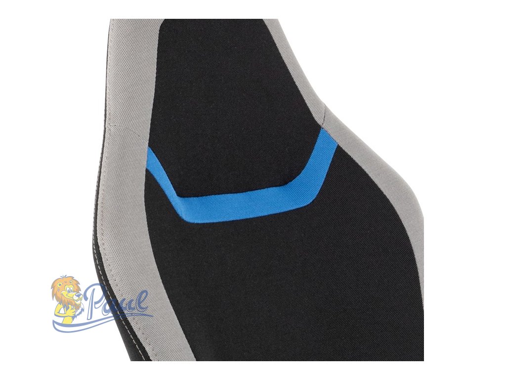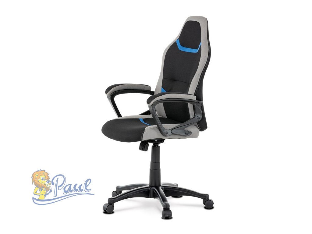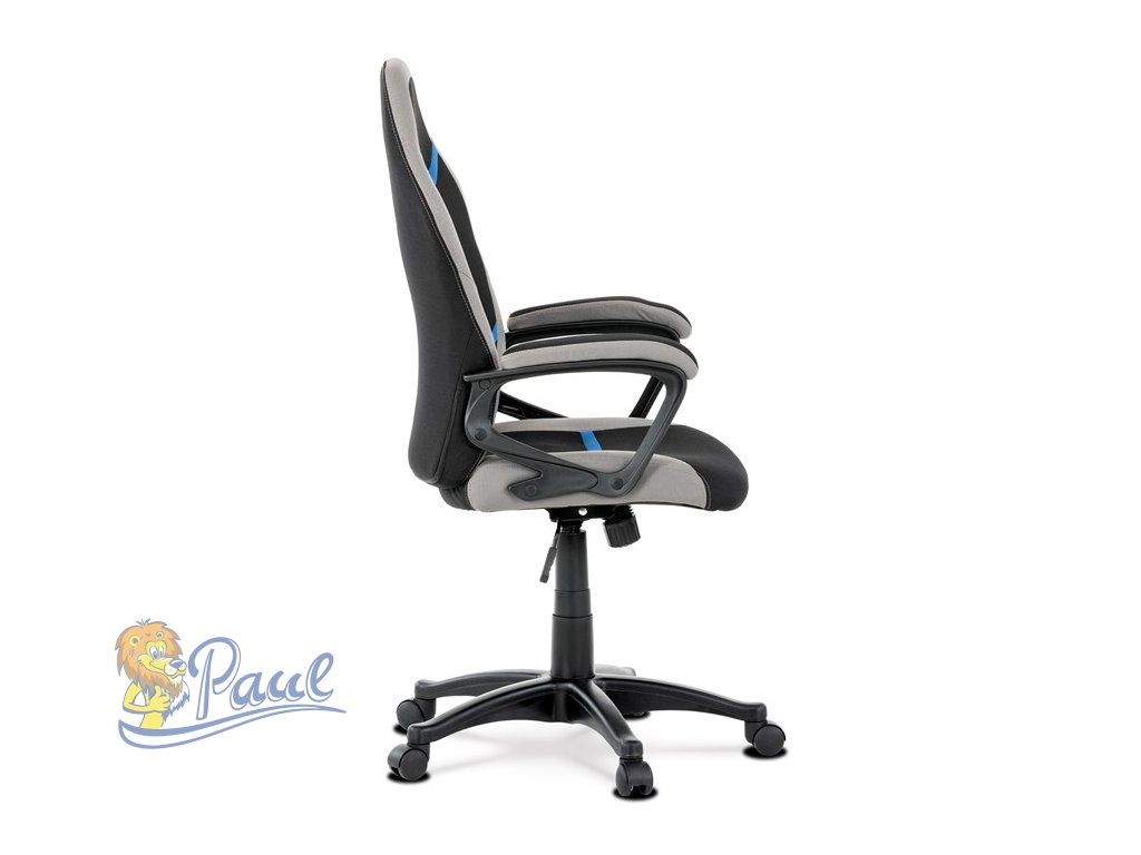 Elegantní kancelářská i herní židle se zaoblenými liniemi, obvodovým prošitím v šedé barvě a výrazným tvarovým prošitím sedáku i opěráku. Potah je kombinací černé a světle šedé látky hladké látky s decentním modrým detailem na opěráku i sedáku. Polstrování je z kvalitní PU pěny. Židle je vybavena houpacím mechanismem s nastavením protiváhy a aretací v základní poloze. Tuhost protiváhy lze regulovat velkým plastovým šroubem, umístěným pod sedákem. Výška sezení se upravuje páčkou na pravé straně přes kvalitní plynový píst. Znavené ruce si velice pohodlně položíte na plastové područky, na ložné ploše polstrované černou a šedou látkou. Šíře područek je úžasných 7,5 cm, ložná plocha 31 cm a výška 3 cm. Opěrák je vyšší, částečně prodyšný a s integrovanou statickou opěrkou hlavy. Zvýšené okraje sedáku i opěráku podporují správné držení těla i páteře a slouží jako výborná opora. Kříž je černý plastový o průměru je 65 cm, což zajišťuje výbornou stabilitu i u fyzicky náročnějších her. Kolečka jsou plastová pr. 5 cm. Nosnost židle je až 120 kg.Doplňkové parametry