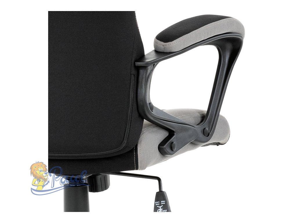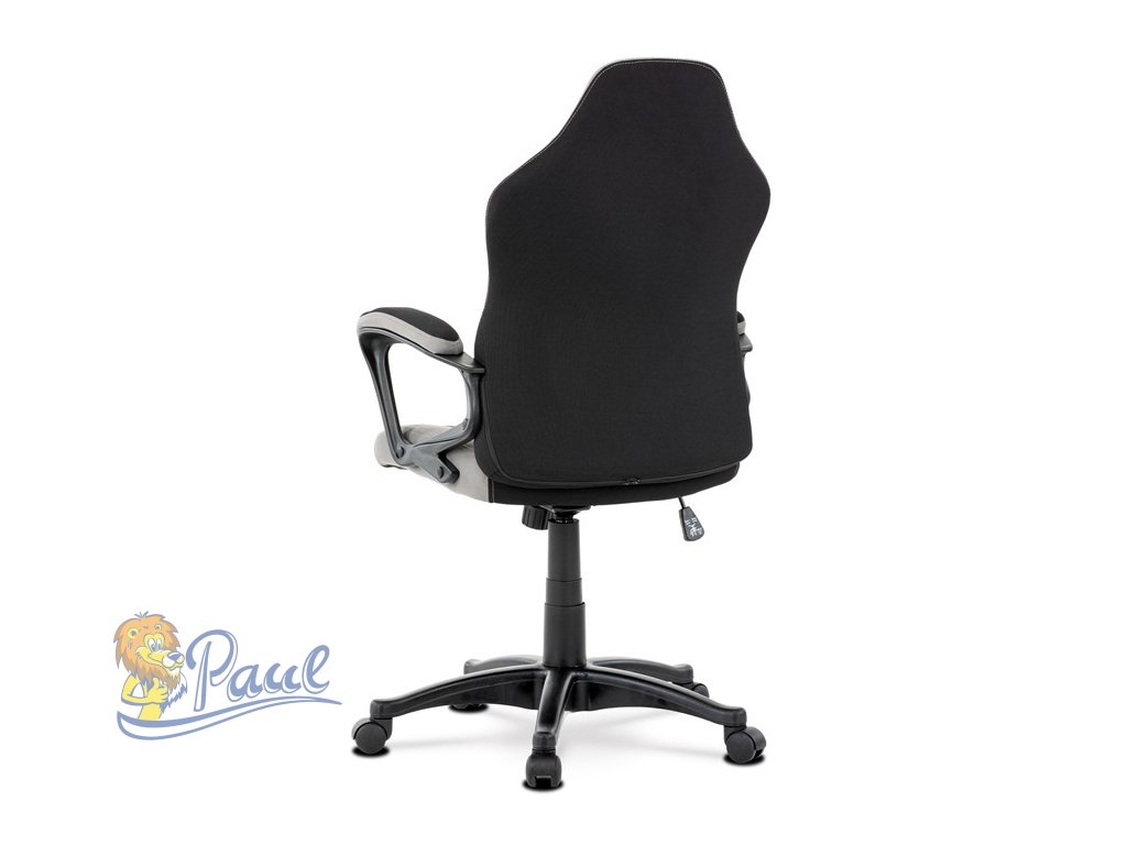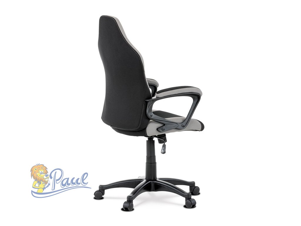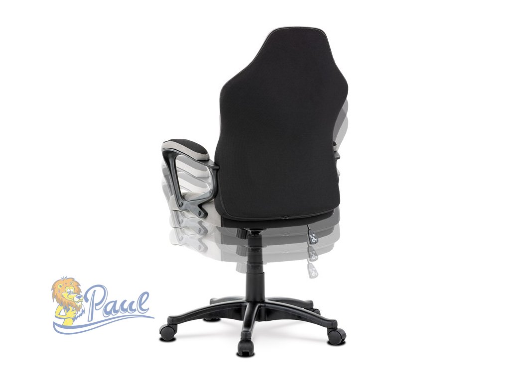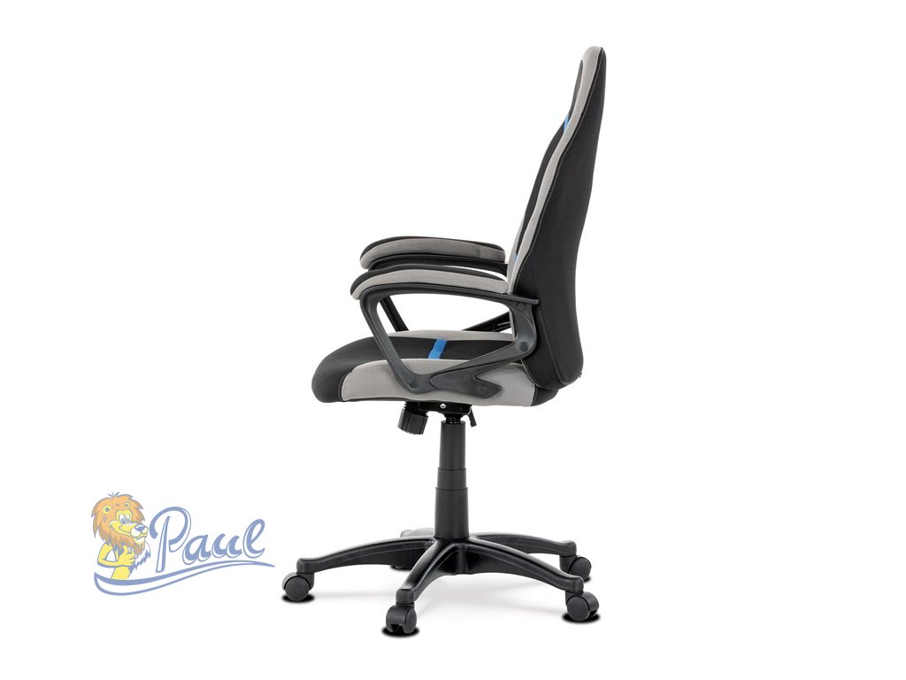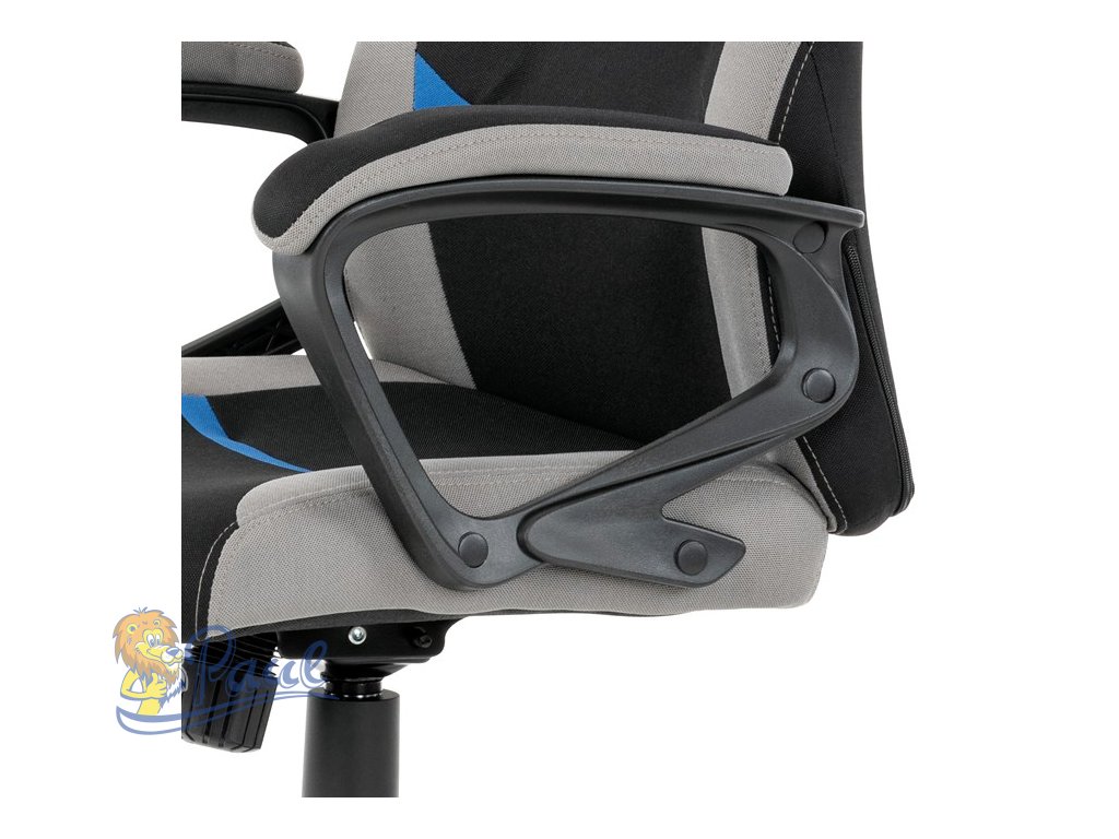 Elegantní kancelářská i herní židle se zaoblenými liniemi, obvodovým prošitím v šedé barvě a výrazným tvarovým prošitím sedáku i opěráku. Potah je kombinací černé a světle šedé látky hladké látky s decentním modrým detailem na opěráku i sedáku. Polstrování je z kvalitní PU pěny. Židle je vybavena houpacím mechanismem s nastavením protiváhy a aretací v základní poloze. Tuhost protiváhy lze regulovat velkým plastovým šroubem, umístěným pod sedákem. Výška sezení se upravuje páčkou na pravé straně přes kvalitní plynový píst. Znavené ruce si velice pohodlně položíte na plastové područky, na ložné ploše polstrované černou a šedou látkou. Šíře područek je úžasných 7,5 cm, ložná plocha 31 cm a výška 3 cm. Opěrák je vyšší, částečně prodyšný a s integrovanou statickou opěrkou hlavy. Zvýšené okraje sedáku i opěráku podporují správné držení těla i páteře a slouží jako výborná opora. Kříž je černý plastový o průměru je 65 cm, což zajišťuje výbornou stabilitu i u fyzicky náročnějších her. Kolečka jsou plastová pr. 5 cm. Nosnost židle je až 120 kg.Doplňkové parametry