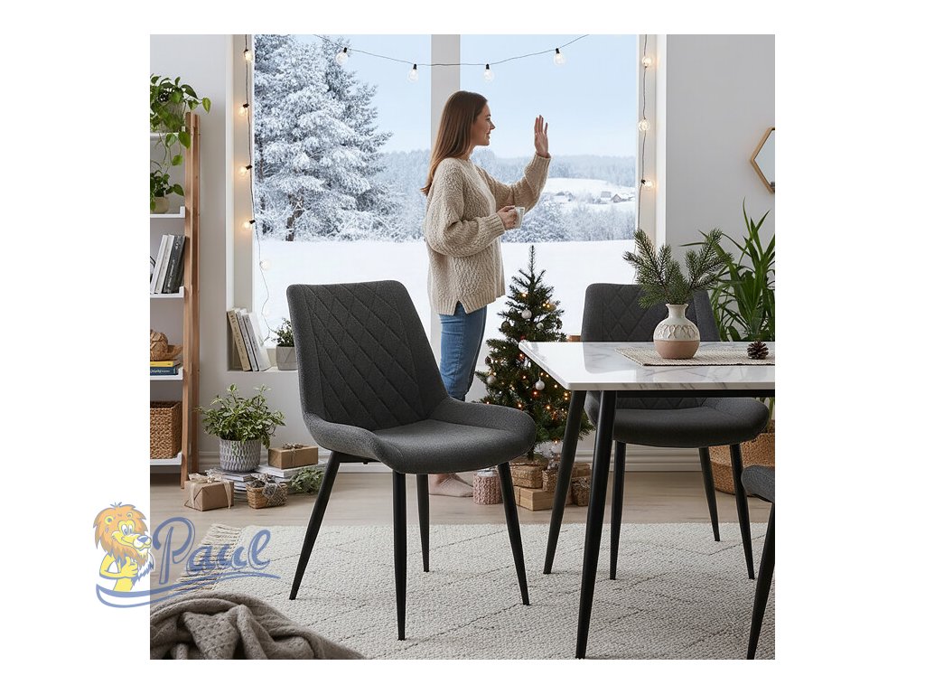 Jídelní židle s čalouněním v šedé látce nabízí pohodlné sezení díky ergonomicky tvarovanému sedáku a opěradlu s designovým prošitím, které zároveň dodává moderní vzhled. Pevná kovová podnož v černém provedení zajišťuje stabilitu a dlouhou životnost. Absence područek umožňuje snadné zasunutí židle pod stůl a šetří prostor v jídelně. Židle je vhodná pro každodenní použití v domácnostech i komerčních prostorách. Její jednoduchý, ale stylový design se snadno kombinuje s různými interiérovými styly.Doplňkové parametry