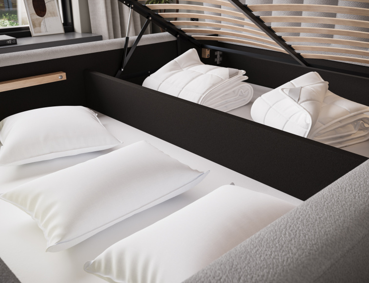 Postel je vybavena úložným prostorem, který se nachází pod lůžkem. Prostor je snadno přístupný od nohou postele. Otevírání úložného prostoru je jednoduché a pohodlné díky kvalitním pružinám.