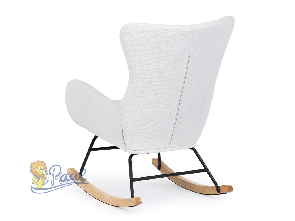 Křeslo houpací, potah bílá látka, dřevěné nohy, masiv kaučukovník