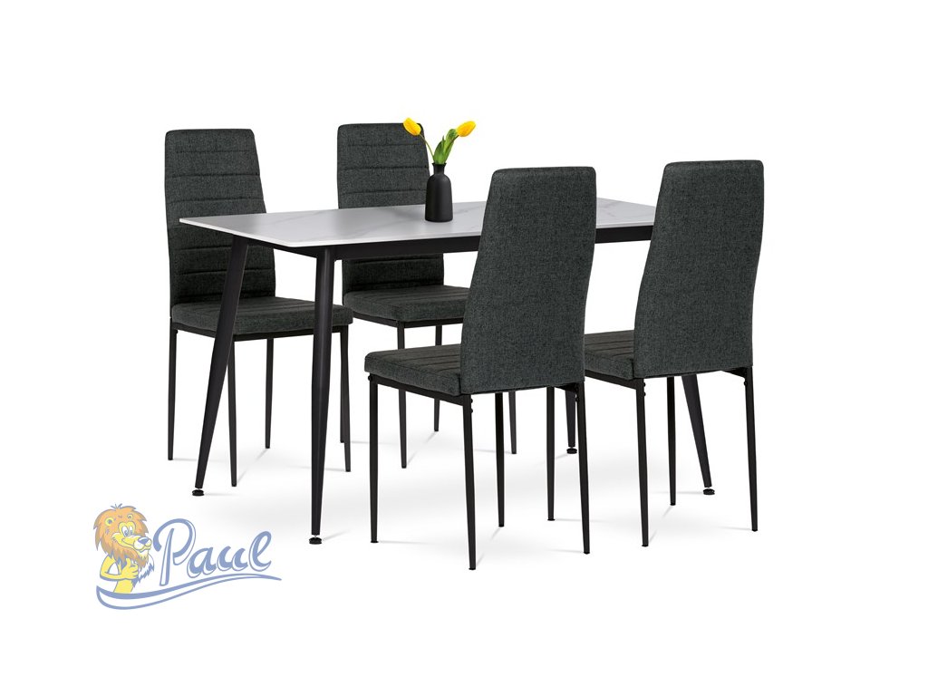 Moderní jídelní set Autronic v industriálním stylu je skvělou volbou pro vaši jídelnu. Obdélníkový stůl s deskou ze slinuté keramiky v bílém mramorovém dekoru působí elegantně a je odolný vůči poškrábání. Stabilitu zajišťují černé kovové nohy s jemně kónickým tvarem. Pohodlné židle mají čalounění z hladké černé látky a ergonomicky tvarovanou opěrku pro maximální komfort. Černé kovové nohy ladí se stolem a dodávají celku jednotný vzhled. Ideální volba pro stylové a funkční stolování.Doplňkové parametry