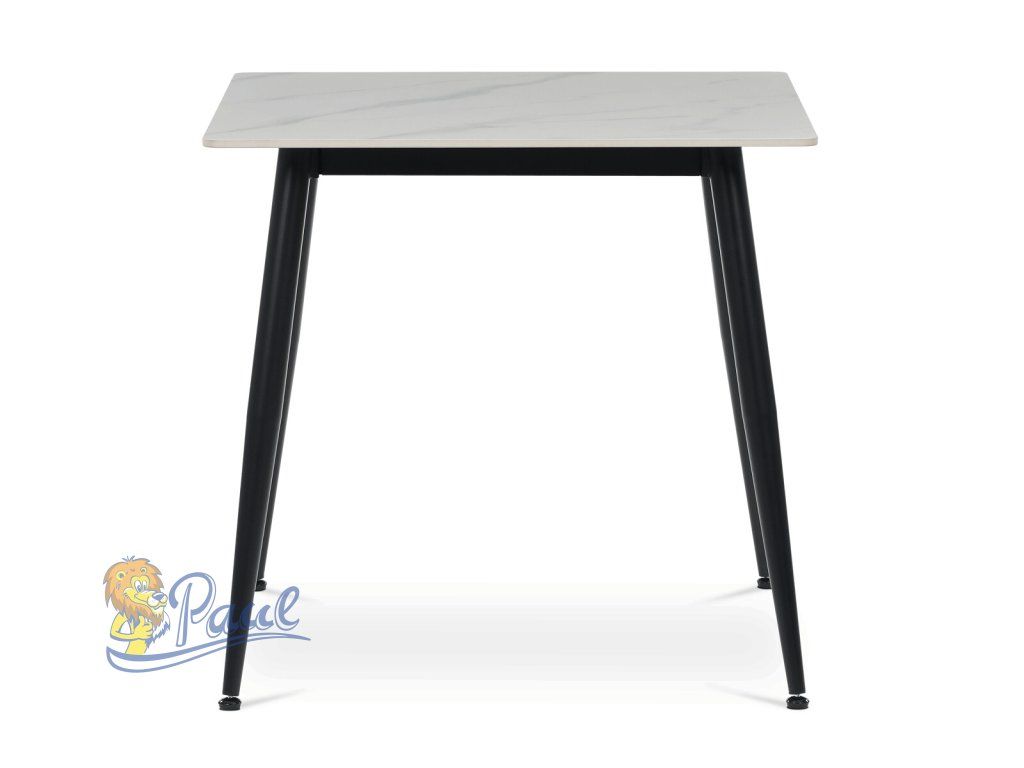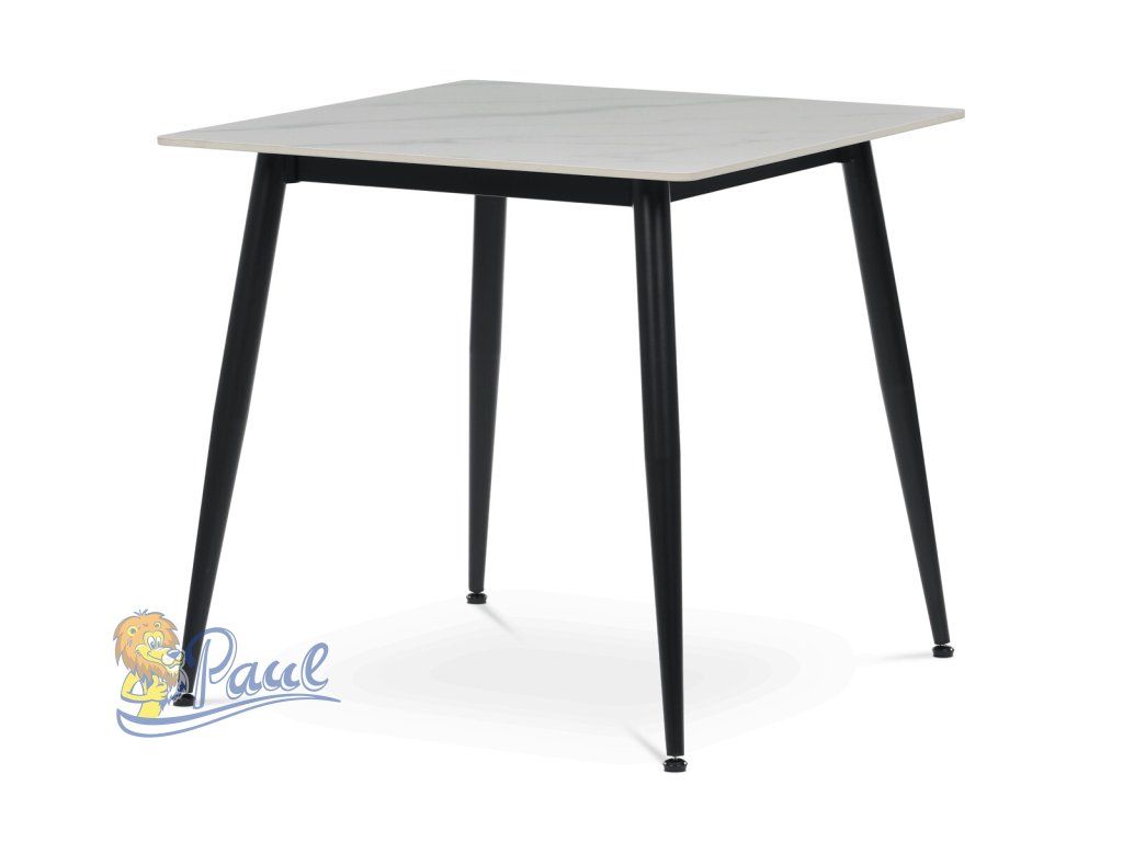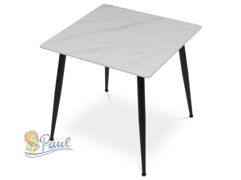 Jídelní stůl s rozměry 80x80 cm nabízí moderní kombinaci keramické desky s dekorem bílého mramoru a černých kovových nohou. Keramická deska je vysoce odolná vůči poškrábání a teplu, což zajišťuje snadnou údržbu a dlouhou životnost. Stabilní kovové nohy jsou opatřeny rektifikačními patkami, které umožňují vyrovnání stolu na nerovném povrchu a zvyšují jeho stabilitu. Čistý design s tenkou deskou a mírně zkosenými nohami se hodí do moderních i minimalistických interiérů. Stůl je pevný a navržený pro každodenní použití v jídelně či kuchyni.Doplňkové parametry