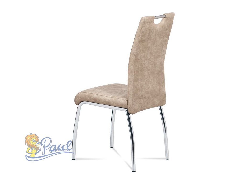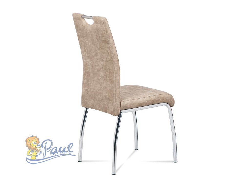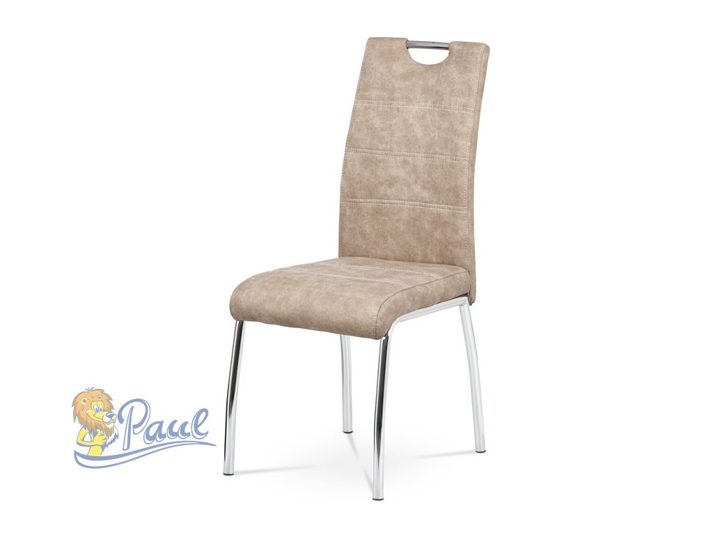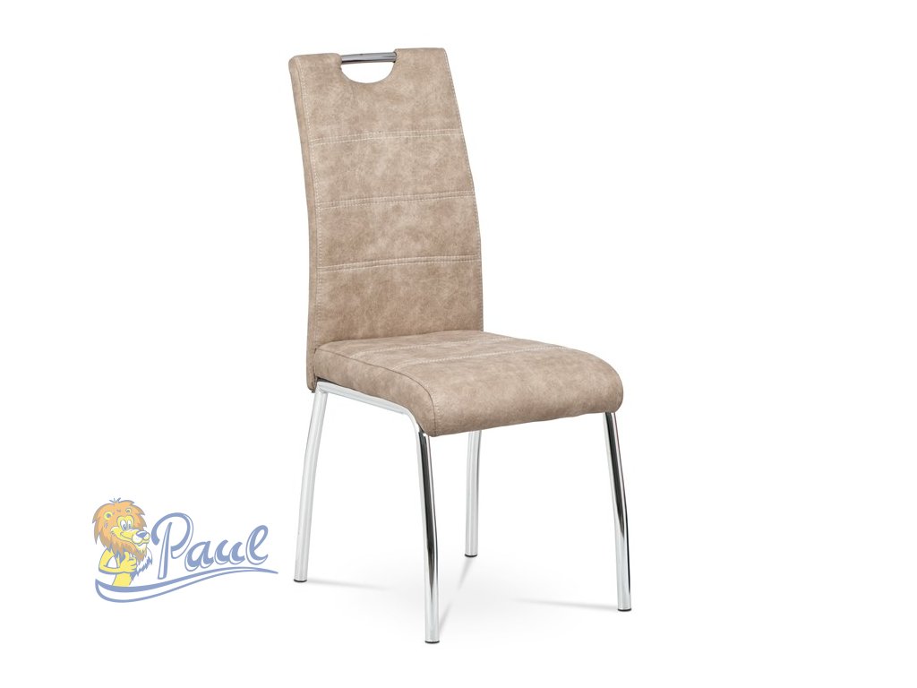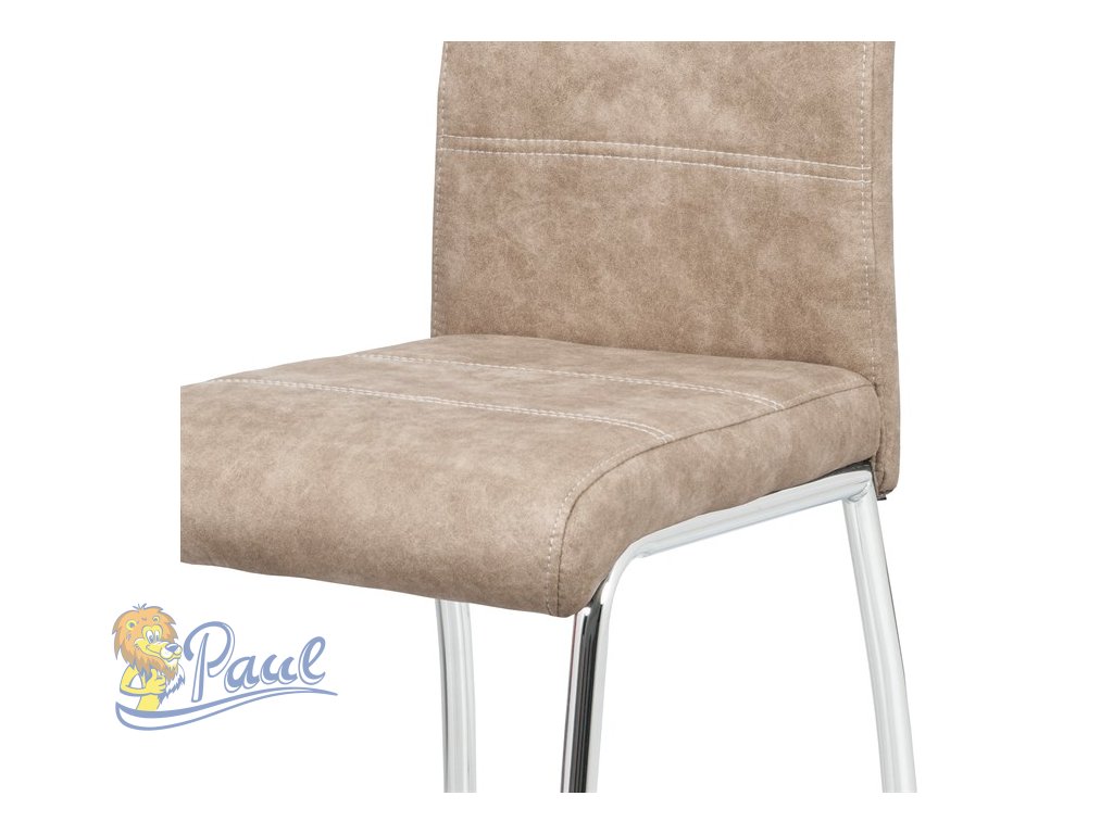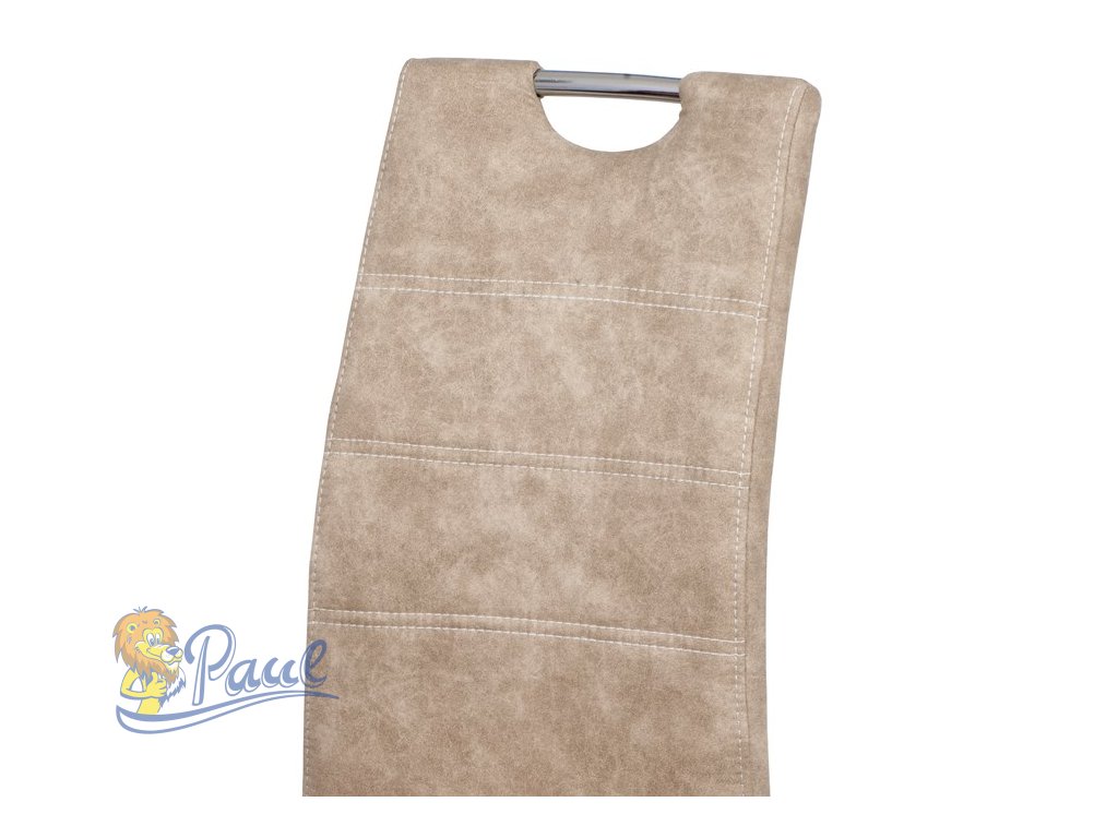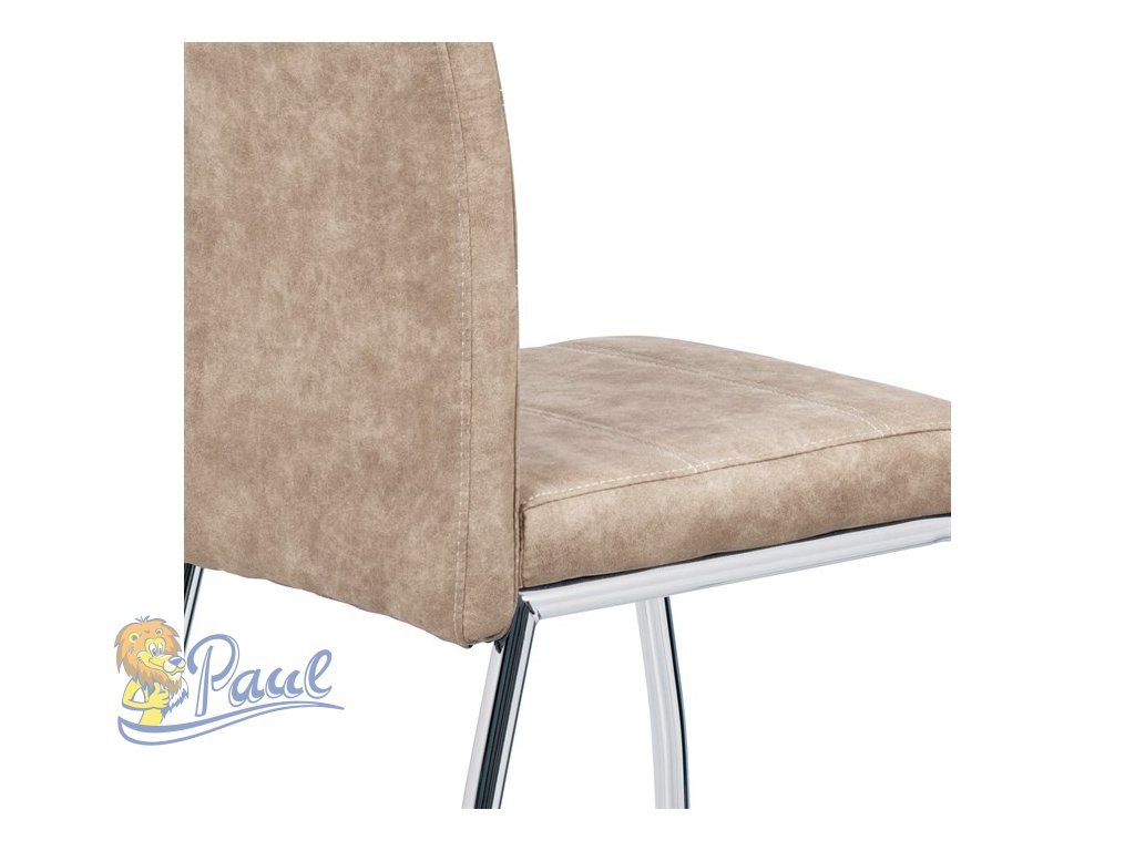 Jídelní židle s potahem z krémové látky v dekoru vintage kůže nabízí příjemný vzhled a pohodlí při sezení. Čalounění je zdobeno bílým prošitím, které podtrhuje stylový design. Pevné kovové nohy s chromovaným povrchem zajišťují stabilitu a dlouhou životnost. Židle nemá područky ani výškové nastavení, což ji činí kompaktní a snadno kombinovatelnou s různými typy jídelních stolů. Praktický otvor v opěradle umožňuje snadnou manipulaci a přenášení.Doplňkové parametry