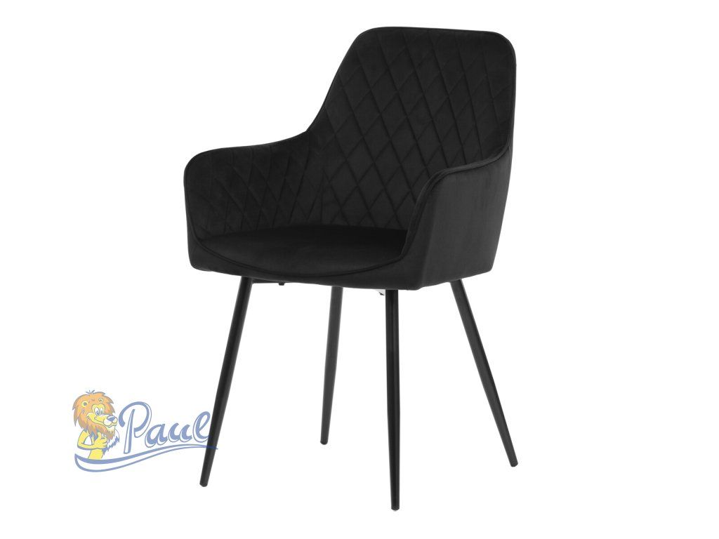 Jídelní židle s černým sametovým potahem nabízí pohodlné sezení díky měkkému čalounění a ergonomicky tvarovaným područkám. Čalounění je doplněno designovým prošitím v kosočtverečkovém vzoru, které zvýrazňuje její moderní vzhled. Pevné kovové nohy v černém matném provedení zajišťují stabilitu a dlouhou životnost židle. Sametová látka je příjemná na dotek a snadno se udržuje, což ji předurčuje k použití v jídelnách i dalších obytných prostorách. Židle není otočná, což přispívá k její jednoduché a pevné konstrukci.Doplňkové parametry
