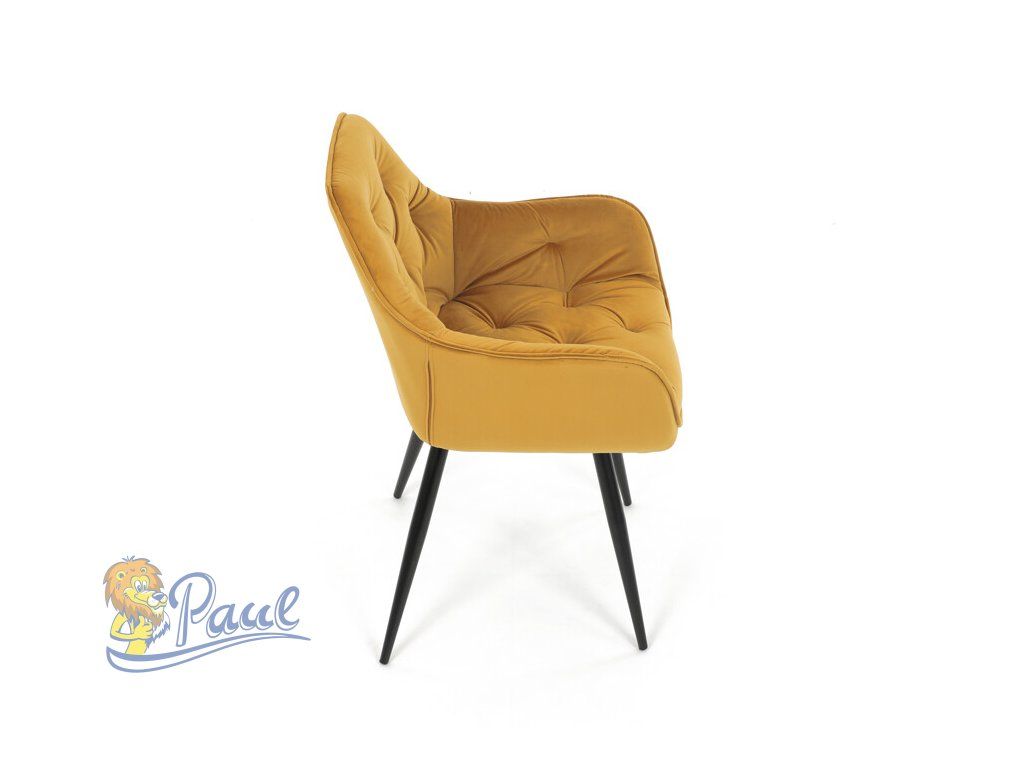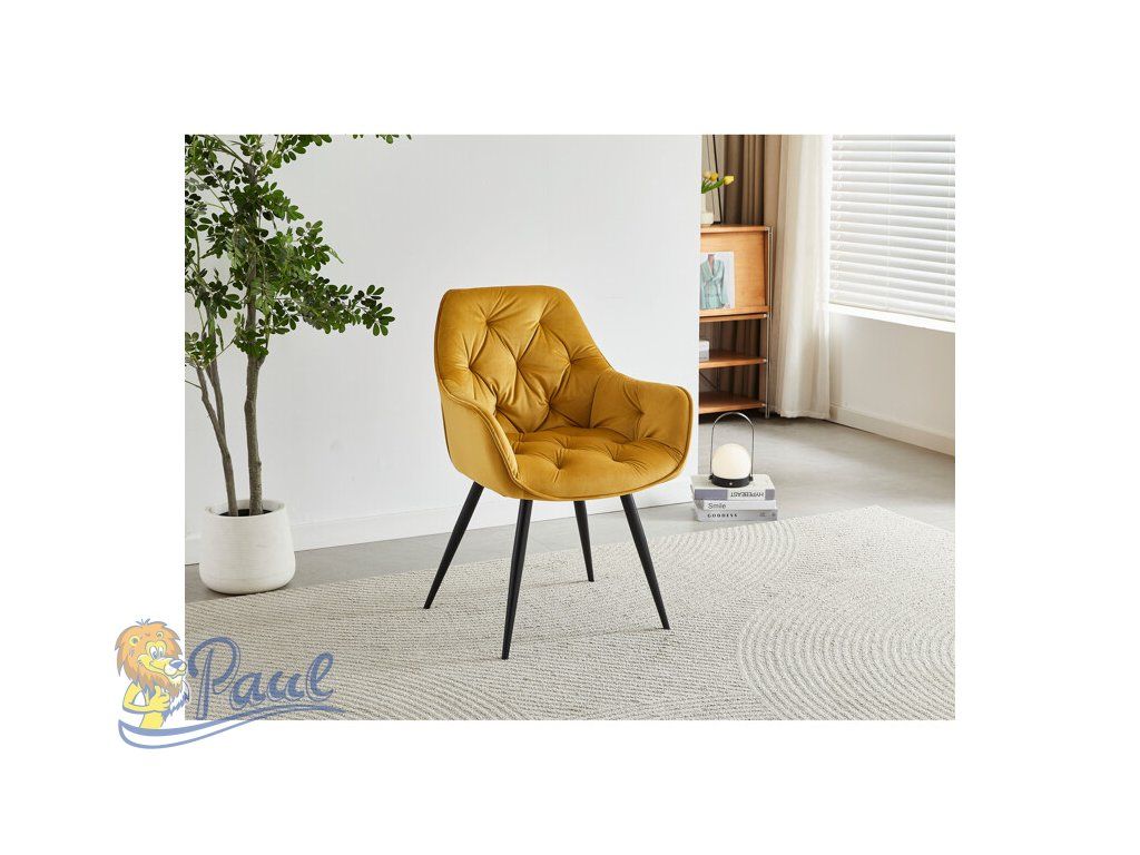 Jídelní židle s čalouněním v žluté sametové látce nabízí pohodlné sezení díky měkkému polstrování a ergonomicky tvarovaným područkám. Designové prošití na opěradle a sedáku dodává židli stylový vzhled a zároveň zvýrazňuje její elegantní profil. Pevná kovová čtyřnohá podnož s matným černým lakem zajišťuje stabilitu a dlouhou životnost. Židle je určena pro použití v jídelnách i moderních interiérech, kde vynikne její výrazná barva i kvalitní zpracování. Nenáročná údržba látky a robustní konstrukce podporují každodenní komfort a funkčnost.Doplňkové parametry
