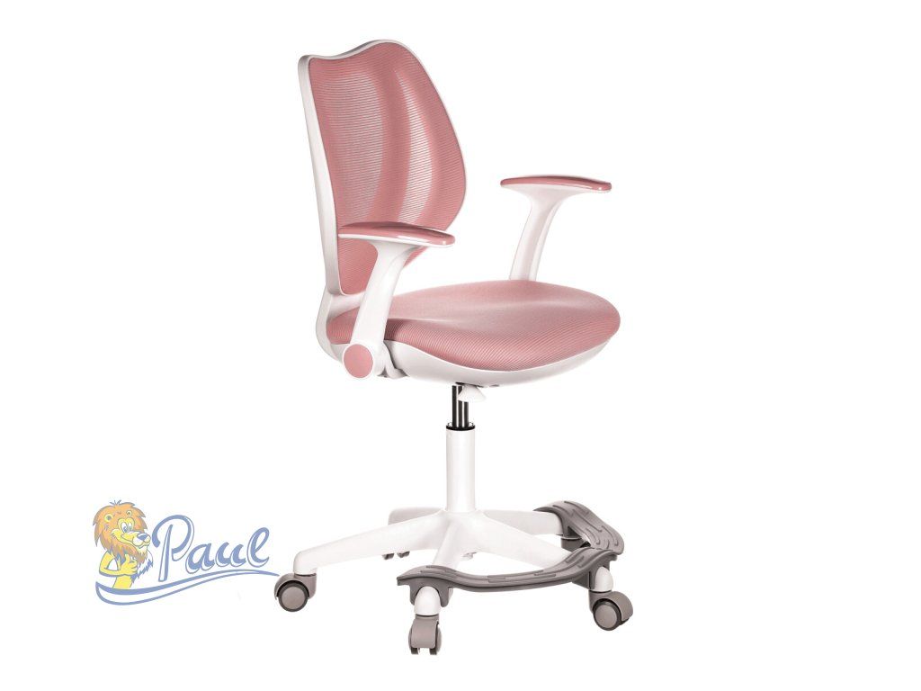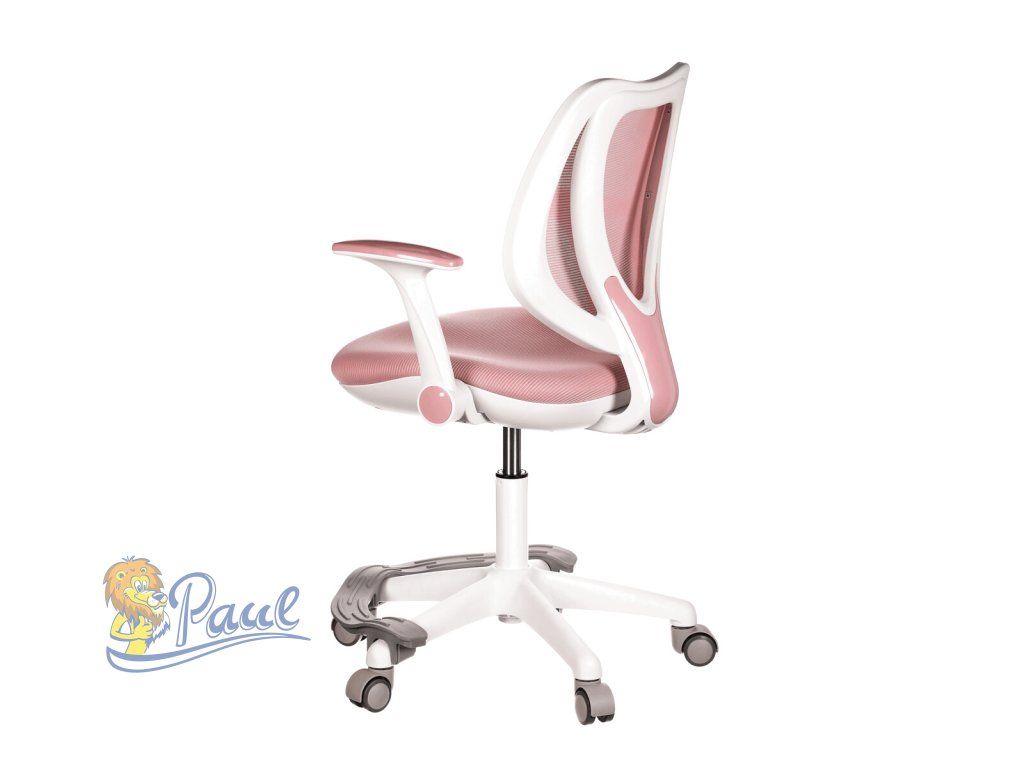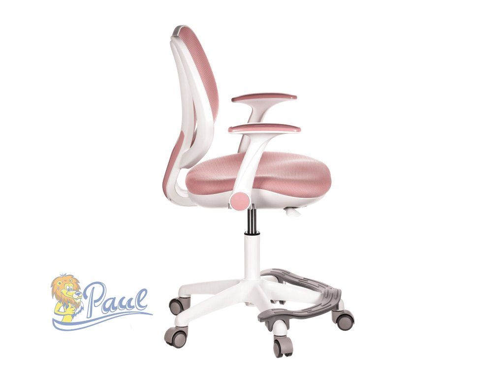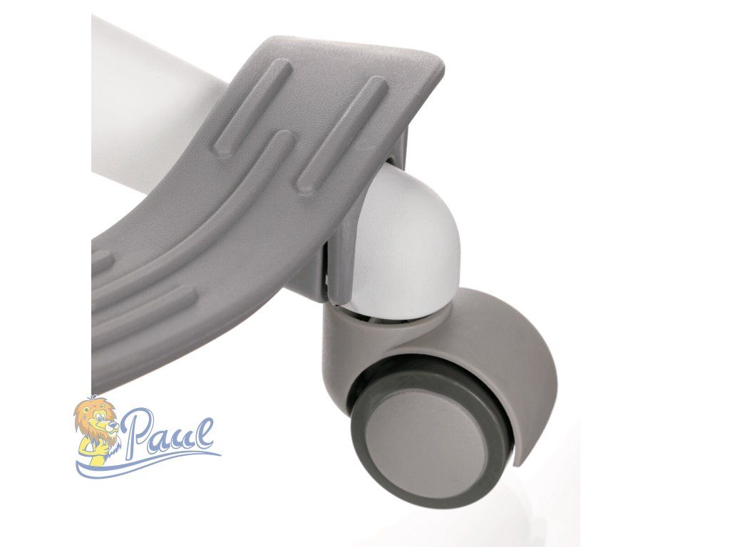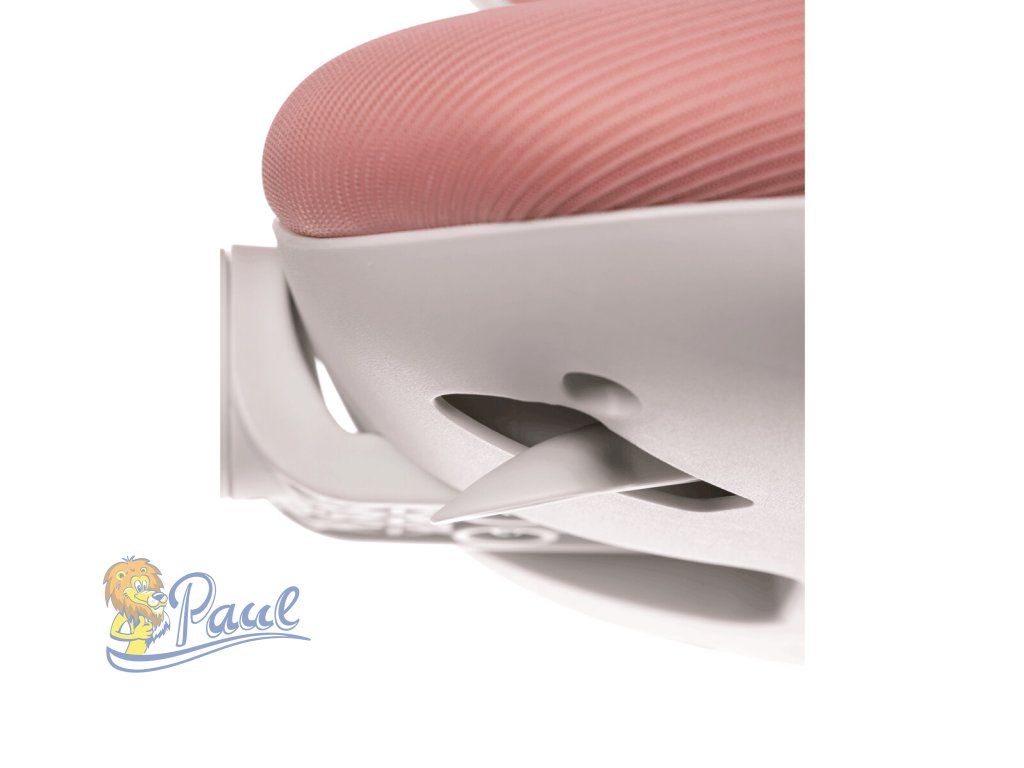 Dětská židle v příjemných pastelových barvách spolu s bílou kostrou nabízí jednoduchý a elegantní design. Židle má pevný opěrák potažený prodyšným síťovaným materiálem. Sedák ve stejném potahu poskytuje dostatek pohodlí díky svému vyměkčení. Pro pocit pohodlí slouží pevné područky, které jsou na své vrchní části opatřeny lesklým plastovým povrchem v barvě potahového materiálu. Důležitá je také integrovaná opěra nohou, která přispívá k pohodlnému sezení. Židle je opatřena speciálními funkčními kolečky, která se při zatížení automaticky zablokují, což zabraňuje nechtěným pohybům židle.Doplňkové parametry