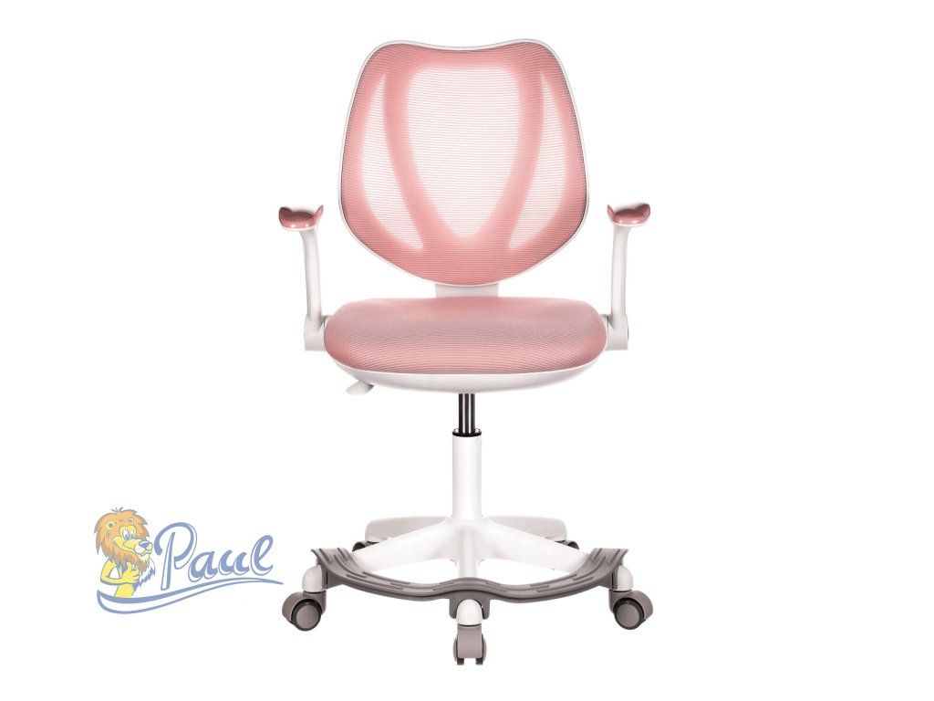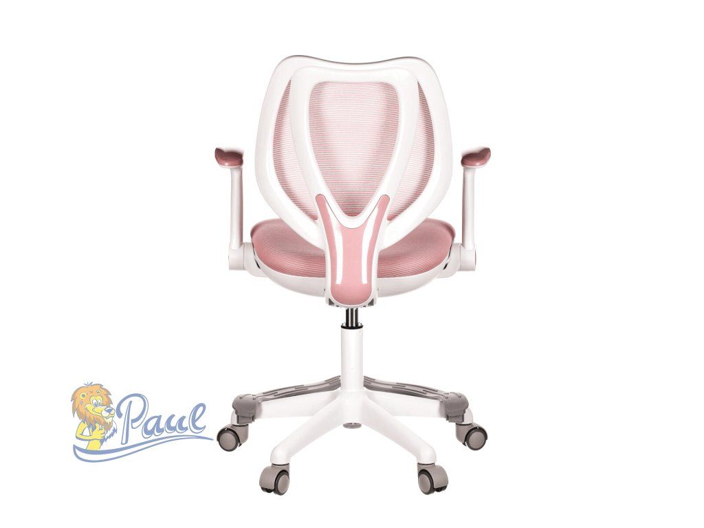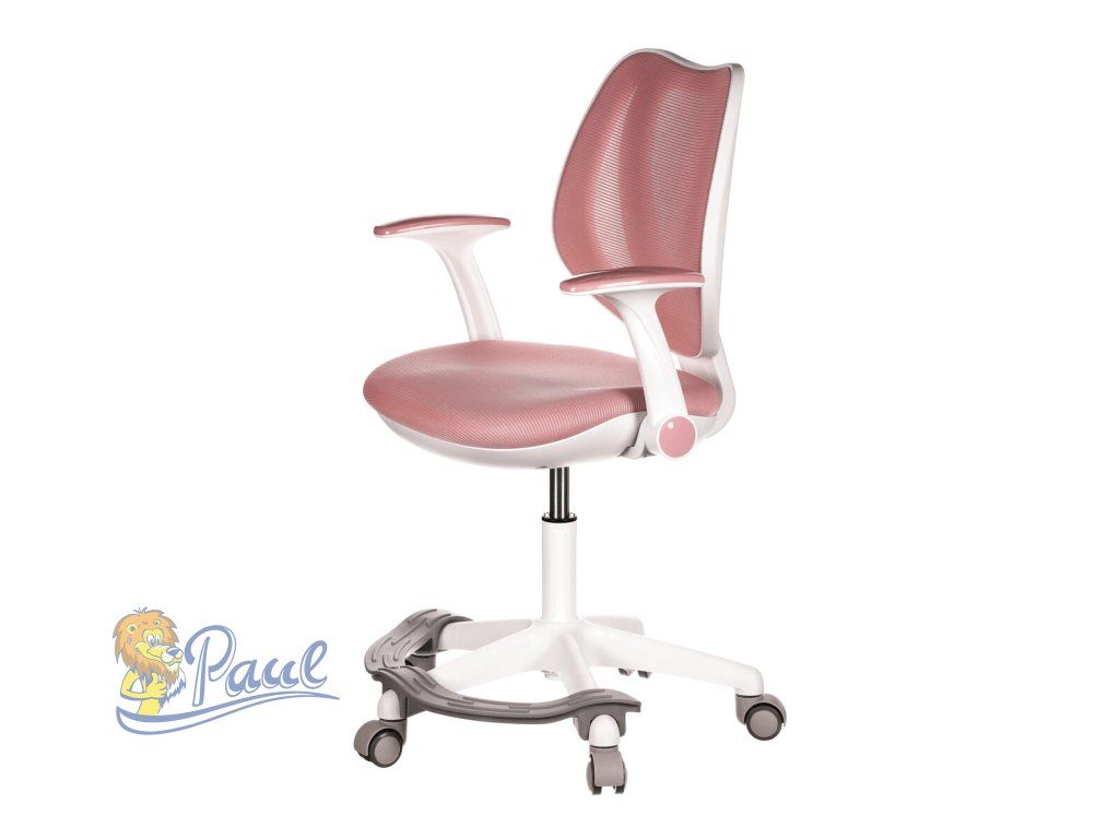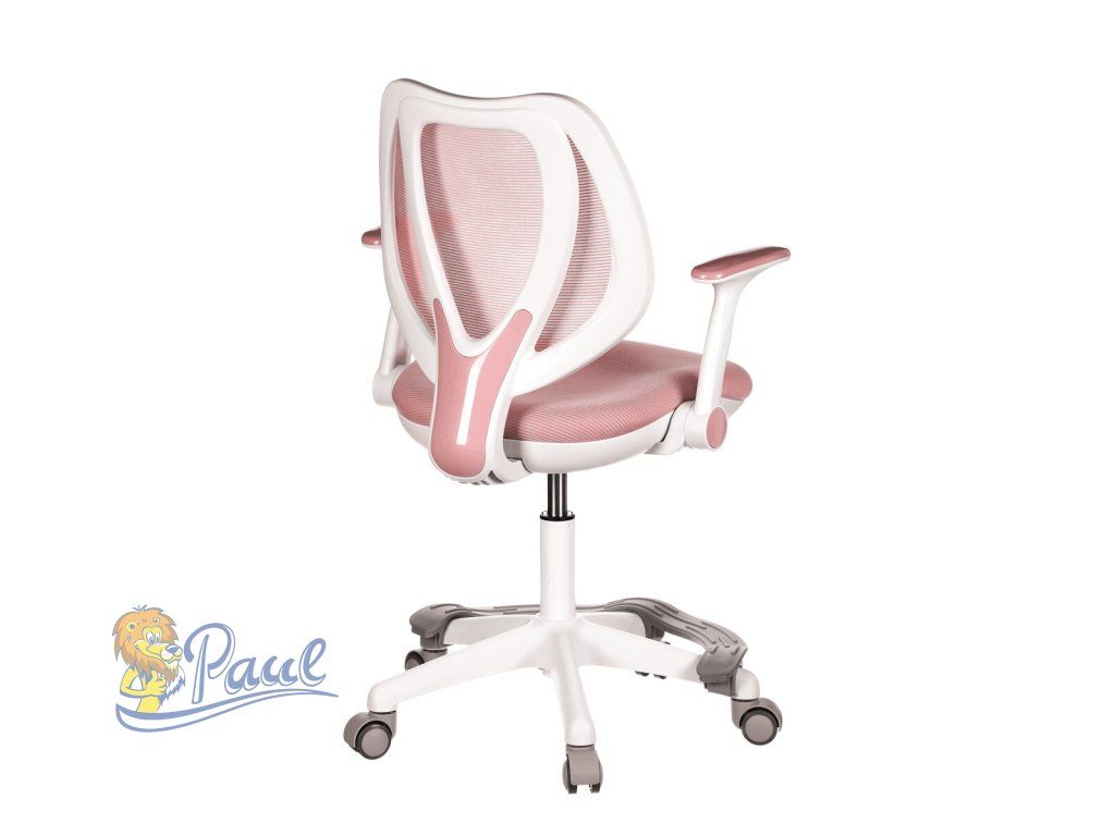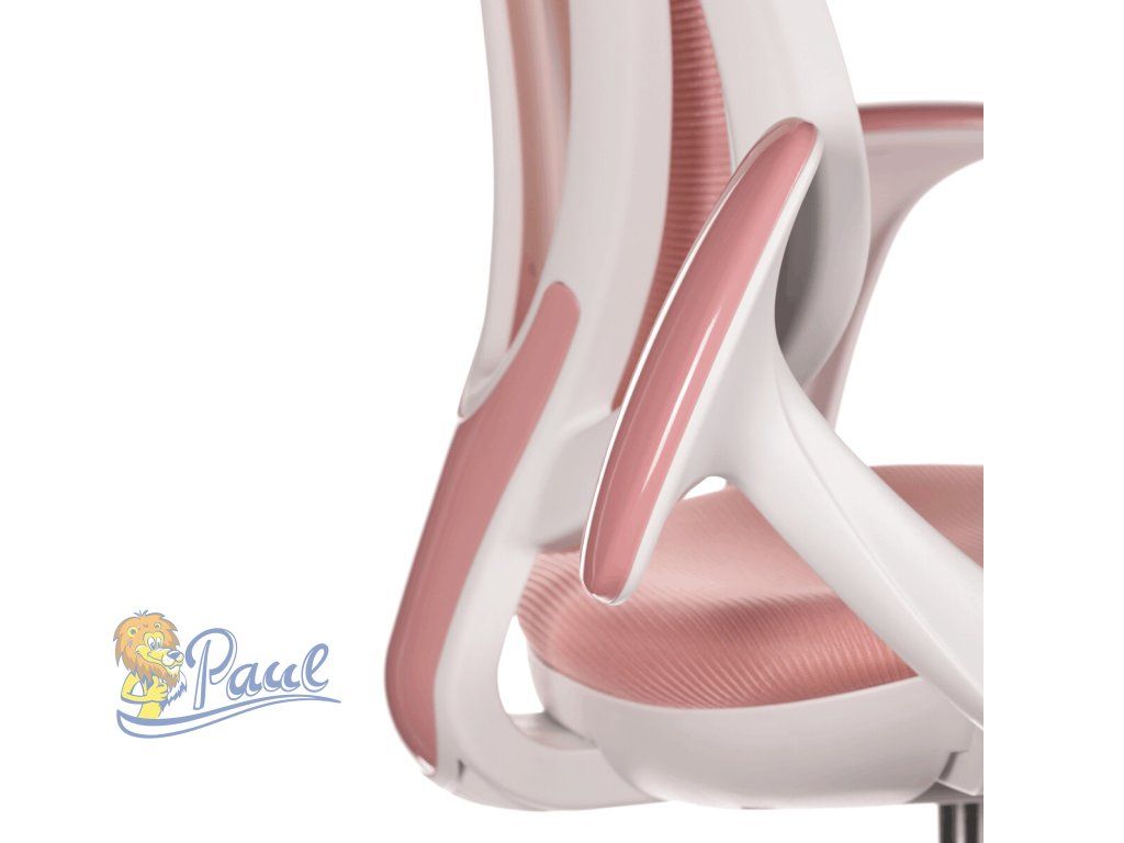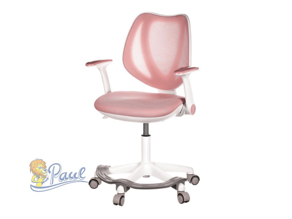 Dětská židle v příjemných pastelových barvách spolu s bílou kostrou nabízí jednoduchý a elegantní design. Židle má pevný opěrák potažený prodyšným síťovaným materiálem. Sedák ve stejném potahu poskytuje dostatek pohodlí díky svému vyměkčení. Pro pocit pohodlí slouží pevné područky, které jsou na své vrchní části opatřeny lesklým plastovým povrchem v barvě potahového materiálu. Důležitá je také integrovaná opěra nohou, která přispívá k pohodlnému sezení. Židle je opatřena speciálními funkčními kolečky, která se při zatížení automaticky zablokují, což zabraňuje nechtěným pohybům židle.Doplňkové parametry