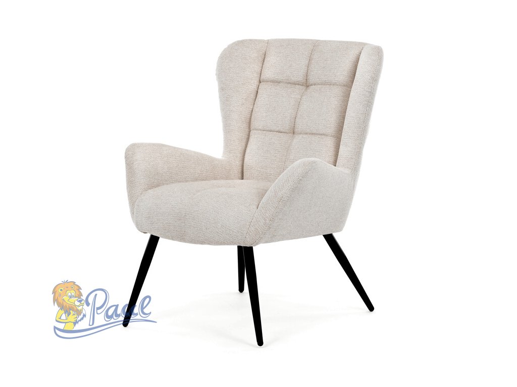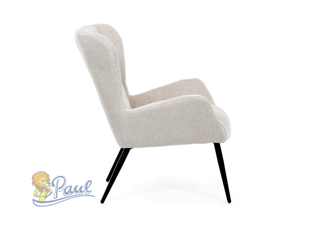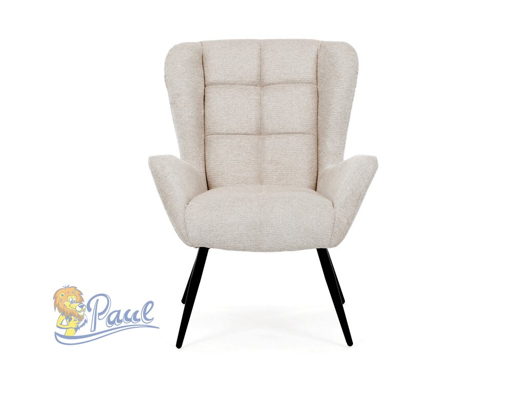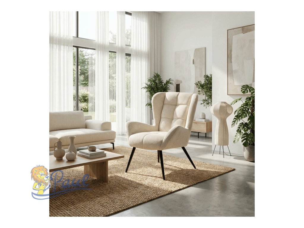 Křeslo ušák v krémovém odstínu nabízí pohodlí díky vysokému polstrování sedáku i opěradla, které je potažené prémiovou látkou s příjemnou texturou. Pevné černé kovové nohy zajišťují stabilitu a dlouhou životnost, zatímco integrované područky přispívají k ergonomickému posedění. Design s charakteristickými vysokými bočními opěrkami poskytuje oporu hlavy a ramenům, což zvyšuje komfort při odpočinku. Křeslo je vhodné do moderních i klasických interiérů, kde vynikne svým nadčasovým tvarem a neutrálním barevným provedením.Doplňkové parametry