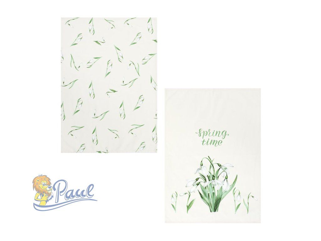 Sada dvou bavlněných utěrek zdobených motivem sněženek v jemných zelených odstínech přináší do kuchyně svěží jarní atmosféru. Utěrky jsou vyrobeny z přírodní bavlny, která se snadno udržuje a je příjemná na dotek. Jeden kus je potištěn drobnými květinovými vzory po celé ploše, druhý nese větší květinový motiv doplněný nápisem „spring time“. Díky rozměrům jsou vhodné pro běžné kuchyňské použití i jako dekorativní doplněk. Přírodní materiál zajišťuje dobrou savost a dlouhou životnost.Doplňkové parametry