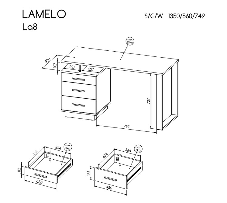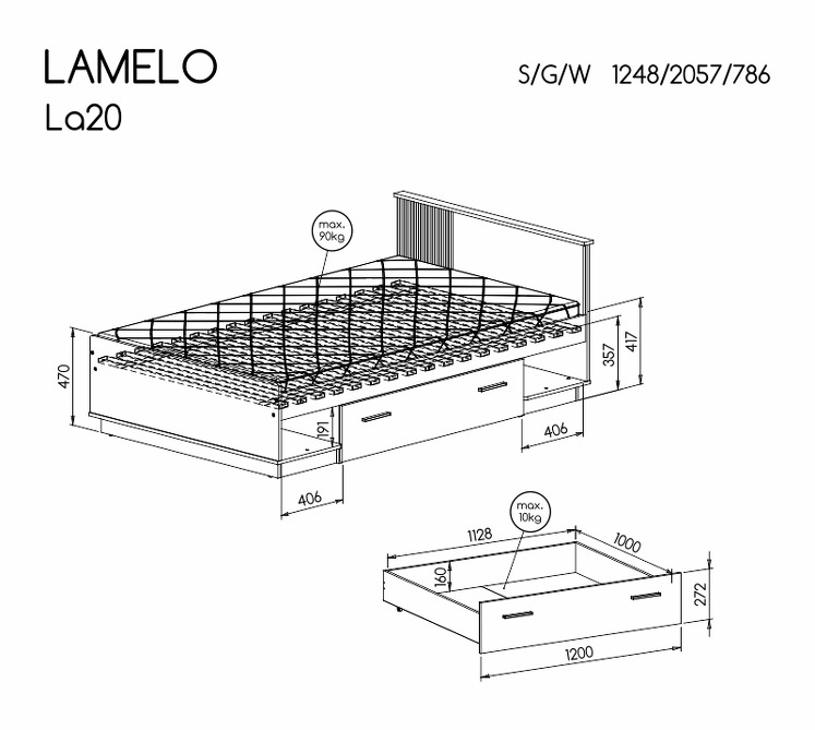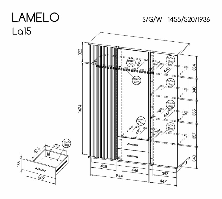 Rozměry jednotlivých komponentů ložnice Lamelo
