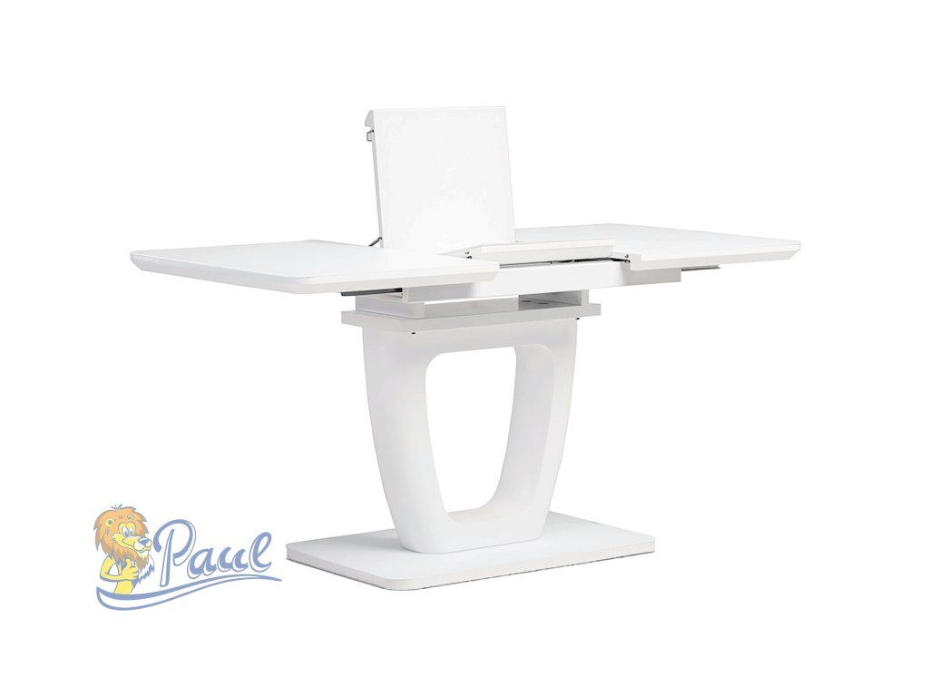 Designový jídelní rozkládací stůl o rozměru 110 + 40 x 75 cm. Vrchní stolová deska je tvrzeného skla tl. 4 mm v bílé barvě. Díl rozkladu je také krytý bílým sklem jako celá stolová deska, což nepatří ke standardům a řadí stůl do vyšší kategorie. Podkladová deska, centrální noha je z MDF je čistě bílá v matném provedení. Podesta je z také z MDF a krytá sklem v barvě. Ze spodní části opatřená plastovými kluzáky, eleminujícími poškození povrchů tvrdých podlah. Mechanické součásti jsou kovové. Stůl jistě zaujme svým nadčasovým designem i skvěloým zpracováním detailu a v neposlední řadě i barvou a stane se elegantním prvkem v moderních i klasicky laděných jídelnách, kuchyních a obývacích prostorách. Výška stolu je 76 cm. Ke stolu je možné umístit až 6 židlí.Doplňkové parametry