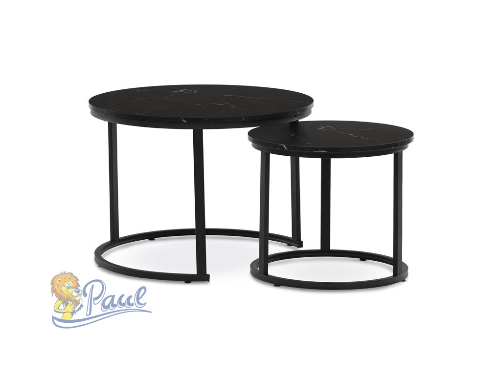 Set dvou konferenčních stolků s deskami z MDF v dekoru černého mramoru a pevnou kovovou podnoží v černém laku představuje moderní a praktické řešení pro obývací pokoj. Stolky mají kulatý tvar s hladkým povrchem, který je snadno udržovatelný a odolný vůči běžnému opotřebení. Kovová podnož zajišťuje stabilitu a dlouhou životnost, přičemž design s otevřenou spodní částí působí vzdušně a elegantně. Výška většího stolku je 50 cm, což umožňuje pohodlné využití jako odkládací plochy pro nápoje, knihy nebo dekorace. Kombinace černého mramorového dekoru a kovu vytváří nadčasový vzhled vhodný do moderních interiérů.Doplňkové parametry