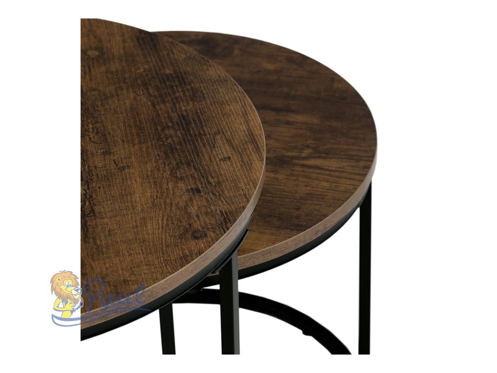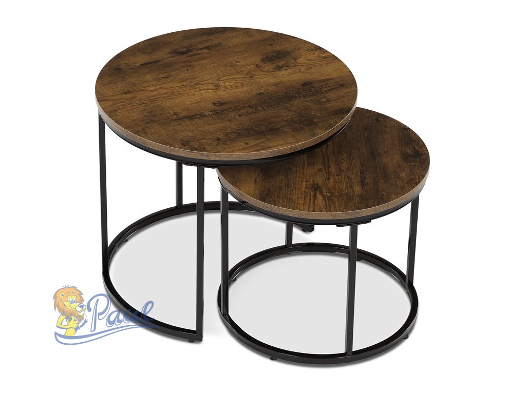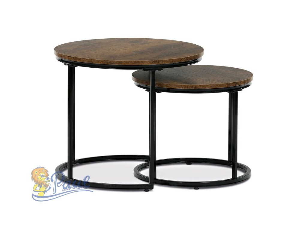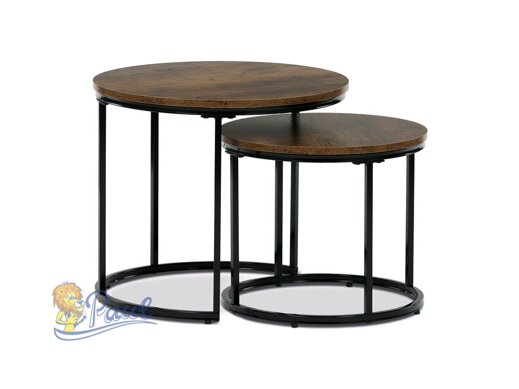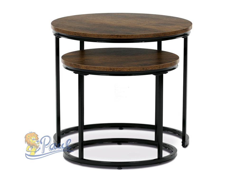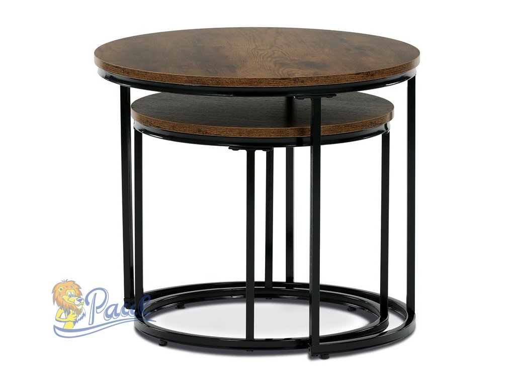 Set dvou odkládacích stolků značky Autronic v industriálním stylu je skvělou kombinací praktičnosti a moderního designu. Kruhové desky v dekoru starého dřeva dodávají stolům autentický vzhled, zatímco černé kovové nohy zajišťují stabilitu a elegantní kontrast. Stoly lze snadno zasunout pod sebe, což šetří místo a umožňuje variabilní využití. Ideální do obývacího pokoje jako stylový doplněk k pohovce nebo křeslu. Perfektní volba pro milovníky funkčního a nadčasového nábytku.Doplňkové parametry