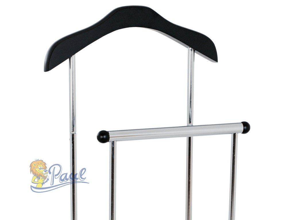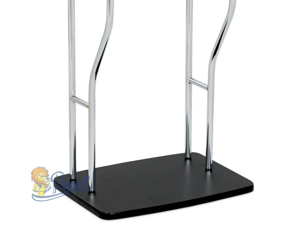 Němý sluha v černém matném provedení kombinuje pevnou MDF základnu s chromovanými kovovými prvky, které zajišťují stabilitu a dlouhou životnost. Výška 108 cm umožňuje pohodlné zavěšení oděvů na ramínko, zatímco spodní tyč slouží k zavěšení kalhot nebo šál. Design s čistými liniemi a kontrastem černé a chromu se hodí do moderních i klasických interiérů. Nosnost až 5 kg odpovídá běžnému domácímu použití. Praktický doplněk do ložnice či předsíně usnadňuje organizaci oblečení.Doplňkové parametry