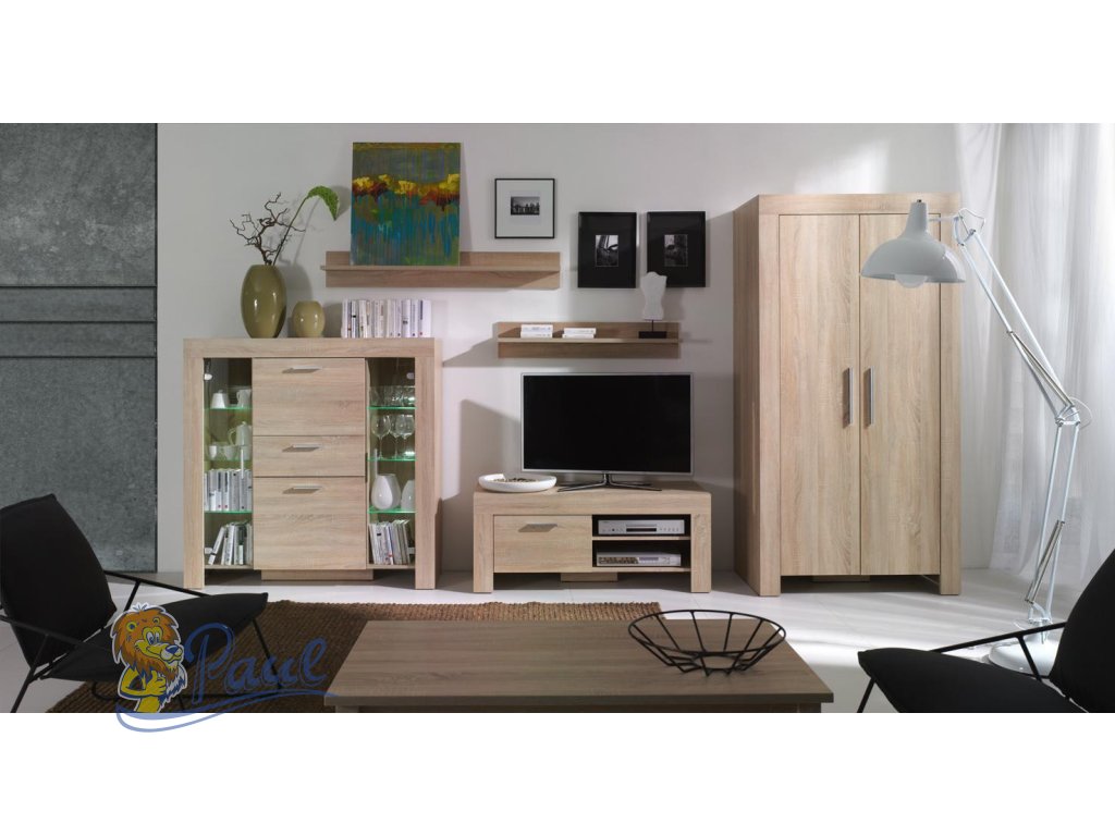 Komponenty v sestavě obývacího pokoje Cezar jsou dodávány v odstínu dub sonoma.