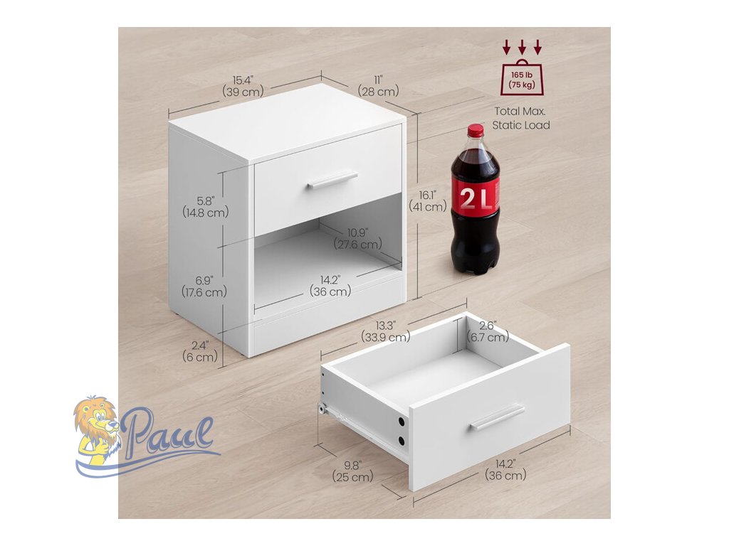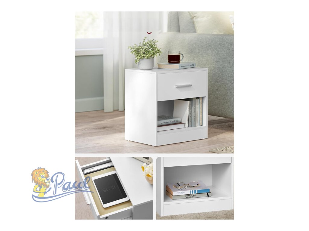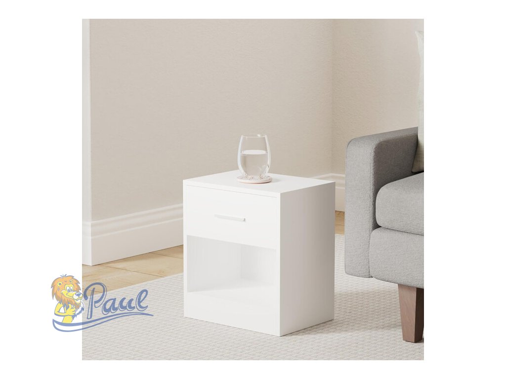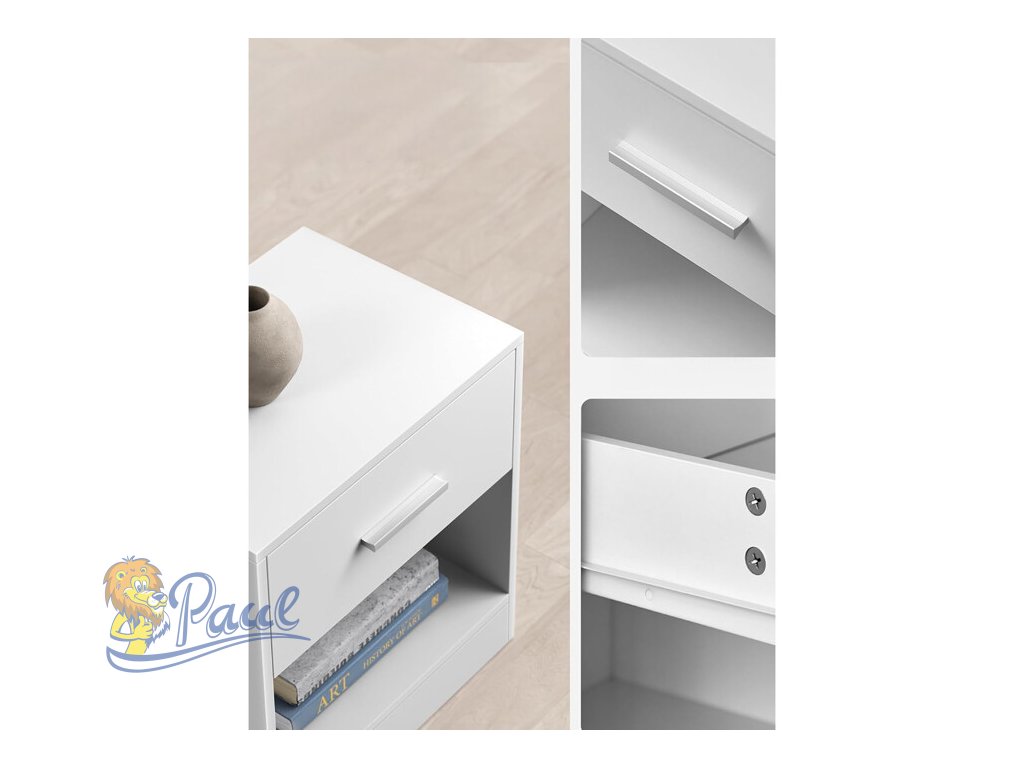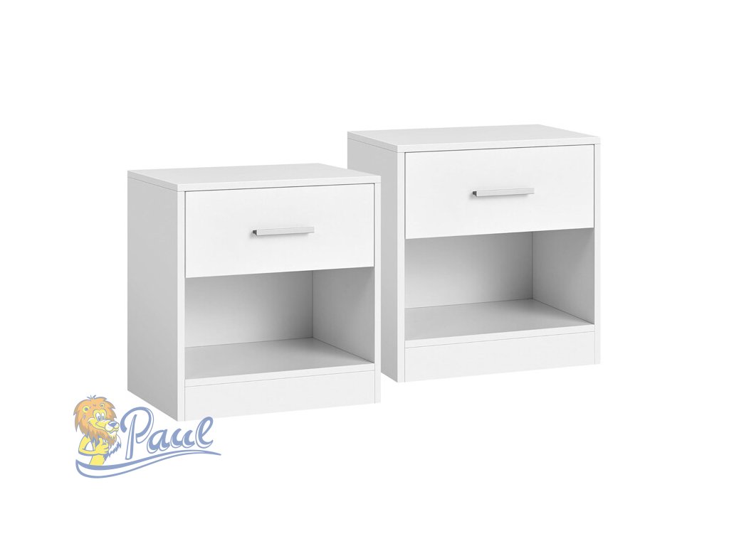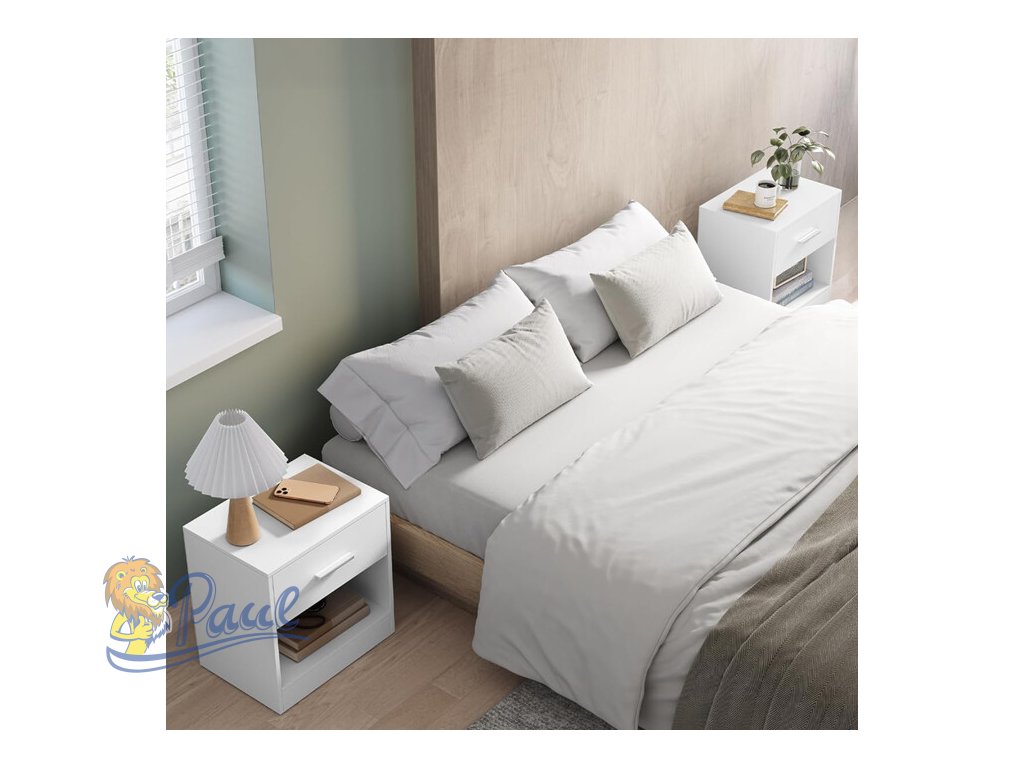 Sada dvou nočních stolků v bílém matném provedení je vyrobena z MDF desek, které zajišťují pevnost a snadnou údržbu. Každý stolek nabízí praktický úložný prostor v podobě zásuvky s kovovou úchytkou a otevřenou policí pod ní, což umožňuje pohodlné uspořádání drobností i knih. Kompaktní rozměry 39 × 28 × 41 cm umožňují snadné umístění vedle postele nebo v menších prostorách. Minimalistický design s čistými liniemi se hodí do různých stylů interiérů a díky kvalitnímu zpracování je sada navržena pro dlouhou životnost.Doplňkové parametry