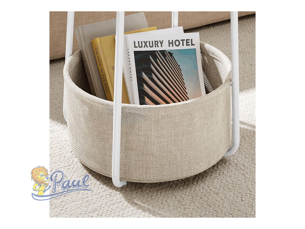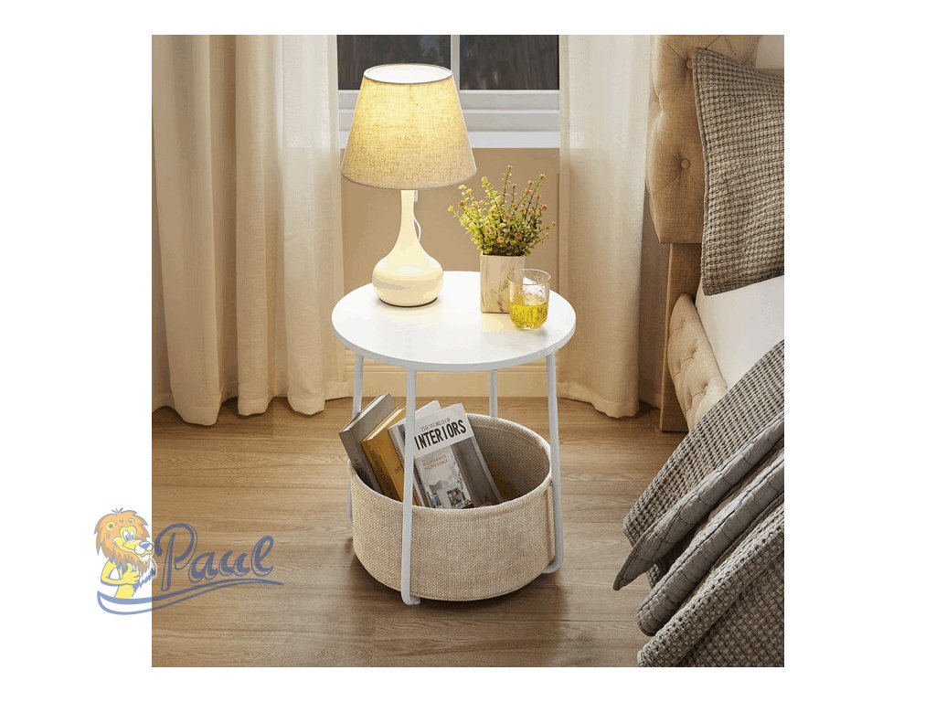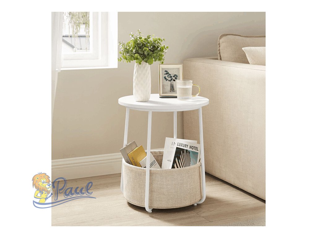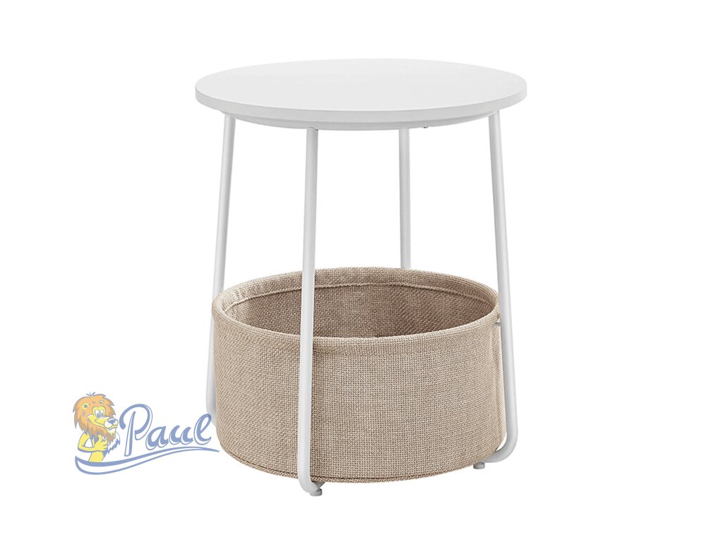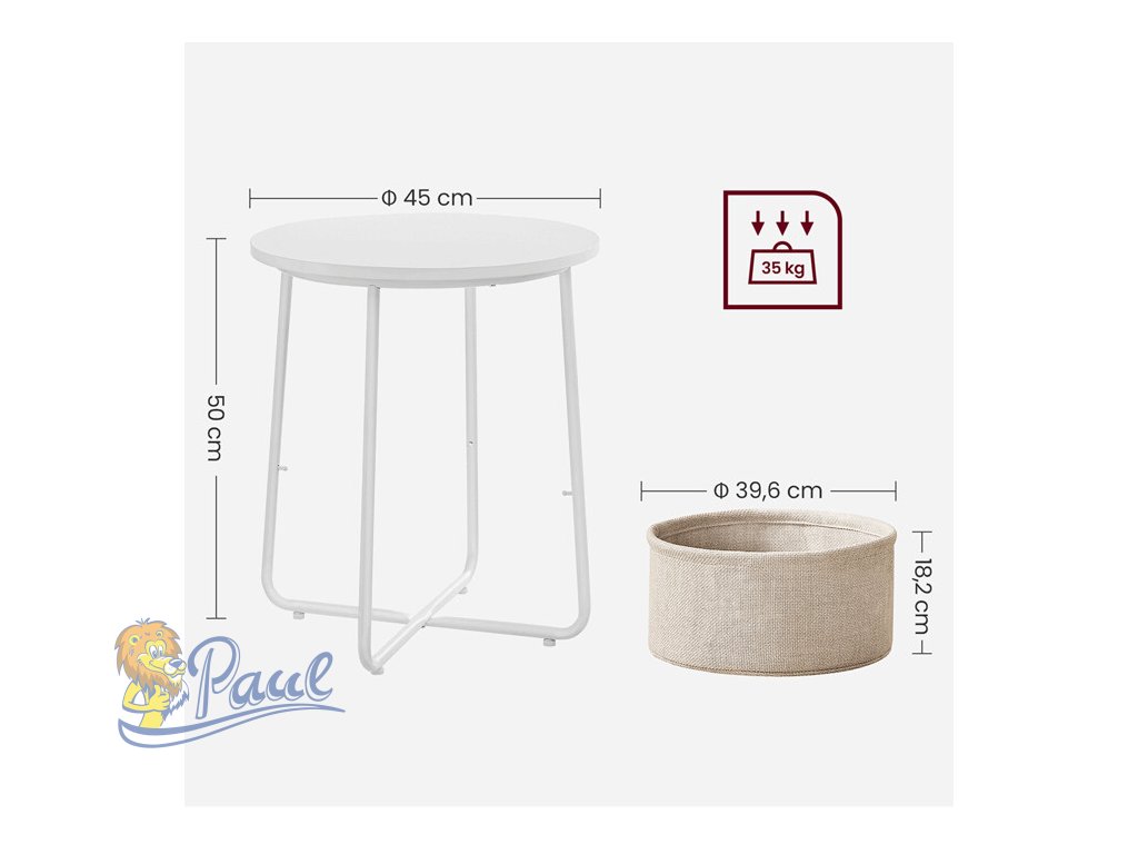 Odkládací stolek s kulatou deskou o průměru 45 cm a výškou 50 cm nabízí praktický doplněk do obývacího pokoje či ložnice. Deska je vyrobena z MDF v bílé barvě s hladkým povrchem, který se snadno udržuje. Stabilní kovové nohy v bílé barvě zajišťují pevnost a stabilitu stolku. Součástí je textilní koš v přírodním odstínu, který poskytuje dodatečný úložný prostor pro drobnosti a pomáhá udržet pořádek. Kompaktní rozměry a kombinace materiálů vytvářejí funkční a esteticky příjemný prvek interiéru.Doplňkové parametry