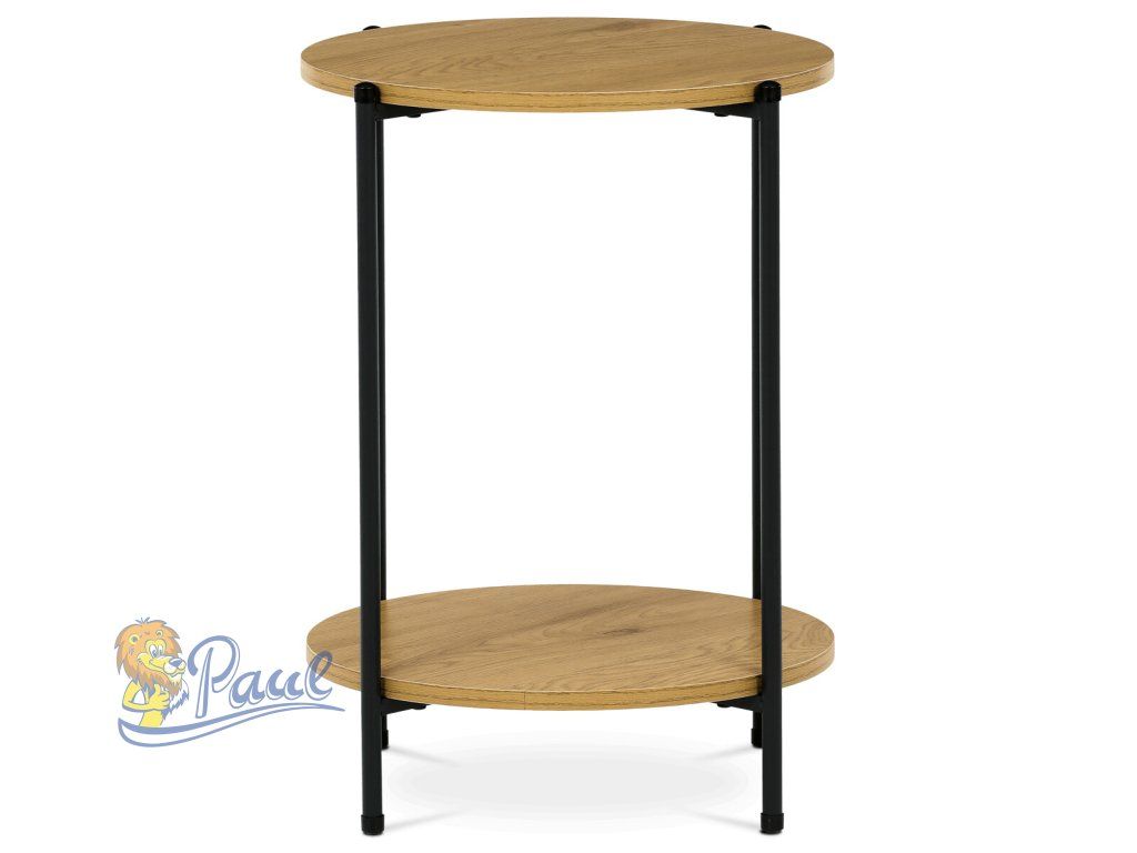 Moderní přístavný stolek značky Autronic spojuje minimalistický design a funkčnost. Kulaté desky v dekoru divokého dubu dodávají stolku přírodní eleganci, zatímco černě lakovaný kovový rám zajišťuje stabilitu a odolnost. Dvě praktické police nabízí dostatek prostoru pro uložení dekorací, knih nebo šálku kávy. Díky svému univerzálnímu vzhledu je tento stolek ideální volbou do obývacího pokoje, ložnice nebo kanceláře. Vneste do svého interiéru styl a praktičnost s tímto nadčasovým kouskem!Doplňkové parametry