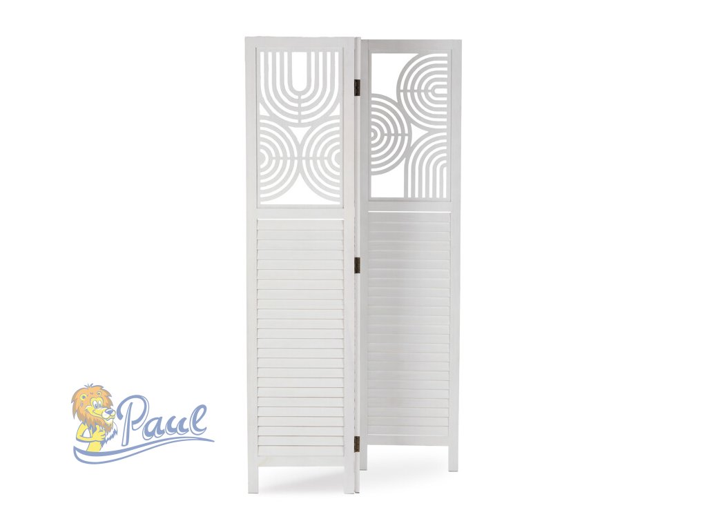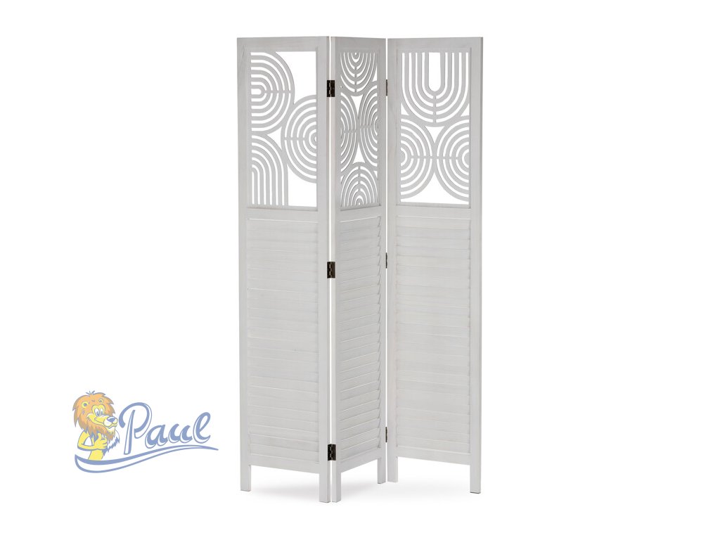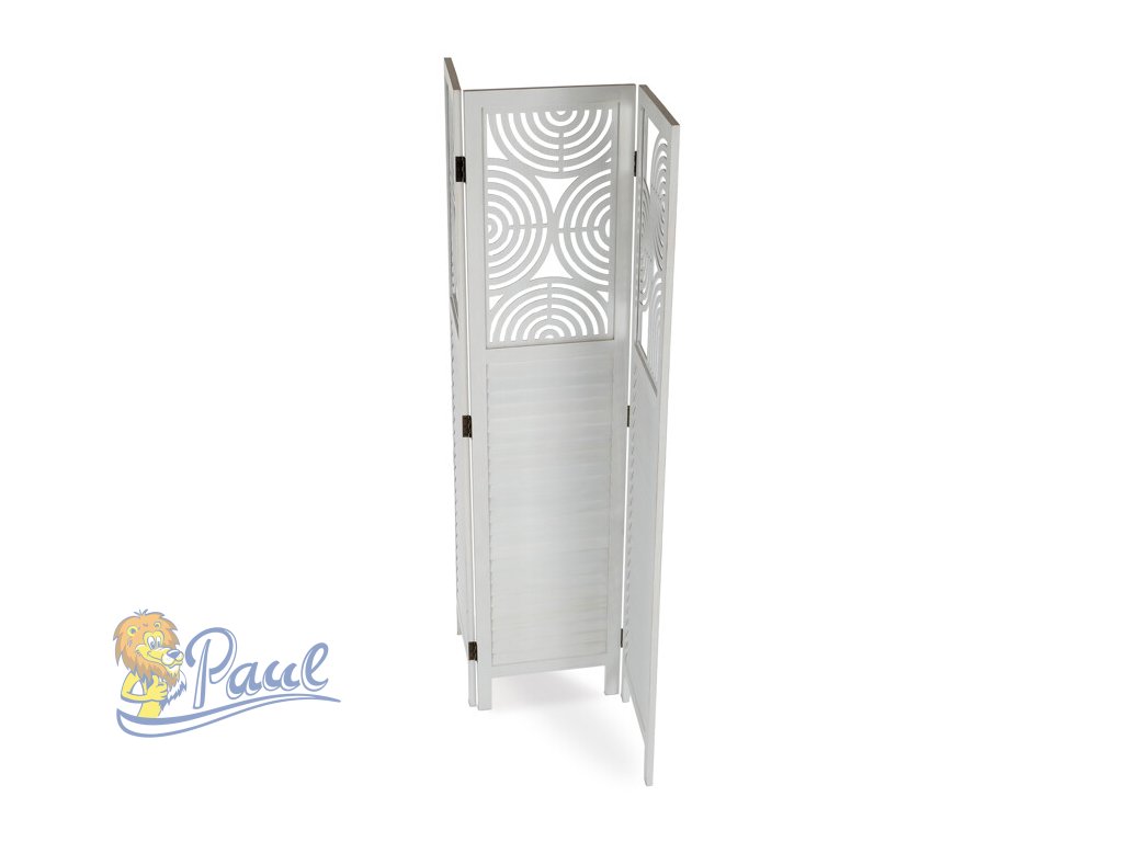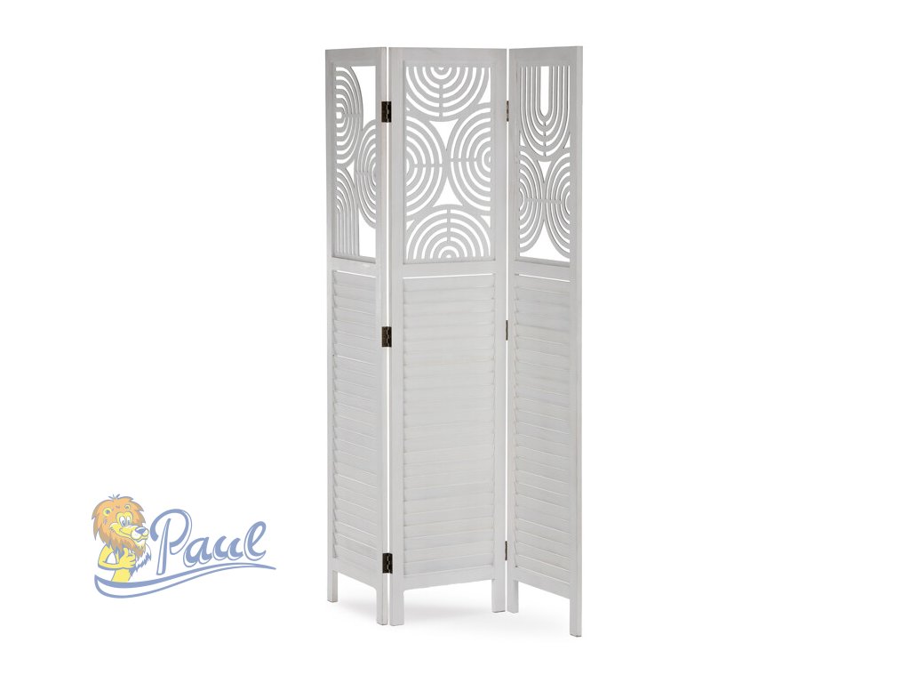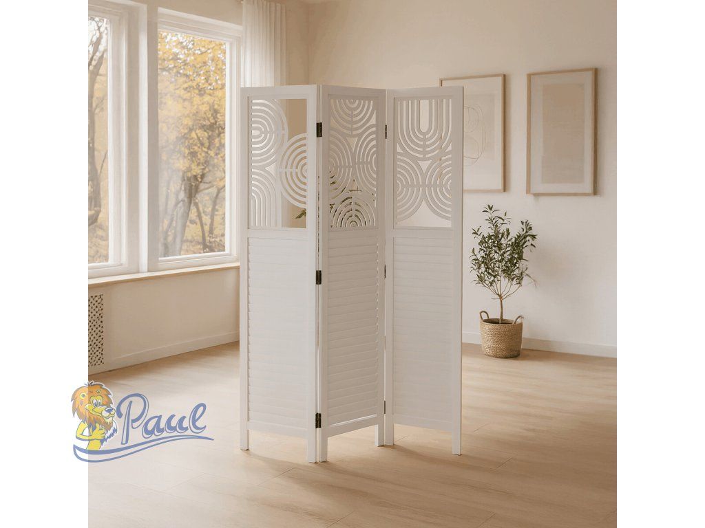 Třípanelový paraván vyrobený z masivního smrkového dřeva v bílé barvě nabízí praktické řešení pro rozdělení prostoru v interiéru. Každý díl je doplněn dekorativními výřezy v horní části, které propouštějí světlo a zároveň zachovávají soukromí. Masivní materiál zajišťuje pevnost a stabilitu, zatímco přírodní textura dřeva dodává výrobku přirozený vzhled. Paraván je vhodný pro použití v obývacích pokojích, ložnicích nebo kancelářích, kde pomáhá vytvořit útulné a funkční prostředí. Díky skládací konstrukci je snadno přemístitelný a skladovatelný.Doplňkové parametry