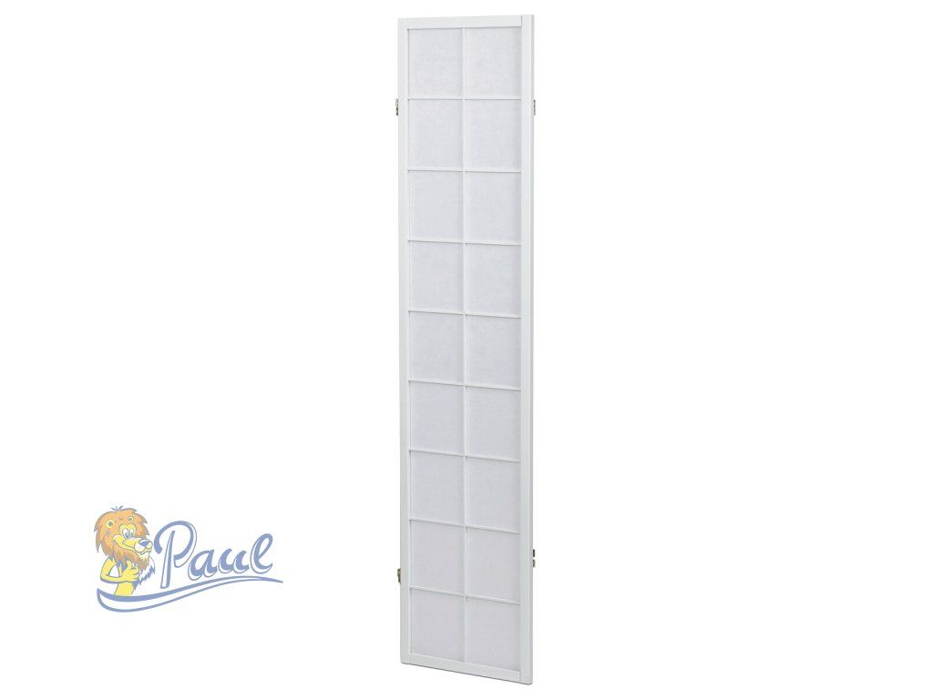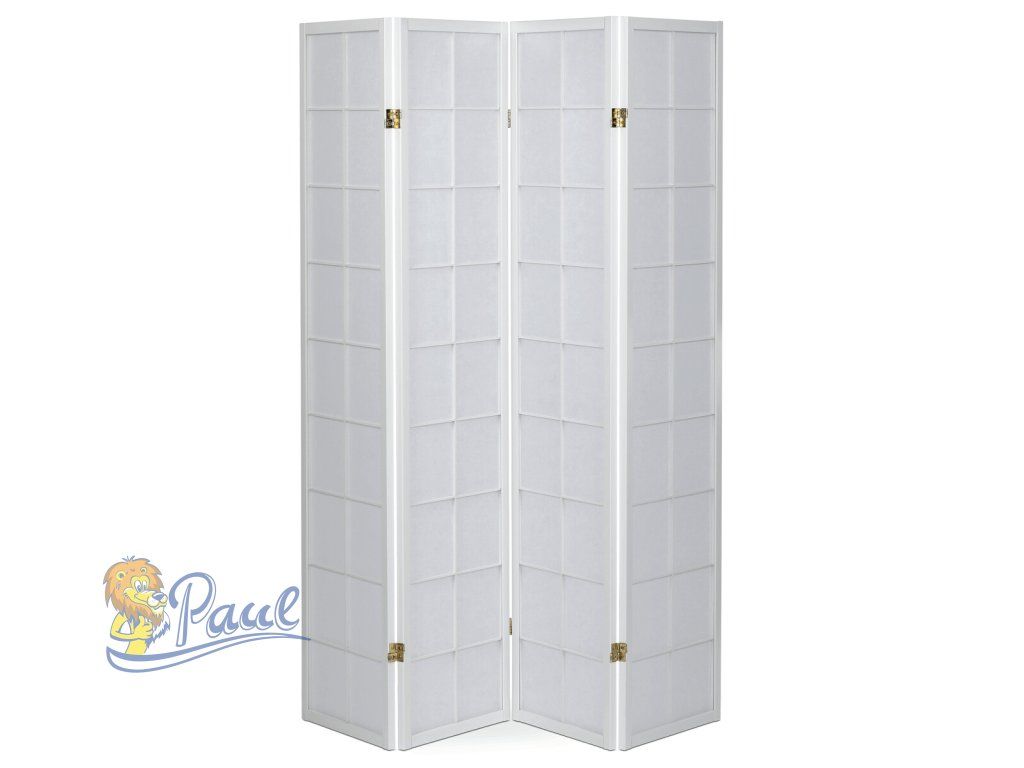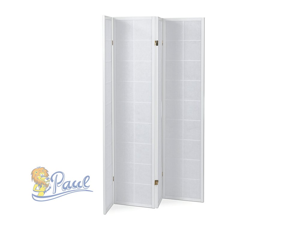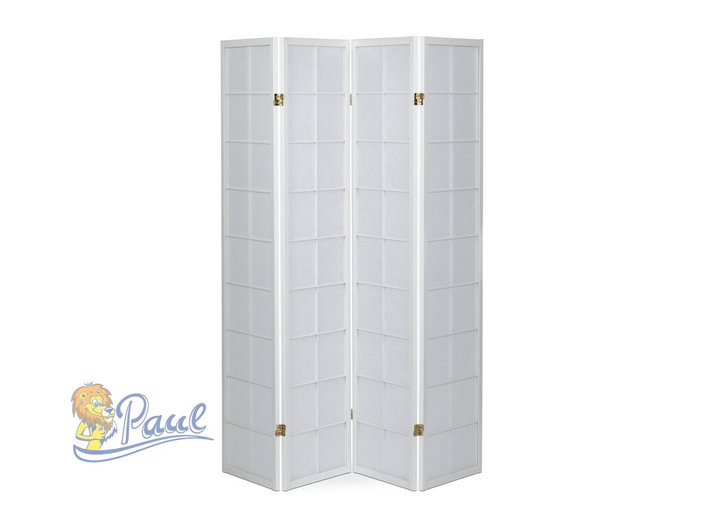 4dílný volně stojící paraván s konstrukcí z masivního smrkového dřeva v bílé barvě a výplní z bílé netkané textilie. Plní nejen funkci okrasnou, ale také praktickou. Lze jej použít jako zástěnu nebo diskrétní i optickou dělící příčku nejen v bytě, ale i v komerčních prostorách. Díky skládací konstrukci a celkové nízké hmotnosti jej lze bez problémů přemísťovat a manipulovat s ním. Kombinace dřeva a netkané textilie působí vzdušným dojmem, stylově lze paraván umístit do jakkoli zařízeného interiéru. V každém si najde zasloužené místo. Výška paravánu je 178 cm, šíře jednoho dílu 43,5 cm, celková plná šíře je 176 cm. Tloušťka stěny jsou 2 cm. Stěny paravánu jsou k sobě připevněny kovovými pomosazenými panty. Celková hmotnost je 6,5 kg.Doplňkové parametry