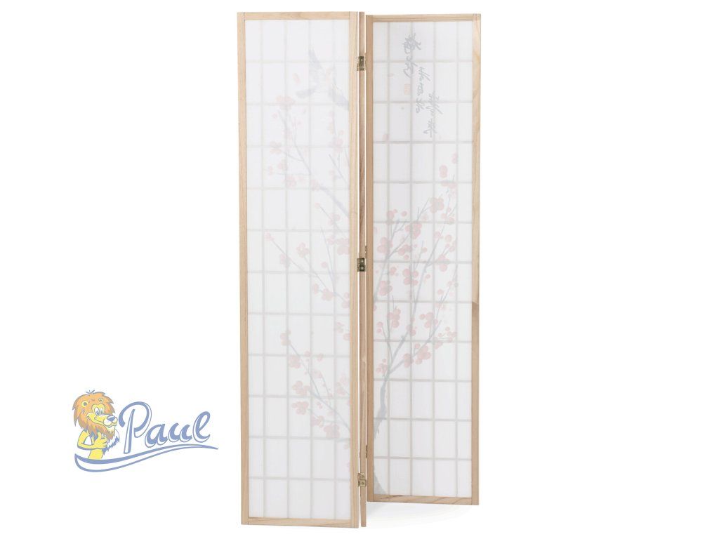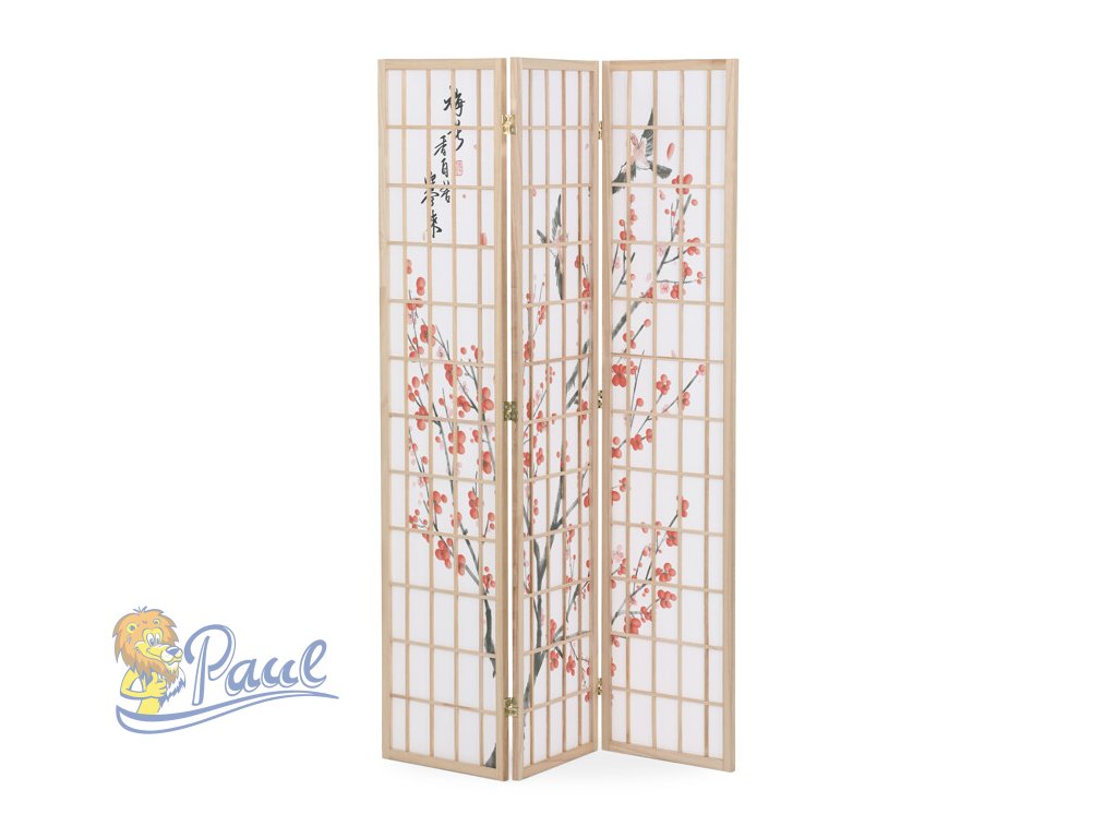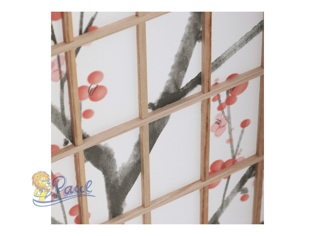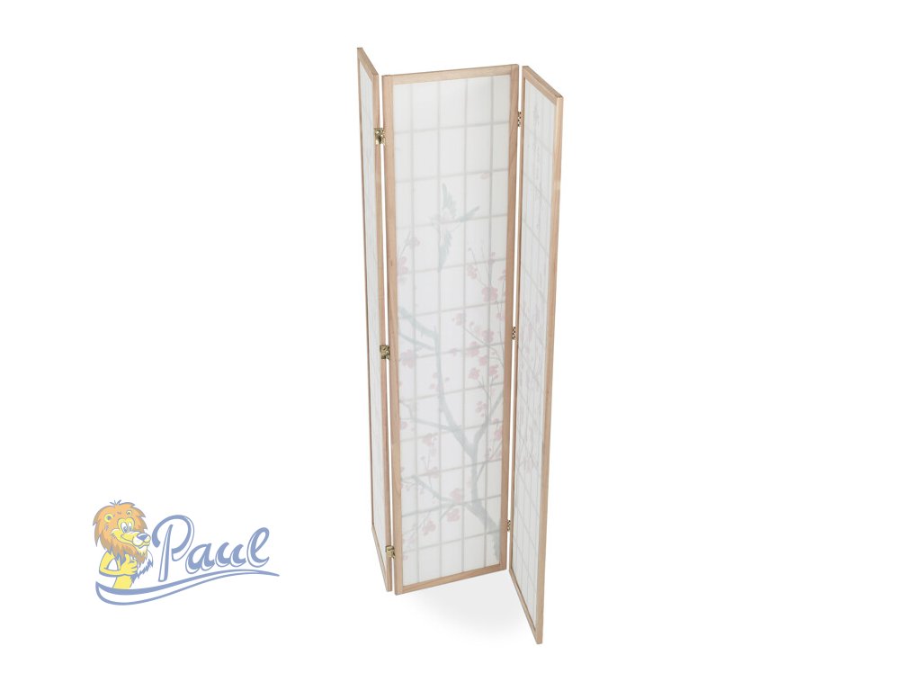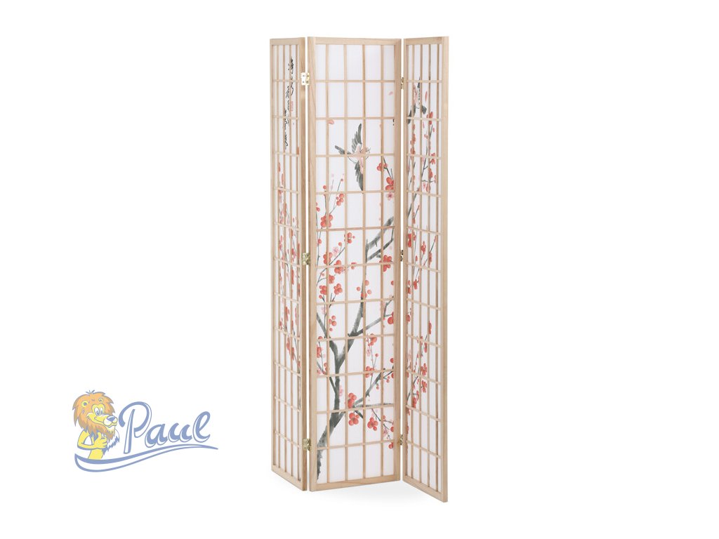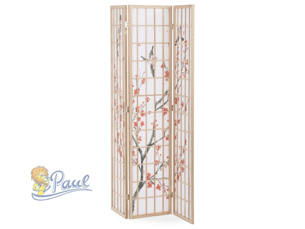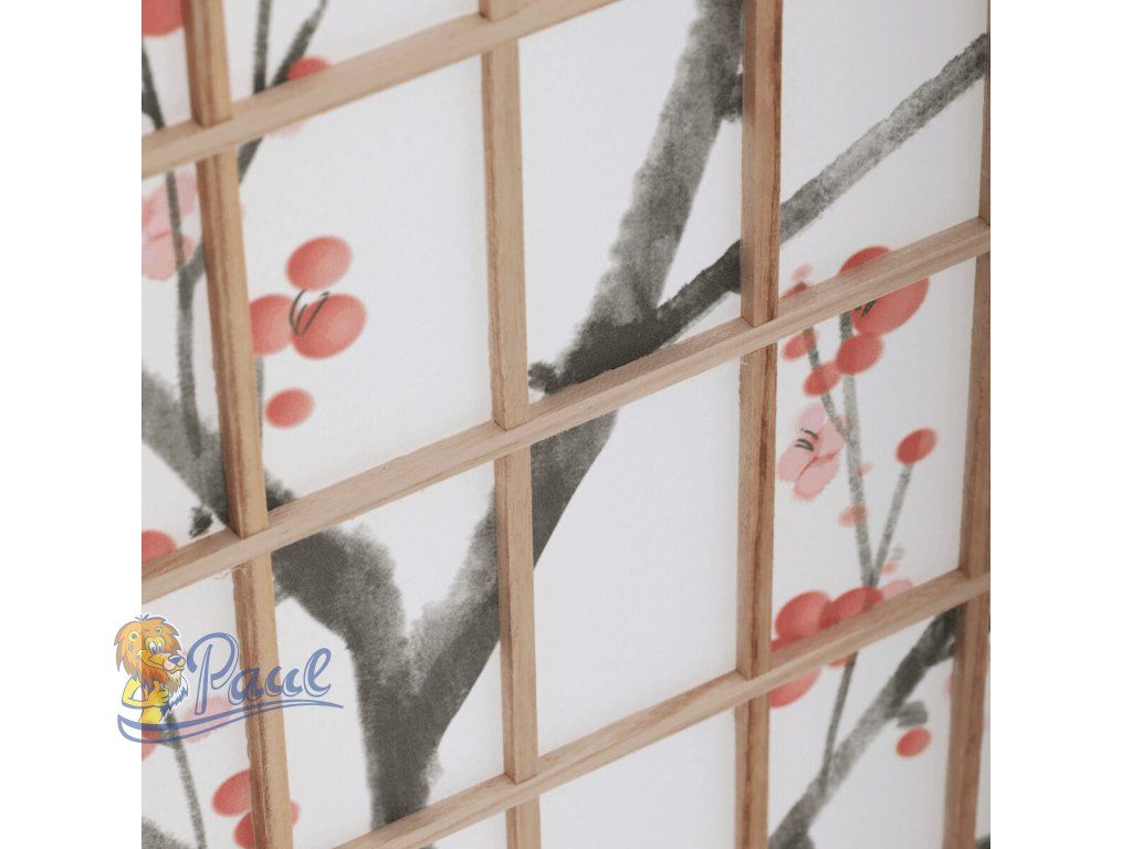 Třípanelový paraván z masivního smrkového dřeva v přírodním odstínu nabízí lehkou a vzdušnou přepážku s bílou netkanou textilií, která je zdobená jemným motivem větví s květy a ptáky v černých a červených tónech. Pevné dřevěné rámy zajišťují stabilitu a zároveň umožňují snadné skládání a přemístění. Paraván je vhodný pro optické oddělení prostoru v interiéru, přičemž jeho přírodní barevnost a decentní dekor vytvářejí klidnou atmosféru. Díky lehkému materiálu se snadno udržuje a je ideální pro použití v obývacích pokojích, ložnicích nebo kancelářích.Doplňkové parametry