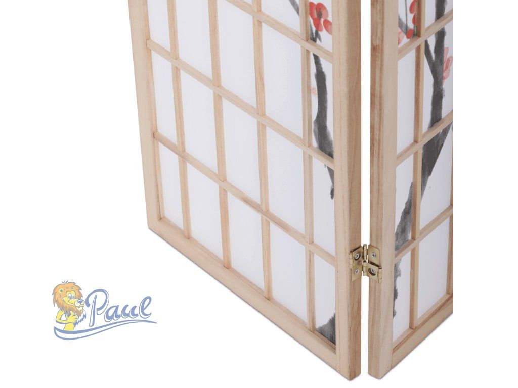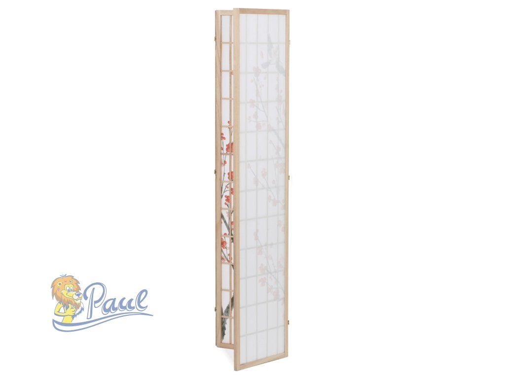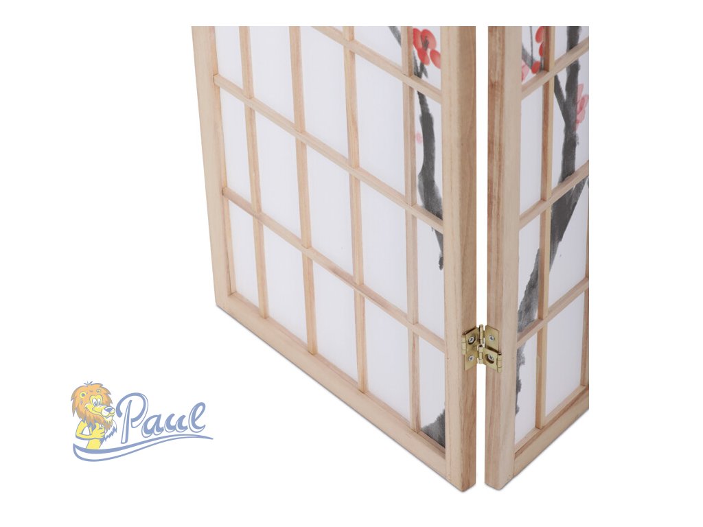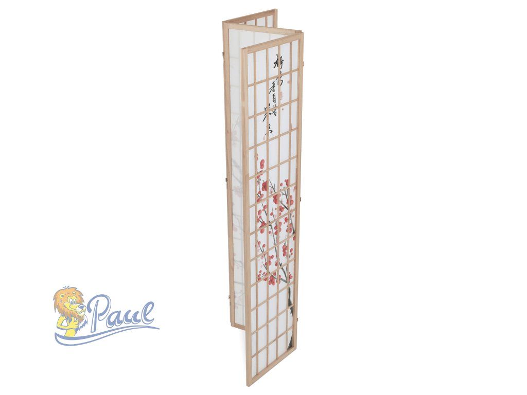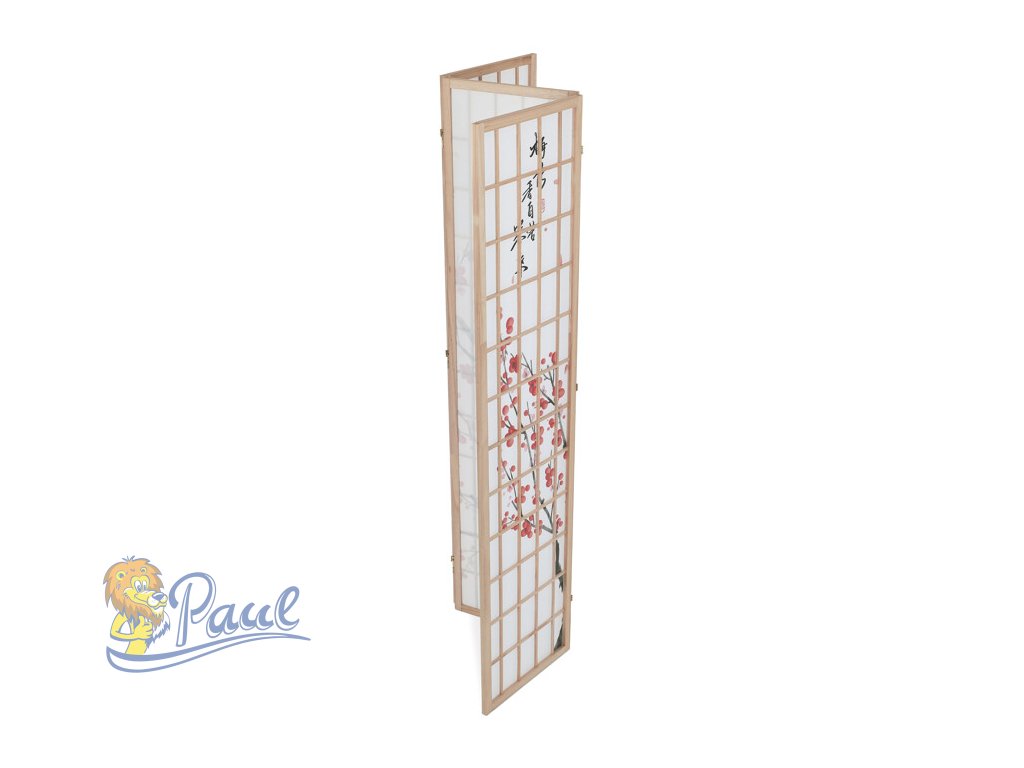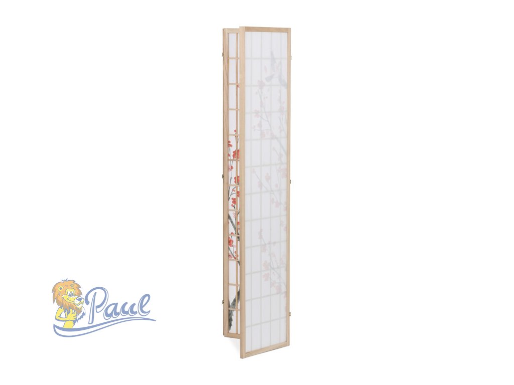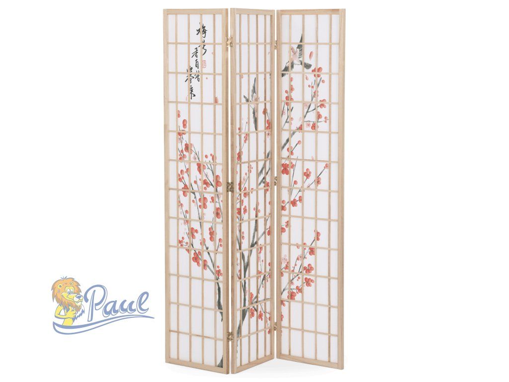 Třípanelový paraván z masivního smrkového dřeva v přírodním odstínu nabízí lehkou a vzdušnou přepážku s bílou netkanou textilií, která je zdobená jemným motivem větví s květy a ptáky v černých a červených tónech. Pevné dřevěné rámy zajišťují stabilitu a zároveň umožňují snadné skládání a přemístění. Paraván je vhodný pro optické oddělení prostoru v interiéru, přičemž jeho přírodní barevnost a decentní dekor vytvářejí klidnou atmosféru. Díky lehkému materiálu se snadno udržuje a je ideální pro použití v obývacích pokojích, ložnicích nebo kancelářích.Doplňkové parametry