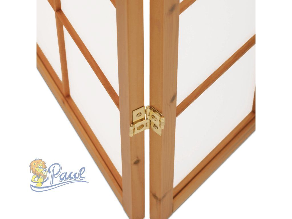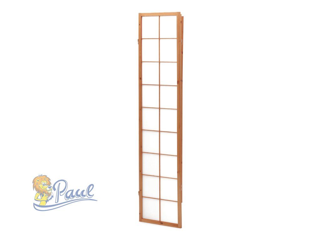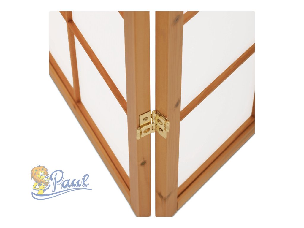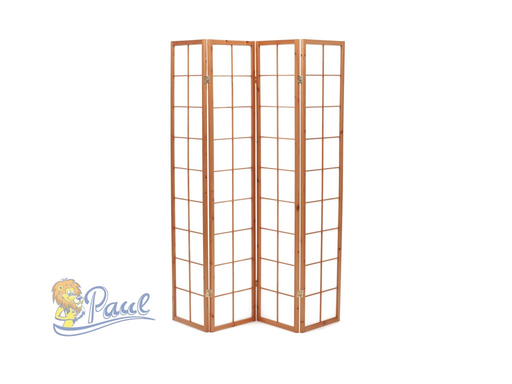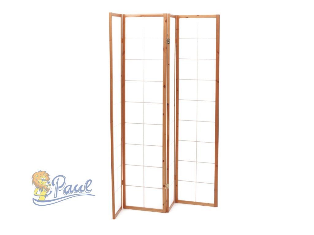 4dílný volně stojící paraván s konstrukcí z masivního smrkového dřeva v přírodní barvě a výplní z bílé netkané textilie. Plní nejen funkci okrasnou, ale také praktickou. Lze jej použít jako zástěnu nebo diskrétní i optickou dělící příčku nejen v bytě, ale i v komerčních prostorách. Díky skládací konstrukci a celkové nízké hmotnosti jej lze bez problémů přemísťovat a manipulovat s ním. Kombinace dřeva a netkané textilie působí vzdušným dojmem, stylově lze paraván umístit do jakkoli zařízeného interiéru. V každém si najde zasloužené místo. Výška paravánu je 178 cm, šíře jednoho dílu 43,5 cm, celková plná šíře je 176 cm. Tloušťka stěny jsou 2 cm. Stěny paravánu jsou k sobě připevněny kovovými pomosazenými panty. Celková hmotnost je 6,5 kg.Doplňkové parametry