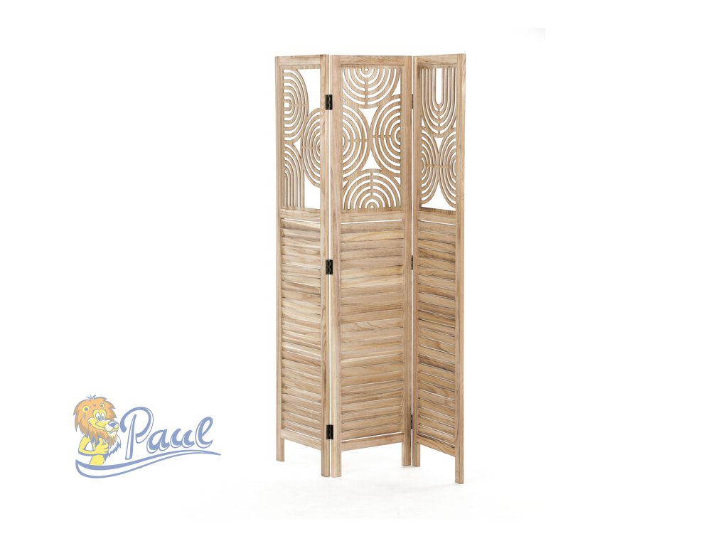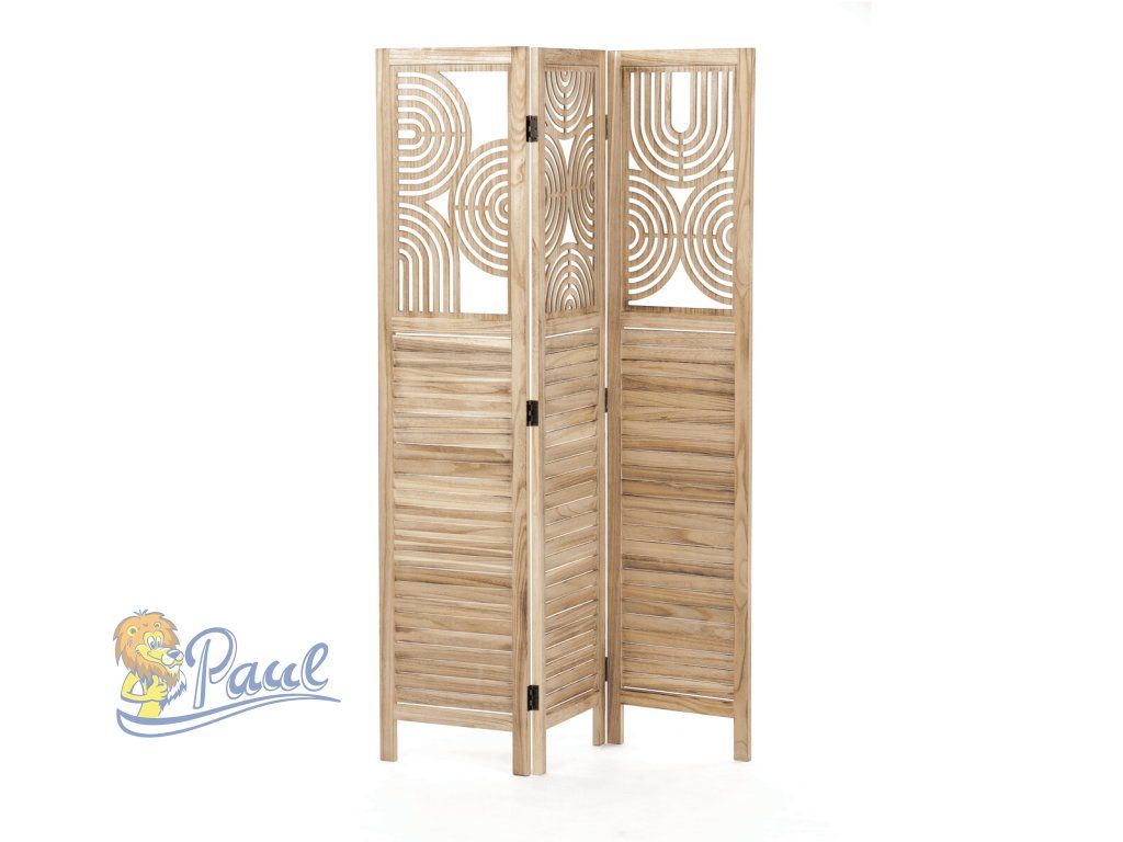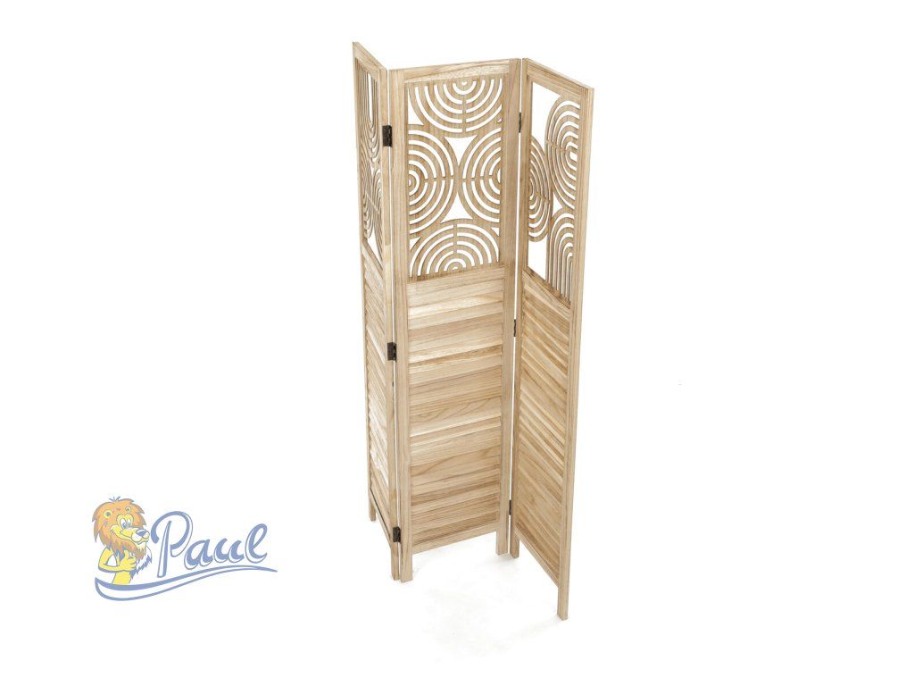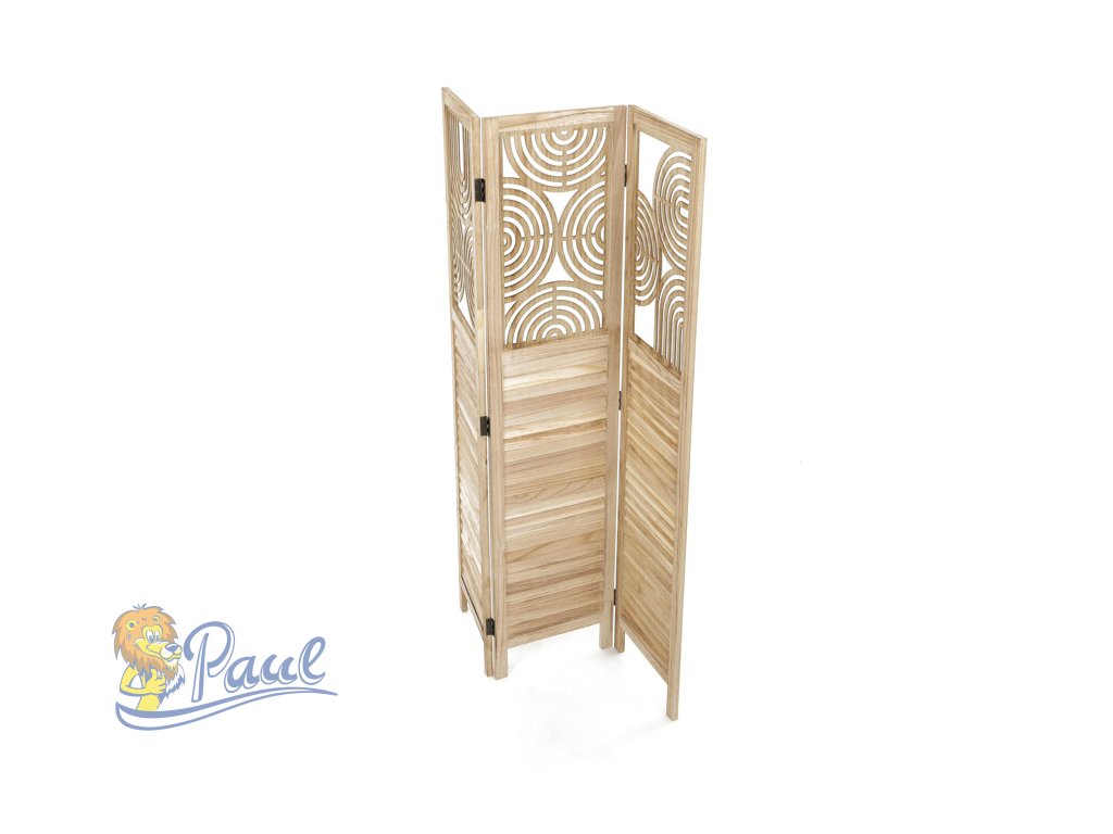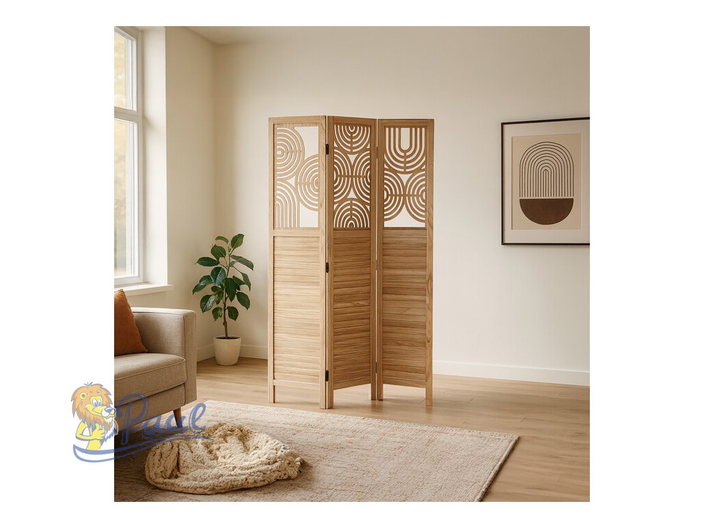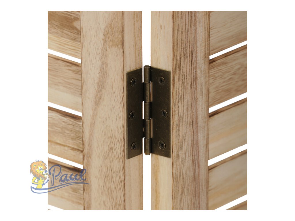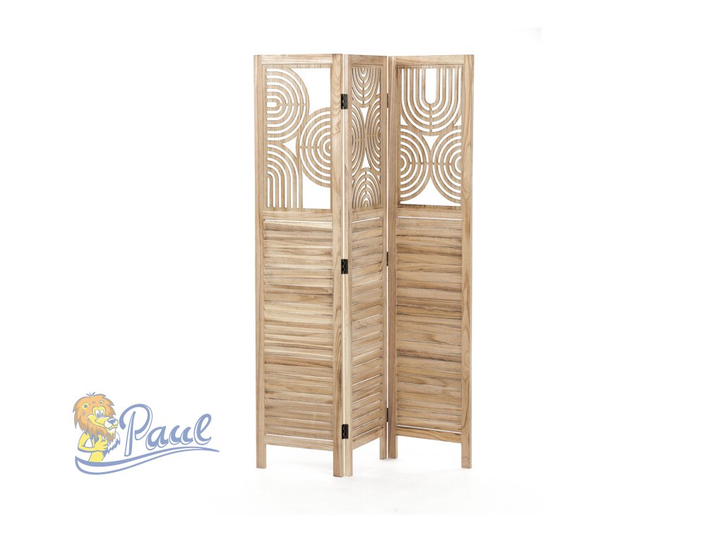 Třídílný dřevěný paraván z masivu smrku v přírodním odstínu kombinuje pevné provedení s dekorativní perforací horní části, která vytváří zajímavý vizuální efekt. Každá část je spojena kovovými panty umožňujícími flexibilní nastavení úhlu a snadné přenášení či skladování. Paraván slouží jako praktický prvek pro rozdělení prostoru nebo zvýšení soukromí v interiéru, přičemž přírodní dřevěný dekor přináší do místnosti teplý a přirozený vzhled. Povrch je upraven tak, aby materiál byl snadno udržovatelný a odolný vůči běžnému opotřebení. Rozměry a konstrukce zajišťují stabilitu a dlouhou životnost produktu.Doplňkové parametry