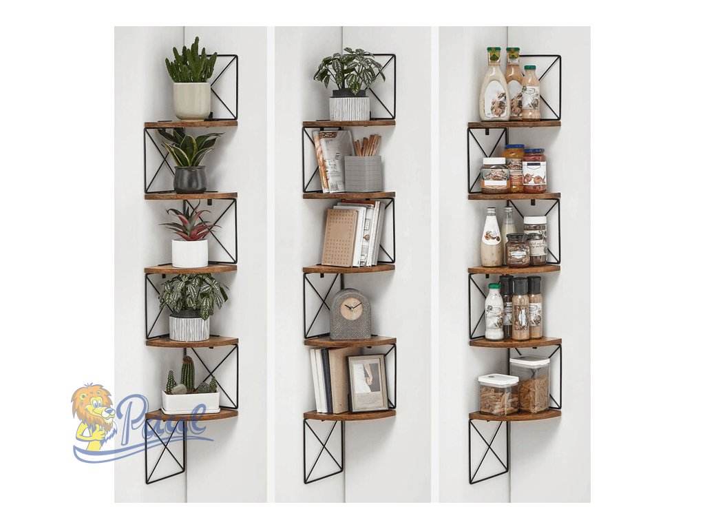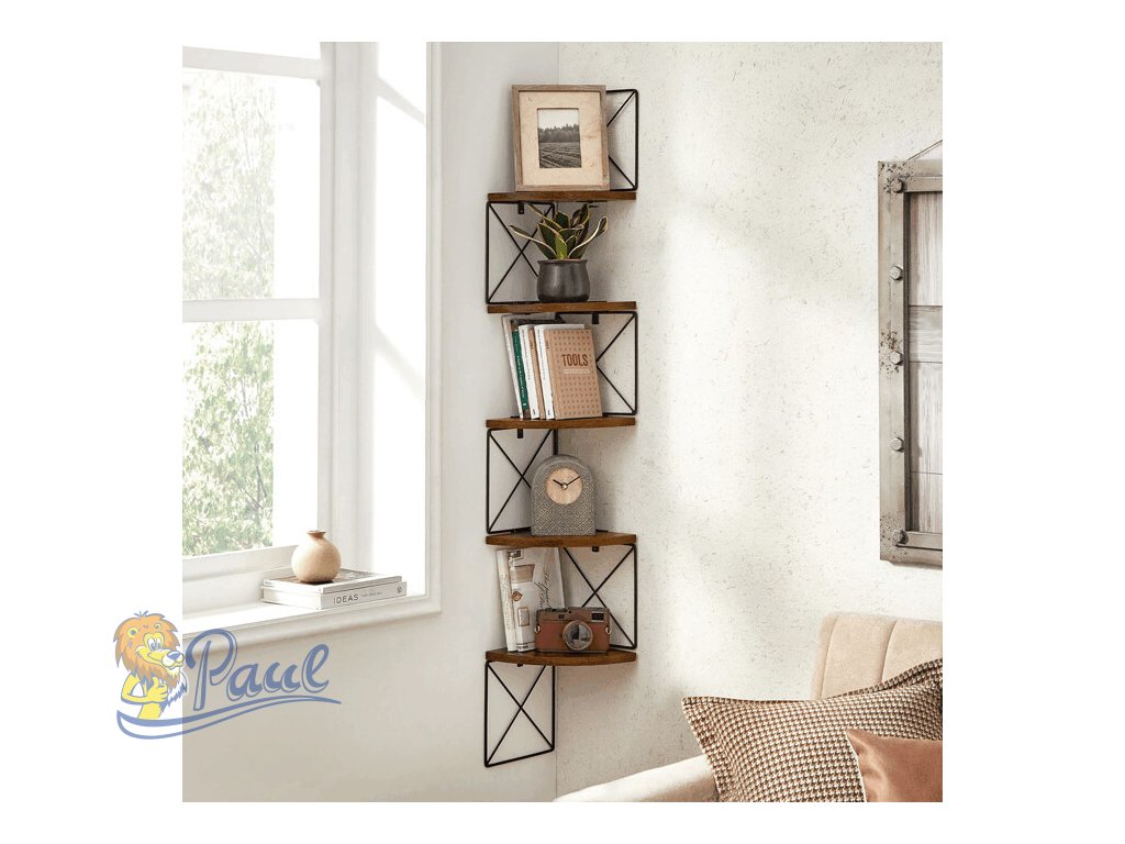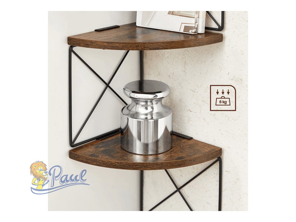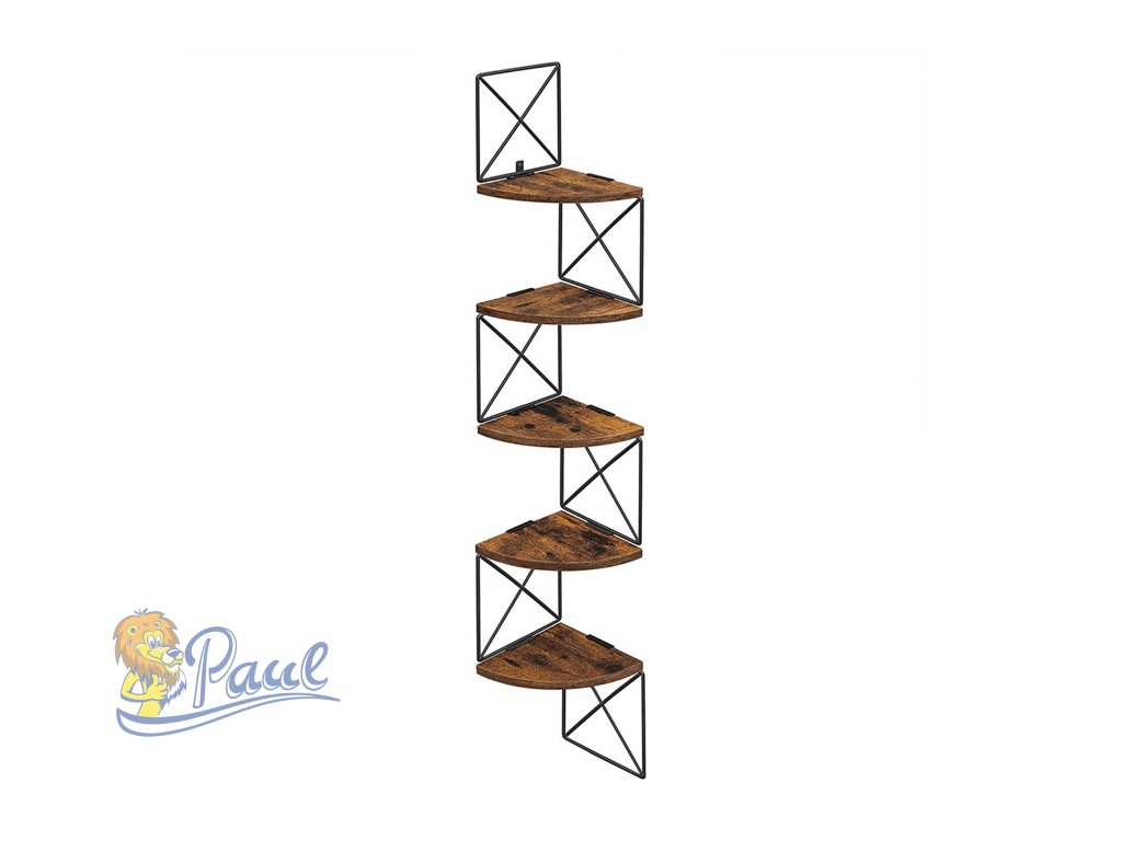 Nástěnná rohová police v dekoru old wood kombinuje teplé hnědé odstíny MDF desek s černým kovovým rámem, který zajišťuje stabilní upevnění a zajímavý industriální vzhled. Police je tvořena pěti segmenty ve tvaru čtvrtkruhu, které jsou navzájem propojeny kovovými prvky s křížovým vzorem, což přispívá k pevnosti a zároveň vytváří vzdušný design. Rozměry 127,5 × 20 cm umožňují efektivní využití rohových prostorů pro vystavení dekorací či drobných předmětů. Povrch MDF desek je upraven tak, aby připomínal strukturu starého dřeva, což dodává policím rustikální charakter. Díky kombinaci materiálů a konstrukčnímu řešení je police vhodná do moderních i vintage interiérů.Doplňkové parametry