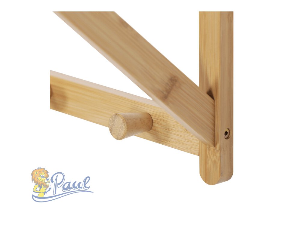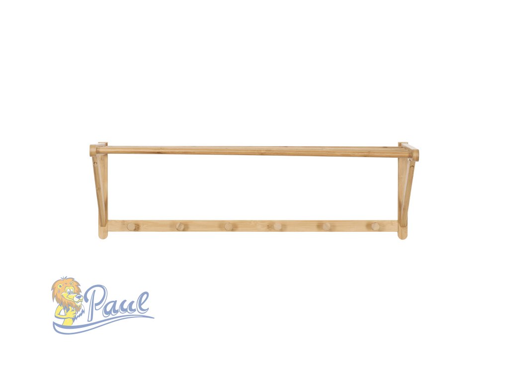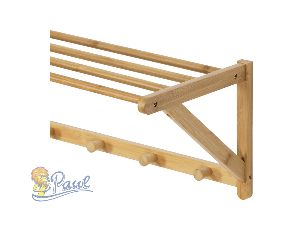 Nástěnná police s věšáky je vyrobena z masivního bambusu v přírodním odstínu, který přináší do interiéru příjemnou a teplou atmosféru. Police nabízí praktické horní místo pro odkládání drobných předmětů či dekorací, zatímco spodní část je vybavena šesti pevnými věšáky pro zavěšení kabátů, klobouků nebo tašek. Bambusové provedení se snadno udržuje a díky pevné montáži na stěnu zajišťuje stabilitu a dlouhou životnost. Design s hladce zaoblenými hranami a přírodní texturou materiálu podtrhuje jednoduchost a funkčnost produktu. Rozměry a nosnost odpovídají běžným požadavkům na domácí i kancelářské využití.Doplňkové parametry