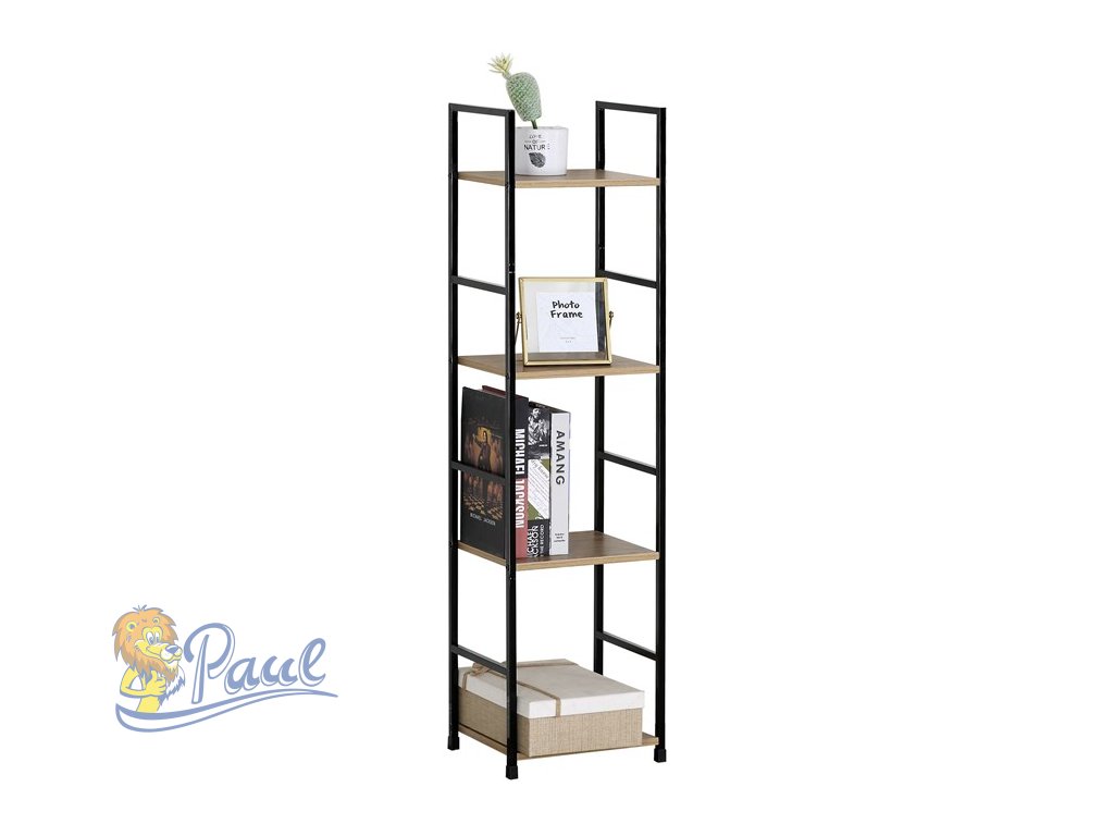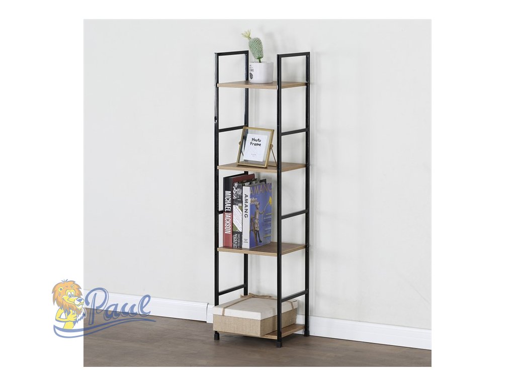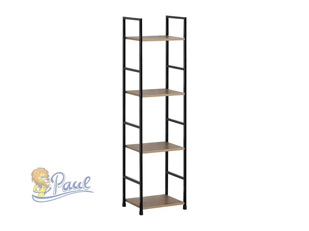 Regál, 4 police, dekor dub, MDF, černý lak