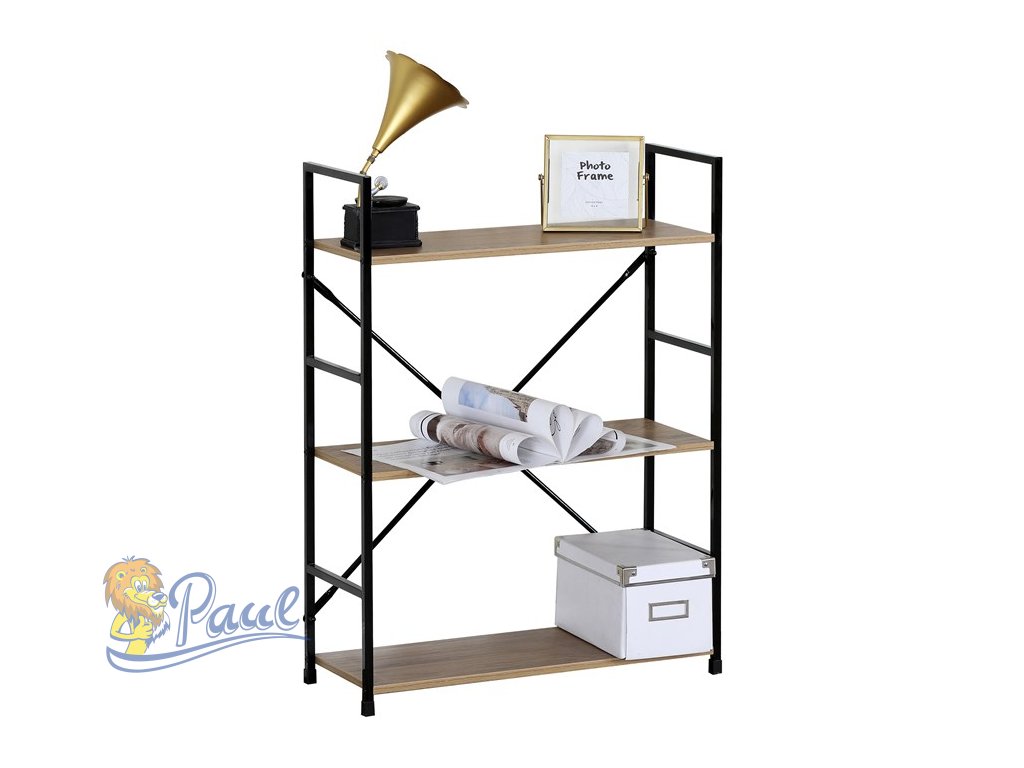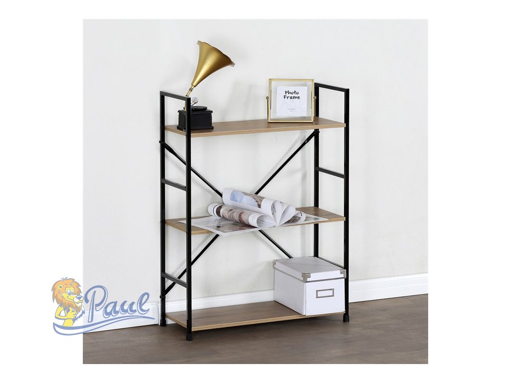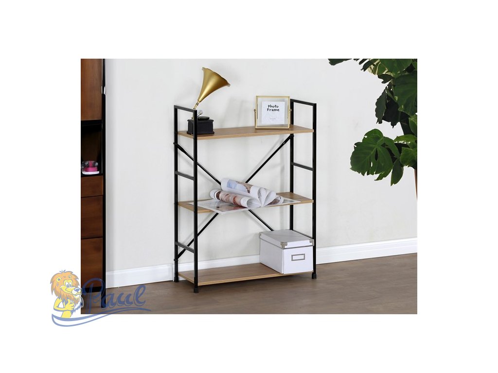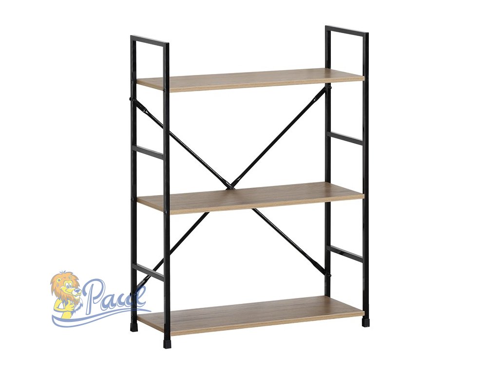 Odlehčený policový regál. Kostra vyrobena z kovových hranatých profilů černé barvy. Na police je použita MDF deska s povrchovou úpravou 3D folie v textuře dubu. Pro lepší stabilitu je na zadní straně kovová výztuha ve tvaru písmene X. Balení obsahuje sadu umožňující připevnění ke stěně.Doplňkové parametry