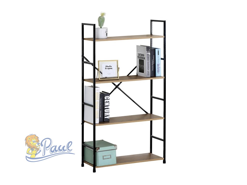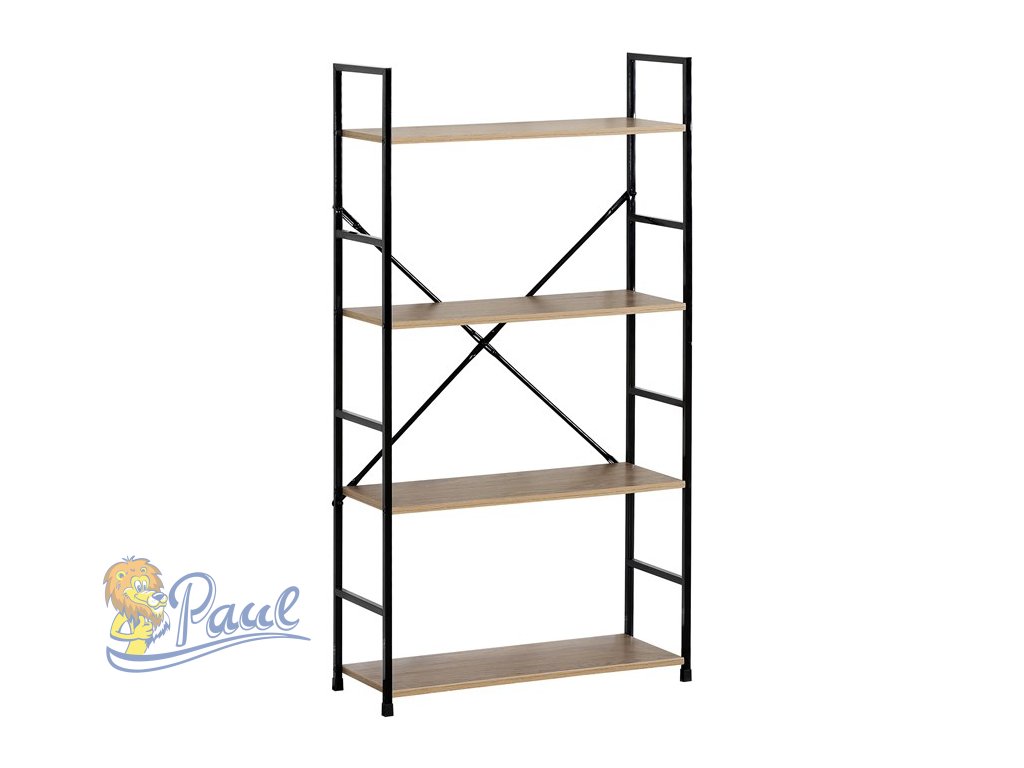 Odlehčený policový regál. Kostra vyrobena z kovových hranatých profilů černé barvy. Na police je použita MDF deska s povrchovou úpravou 3D folie v textuře dubu. Pro lepší stabilitu je na zadní straně kovová výztuha ve tvaru písmene X. Balení obsahuje sadu umožňující připevnění ke stěně.Doplňkové parametry