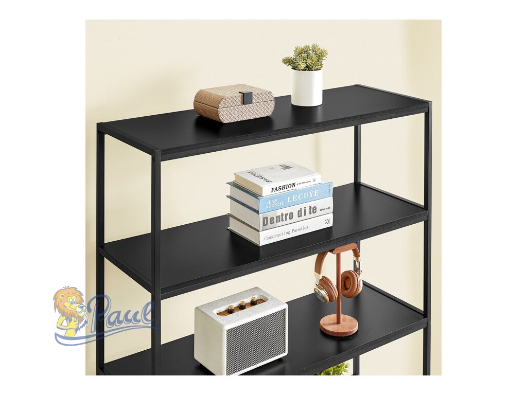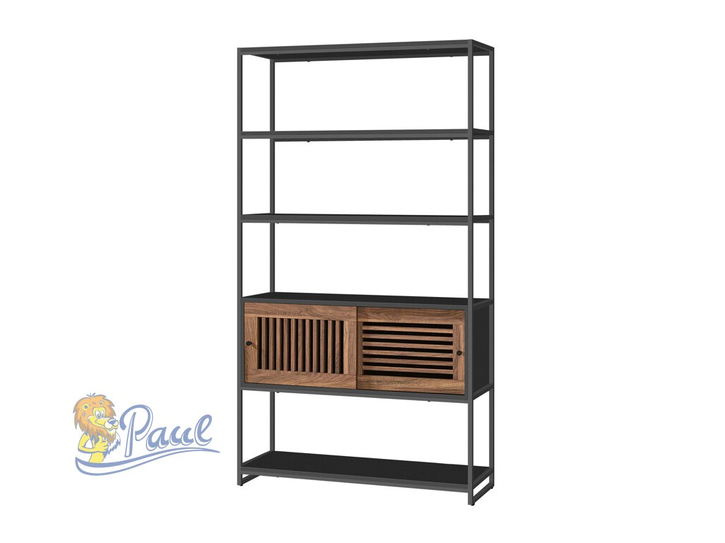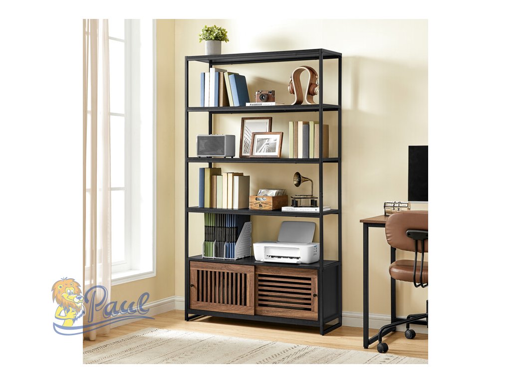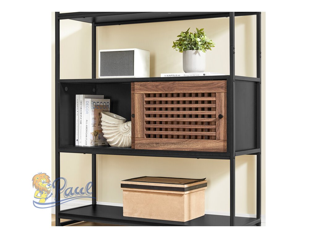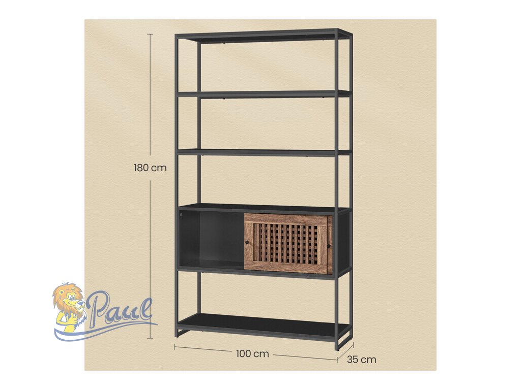 Regál s rozměry 100x35x180 cm kombinuje pevný kovový rám v černé barvě s policemi z MDF desek v odstínu Old wood, které dodávají nábytku přírodní vzhled. Kovové nosné vzpěry zajišťují stabilitu a dlouhou životnost celé konstrukce. Čtyři otevřené police nabízejí dostatek prostoru pro vystavení dekorací nebo uložení knih, zatímco spodní část je vybavena uzavíratelnou skříňkou s posuvnými dvířky s dekorativním lamelovým vzorem. Design regálu je moderní a zároveň funkční, vhodný do obývacích pokojů, pracovních prostor i komerčních interiérů.Doplňkové parametry