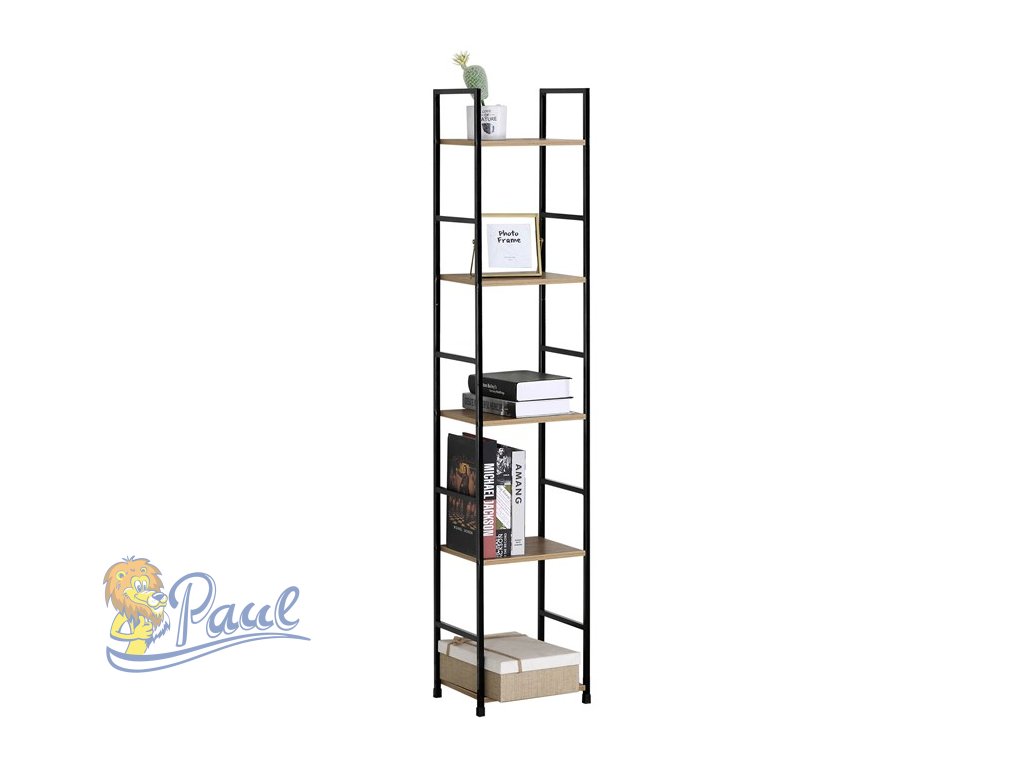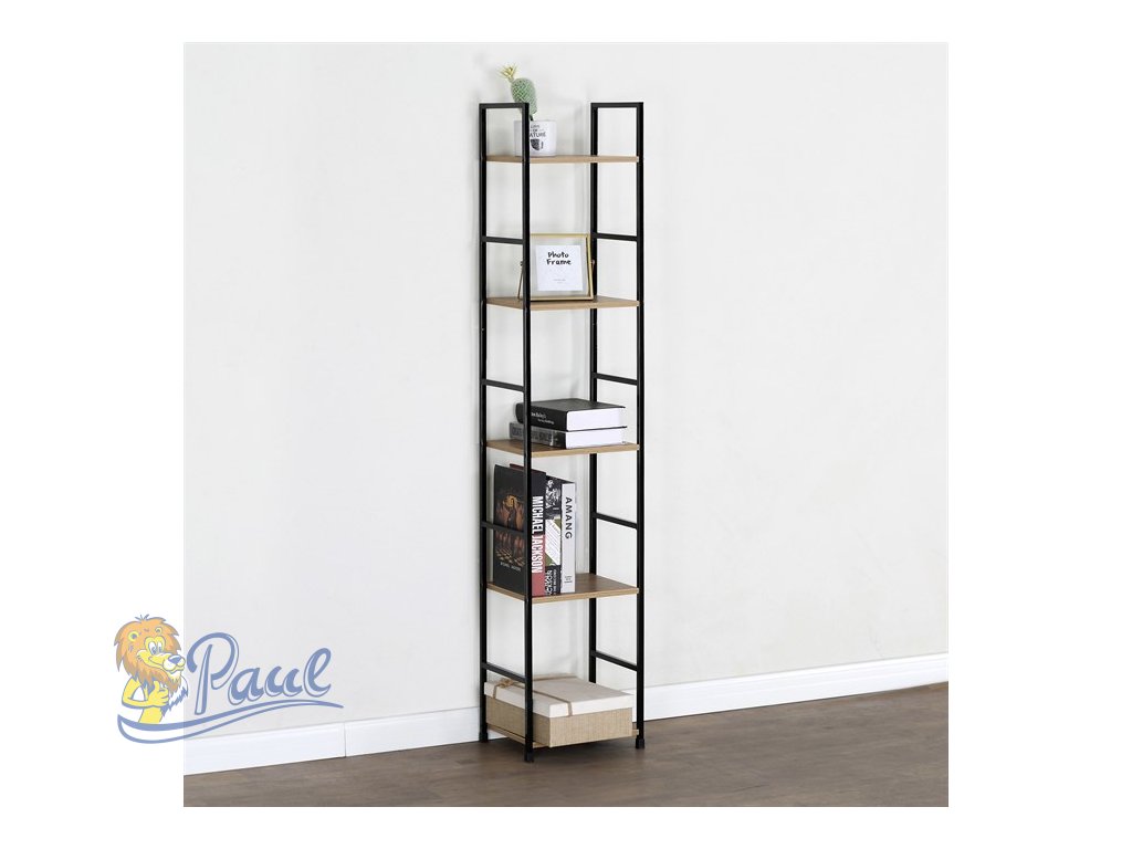 Odlehčený policový regál. Kostra vyrobena z kovových hranatých profilů černé barvy. Na police je použita MDF deska s povrchovou úpravou 3D folie v textuře dubu. Balení obsahuje sadu umožňující připevnění ke stěně.Doplňkové parametry