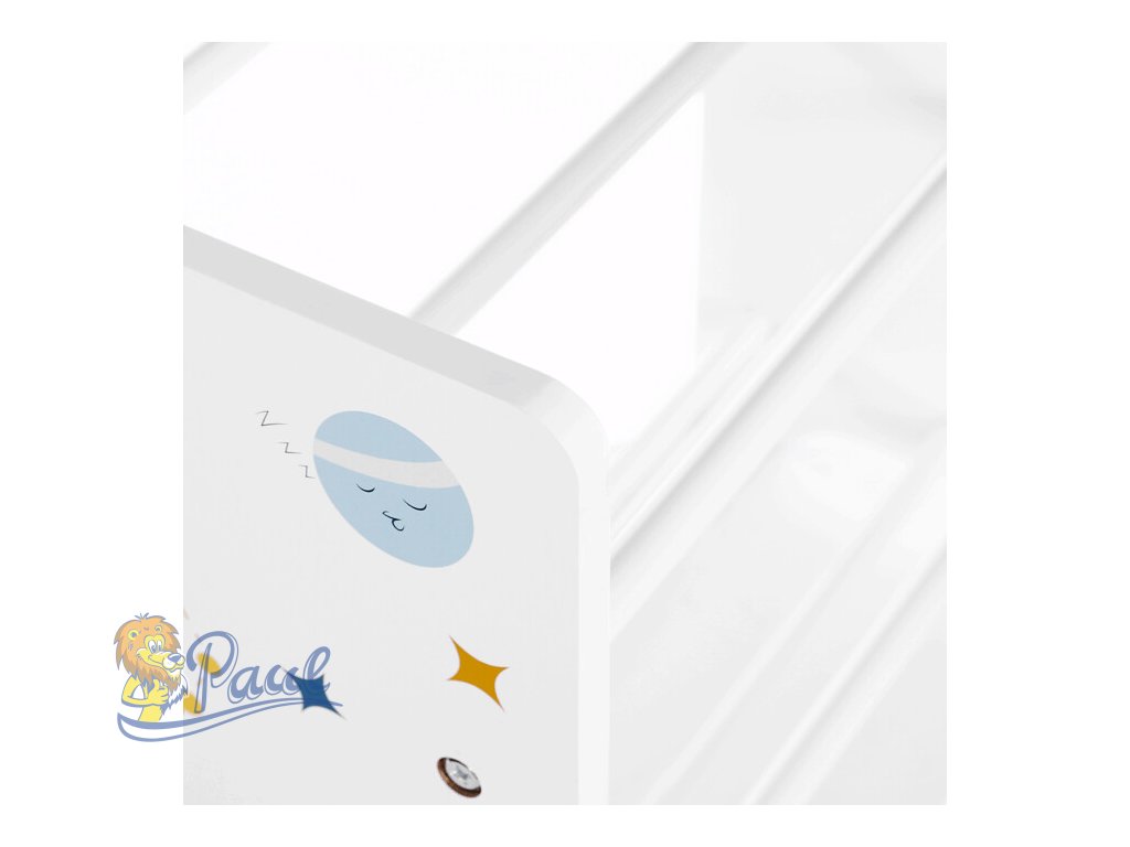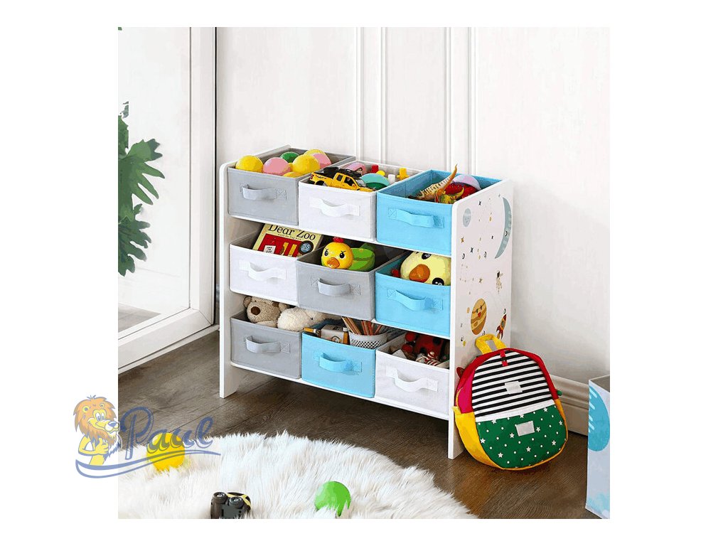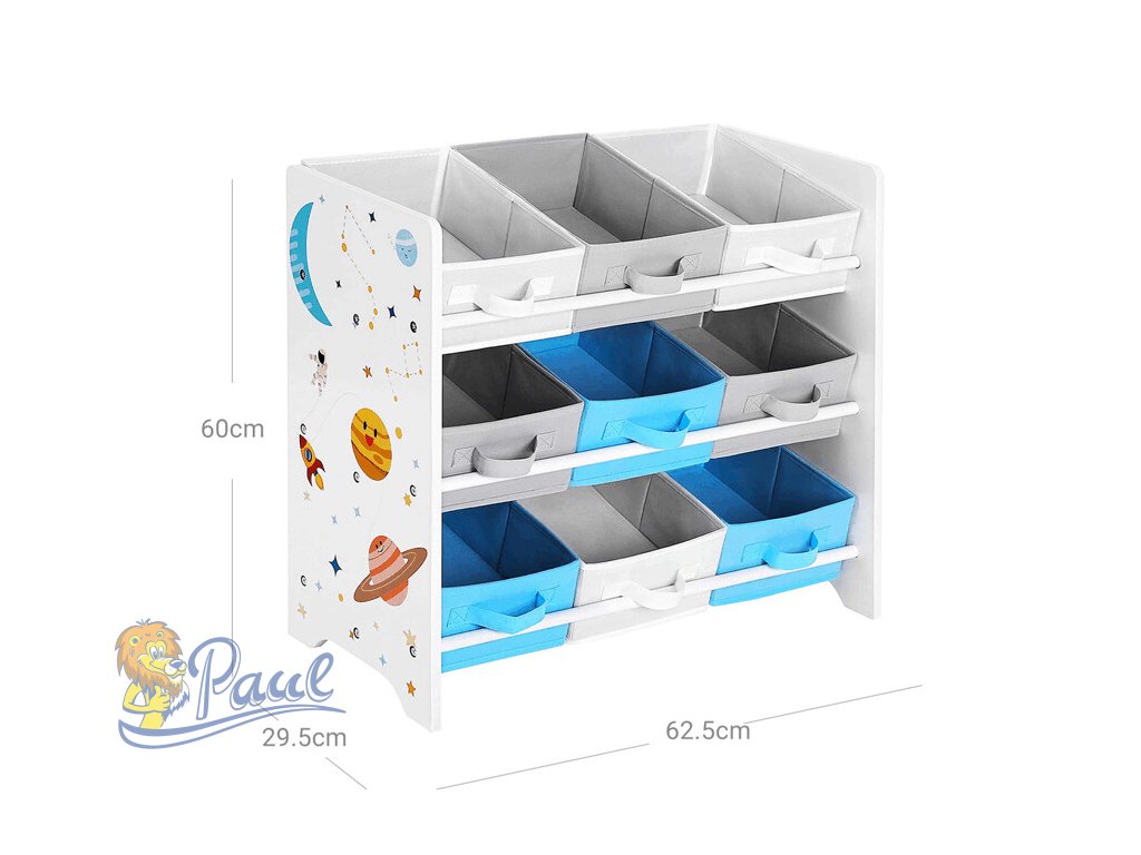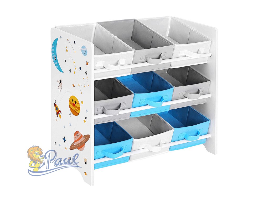 Regál na hračky s devíti látkovými boxy nabízí praktické a přehledné uspořádání dětských věcí. Bílé bočnice jsou zdobené barevným motivem vesmíru, který zaujme malé i větší děti a podpoří jejich představivost. Boxy v odstínech šedé a modré jsou snadno vyjímatelné a opatřené úchyty pro pohodlnou manipulaci. Kompaktní rozměry regálu umožňují jeho umístění do dětského pokoje či herny, kde pomůže udržet pořádek a zároveň přinese hravý designový prvek.Doplňkové parametry