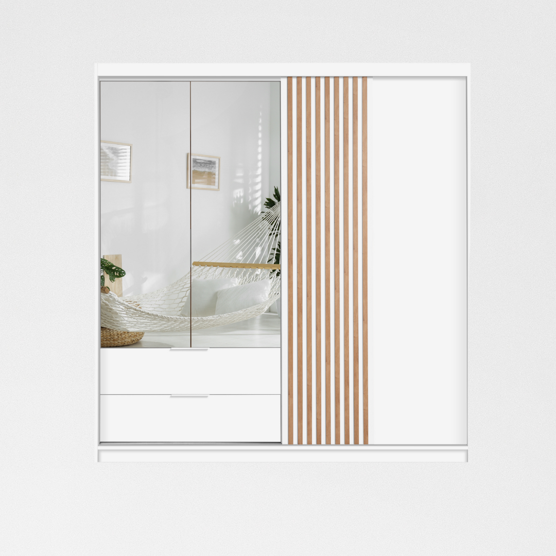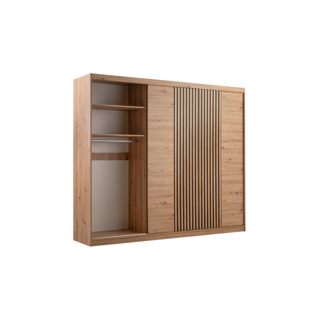 Šatní skříň Majorka je dostupná v bílé barvě nebo v odstínu dub artisan. U rozměru 203 cm a 250 cm je skříň doplněna o lamely v odstínu dob artisan.