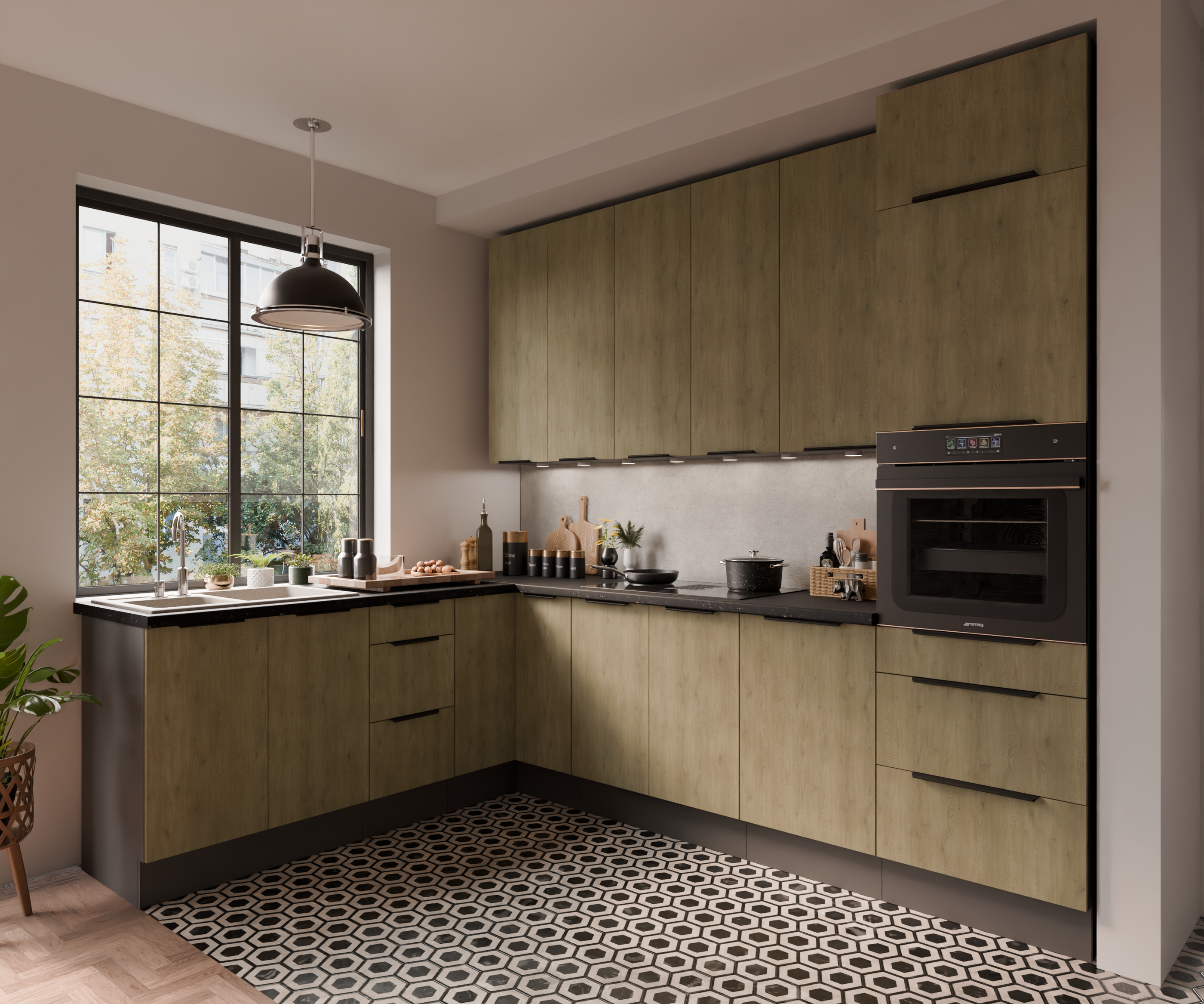 Industriální styl: Antracitové provedení skvěle ladí s přírodními dekory dřeva, betonem i kovovými doplňky.