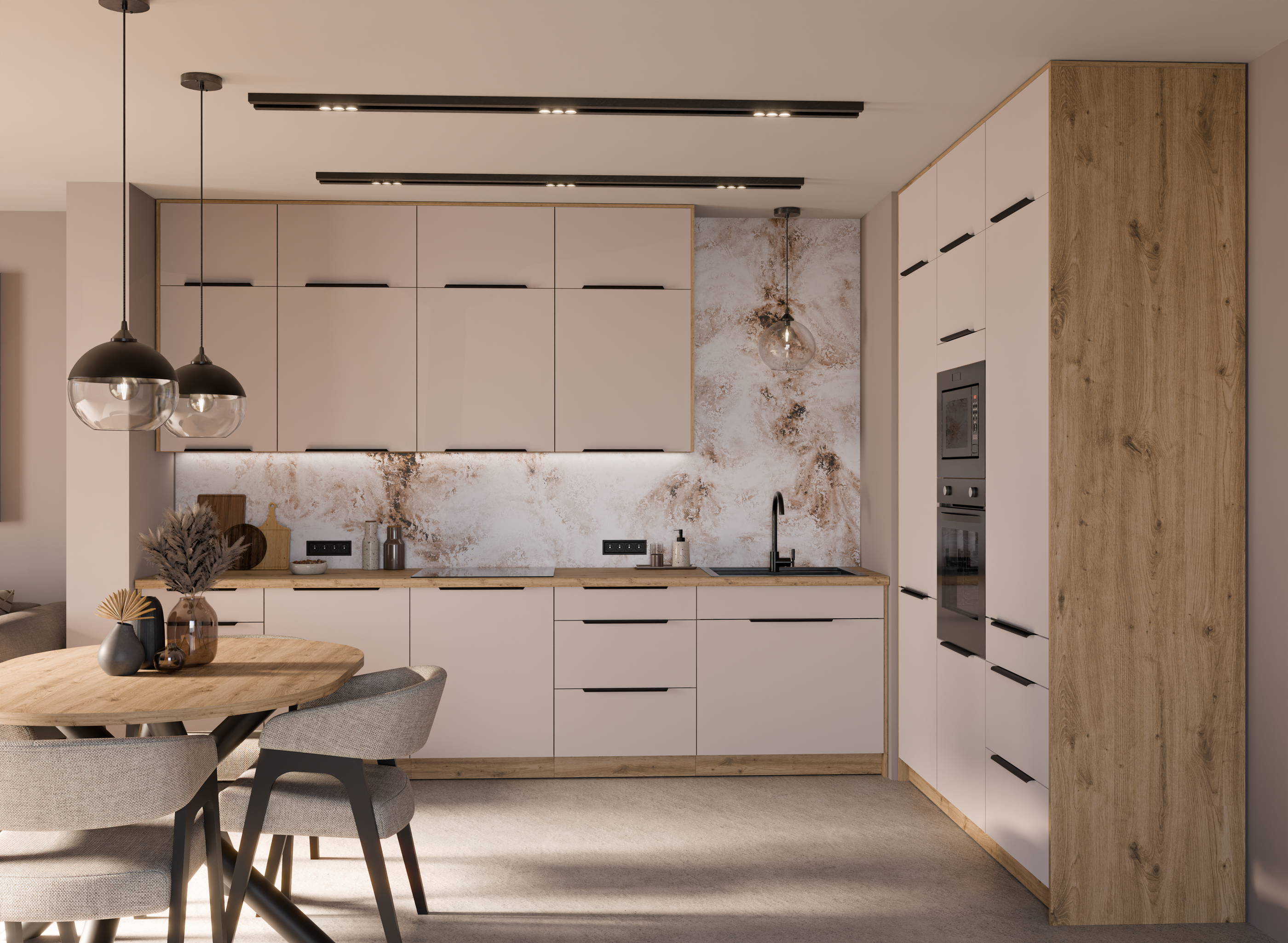 Ergonomie na prvním místě: Skříňky jsou navrženy tak, aby vám usnadnily pohyb v kuchyni a nabídly chytré úložné prostory.