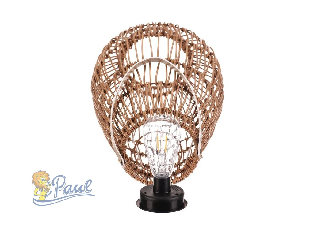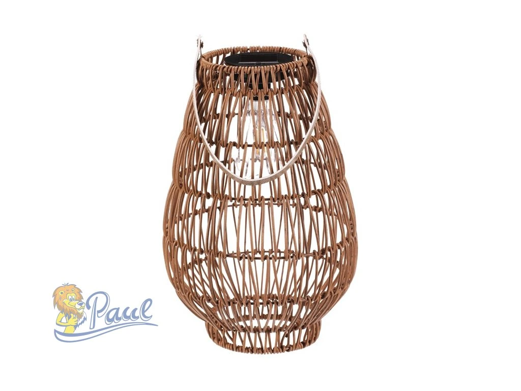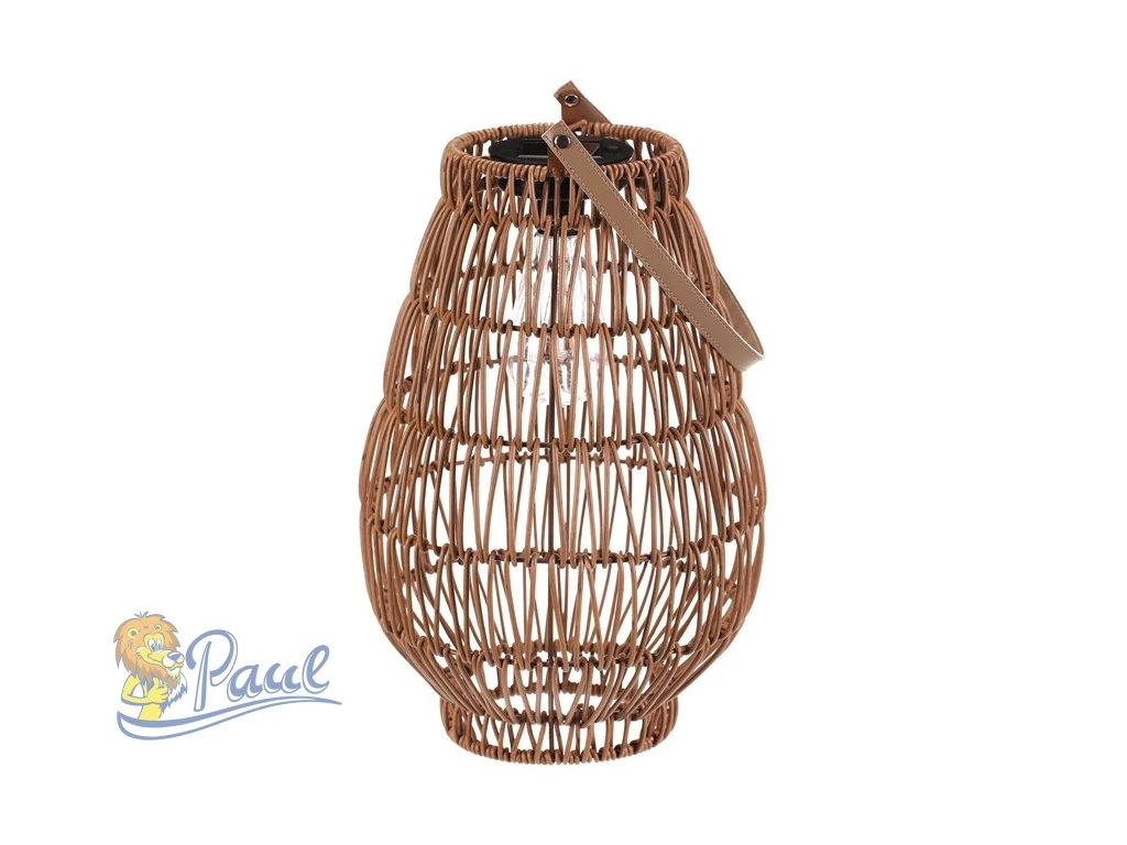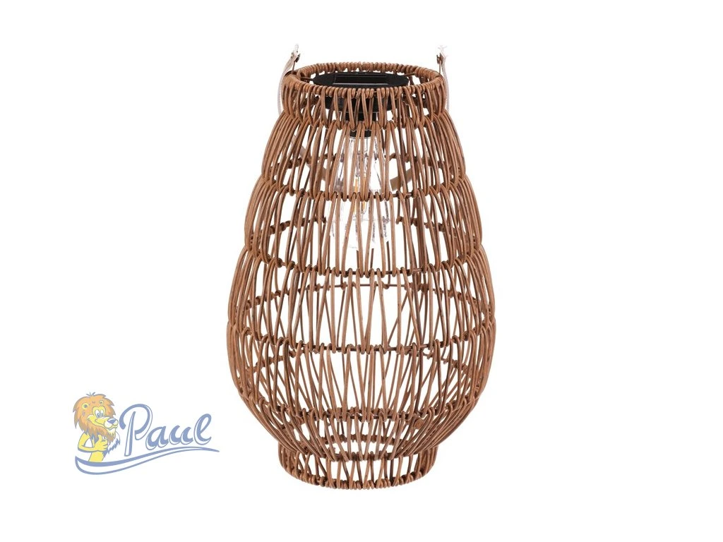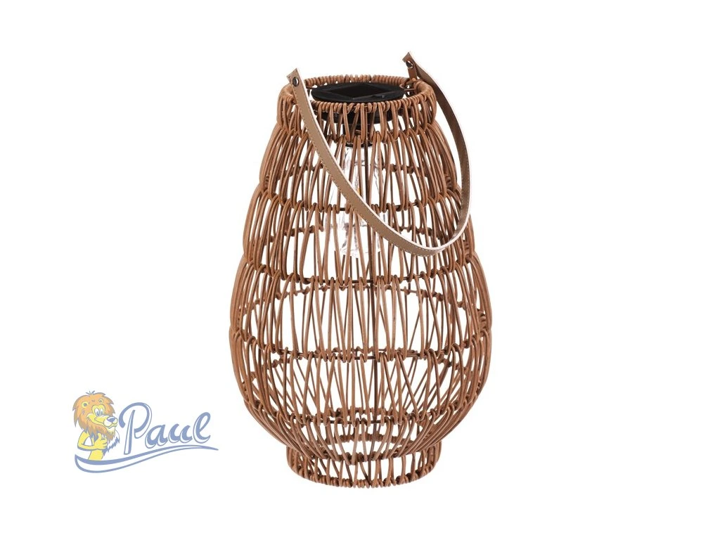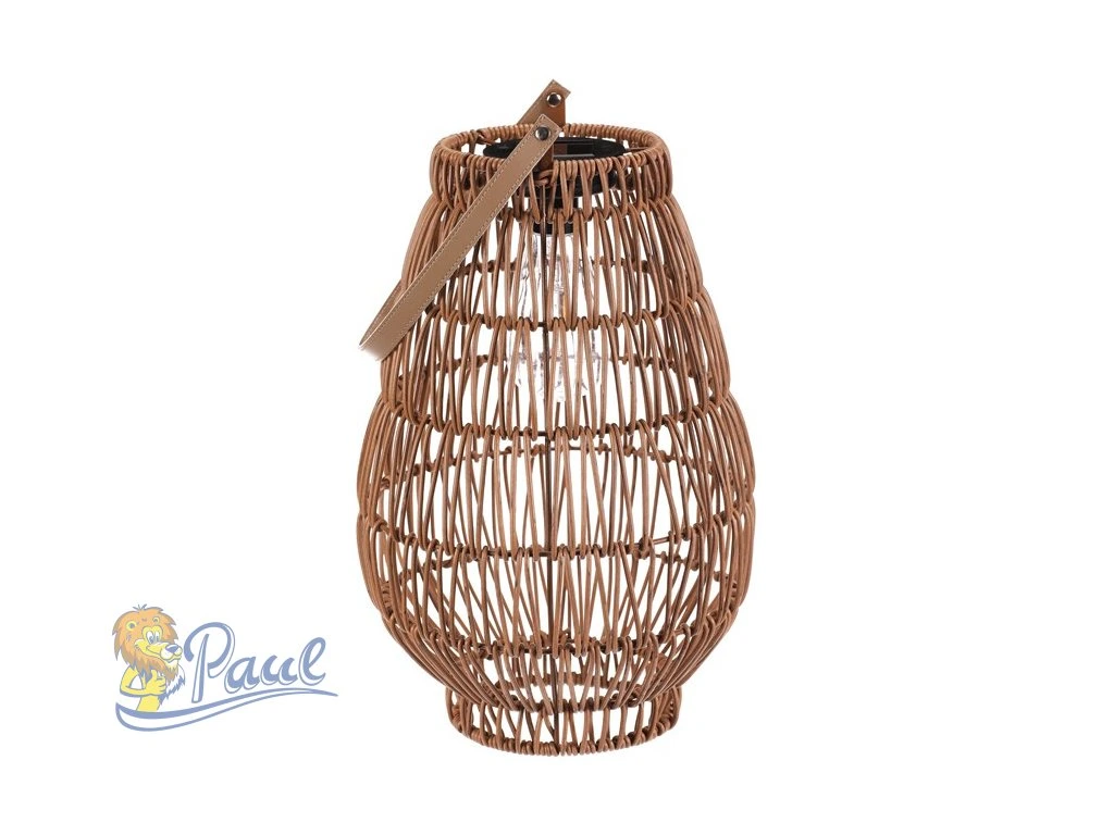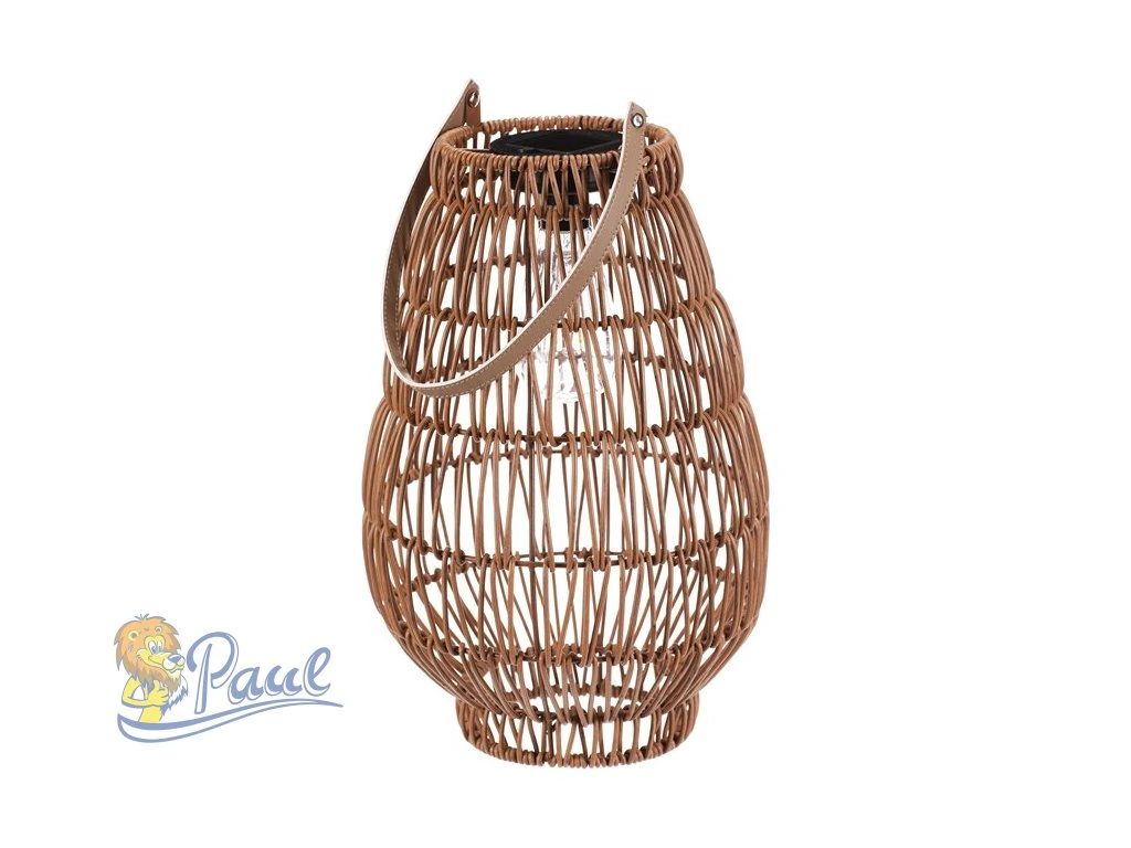 Lampión z polyratanu v příjemném světle hnědém odstínu má tvar hrušky a je vybaven LED osvětlením, které vytváří jemnou atmosféru. Provedení lampiónu je otevřené s výraznou strukturou připomínající ruční pletení, což zajišťuje zajímavý vizuální efekt světla. Praktický kožený úchyt umožňuje snadné přenášení nebo zavěšení. Velikost L poskytuje dostatek prostoru pro umístění LED zdroje uvnitř. Lampión je vhodný pro dekorativní osvětlení interiérů i venkovních prostor. LED osvětlení je napájeno 1 x AA dobíjecí baterií a zároveň solárním panelem umístěným na horní hraně.Doplňkové parametry