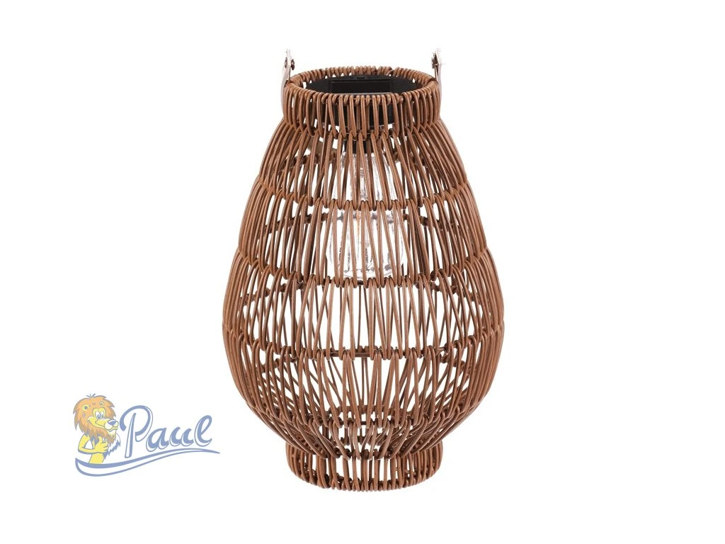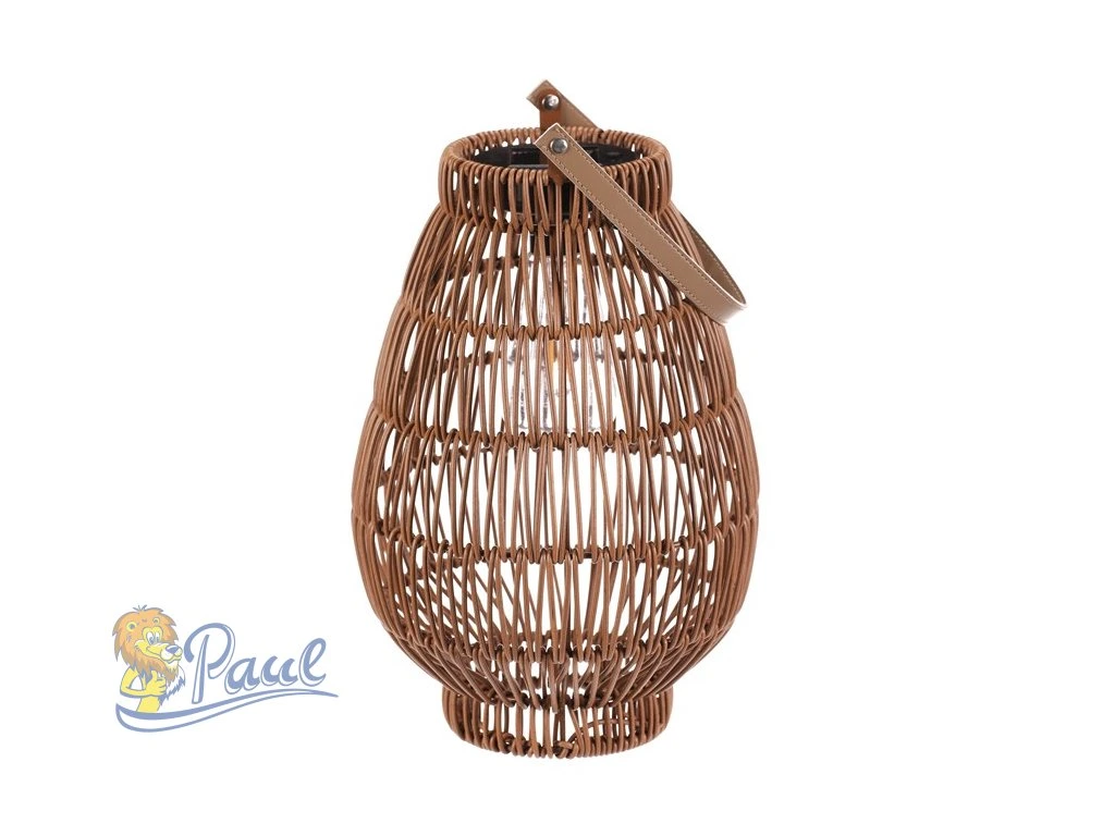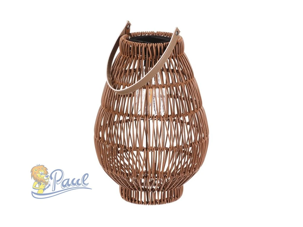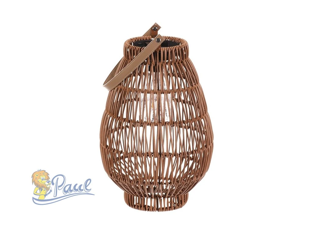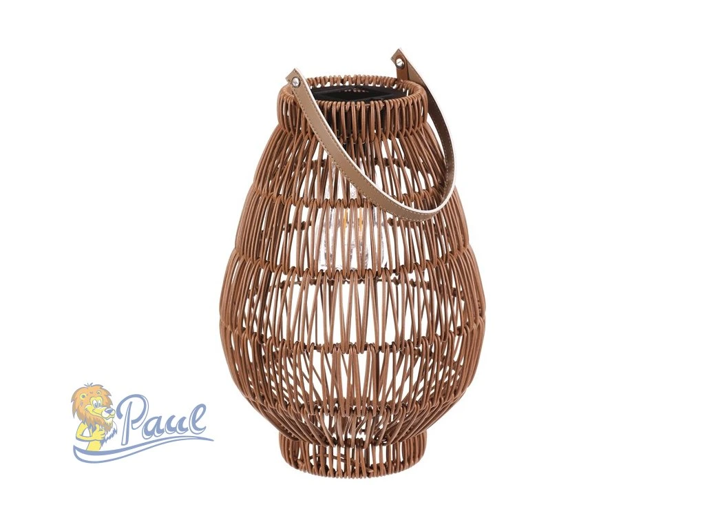 Lampión z polyratanu v tvaru hrušky vyniká světle hnědým provedením, které přináší příjemnou přírodní atmosféru. Osvětlení zajišťuje integrovaná LED technologie napájená solárním panelem, což umožňuje bezdrátový provoz a snadné umístění kdekoliv. Praktické madlo usnadňuje přenášení nebo zavěšení lampiónu. Díky otevřené struktuře polyratanového těla světlo vytváří zajímavý vizuální efekt a prostor příjemně zútulní. Velikost M je vhodná pro použití na terase, balkóně nebo v interiéru jako dekorativní prvek. LED osvětlení je napájeno 1 x AA dobíjecí baterií a zároveň solárním panelem umístěným na horní hraně.Doplňkové parametry